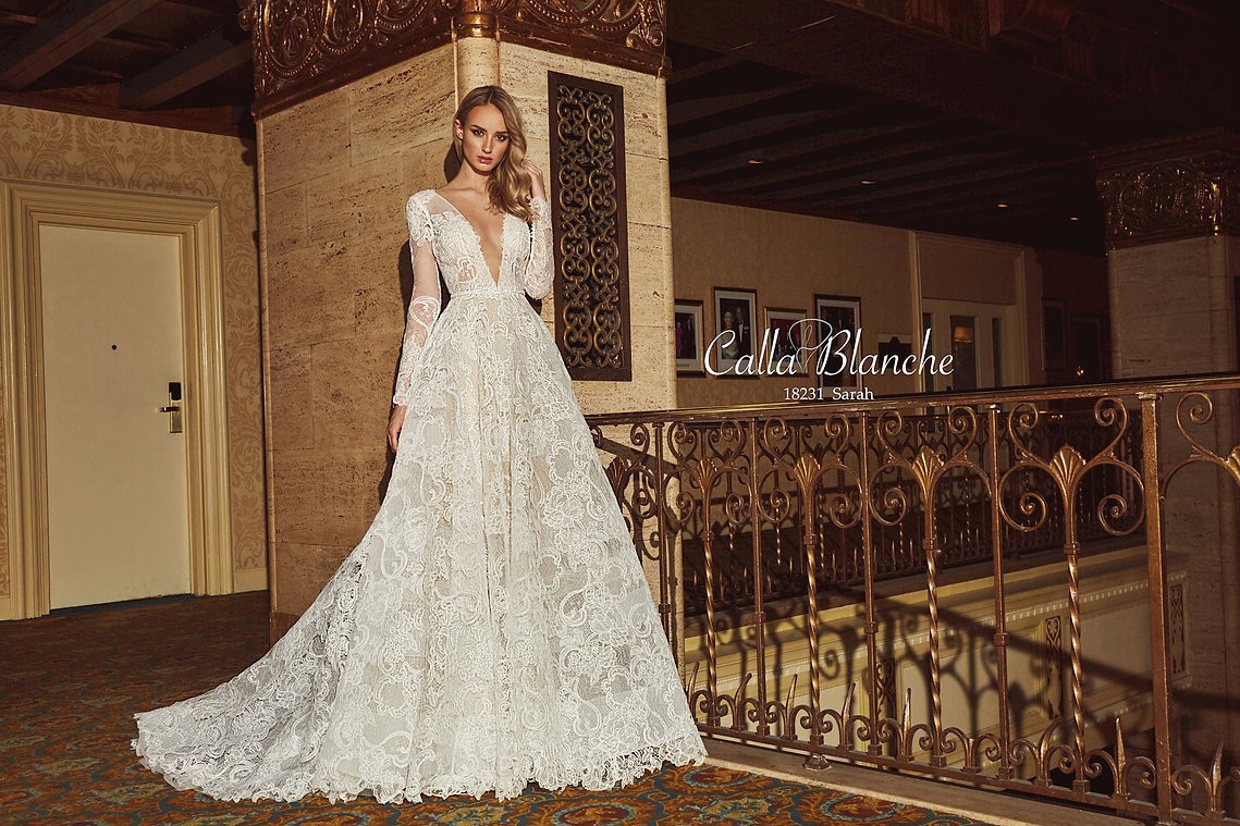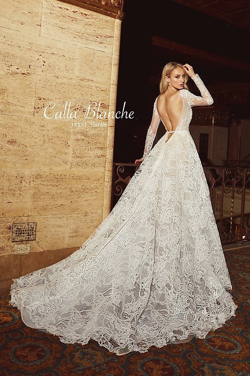 Sarah by Calla Blanche Bridal is a magnificent bridal gown, decorated with elegant lace and a tulle coverage and finished in an a-line finish, for an opulent finish.