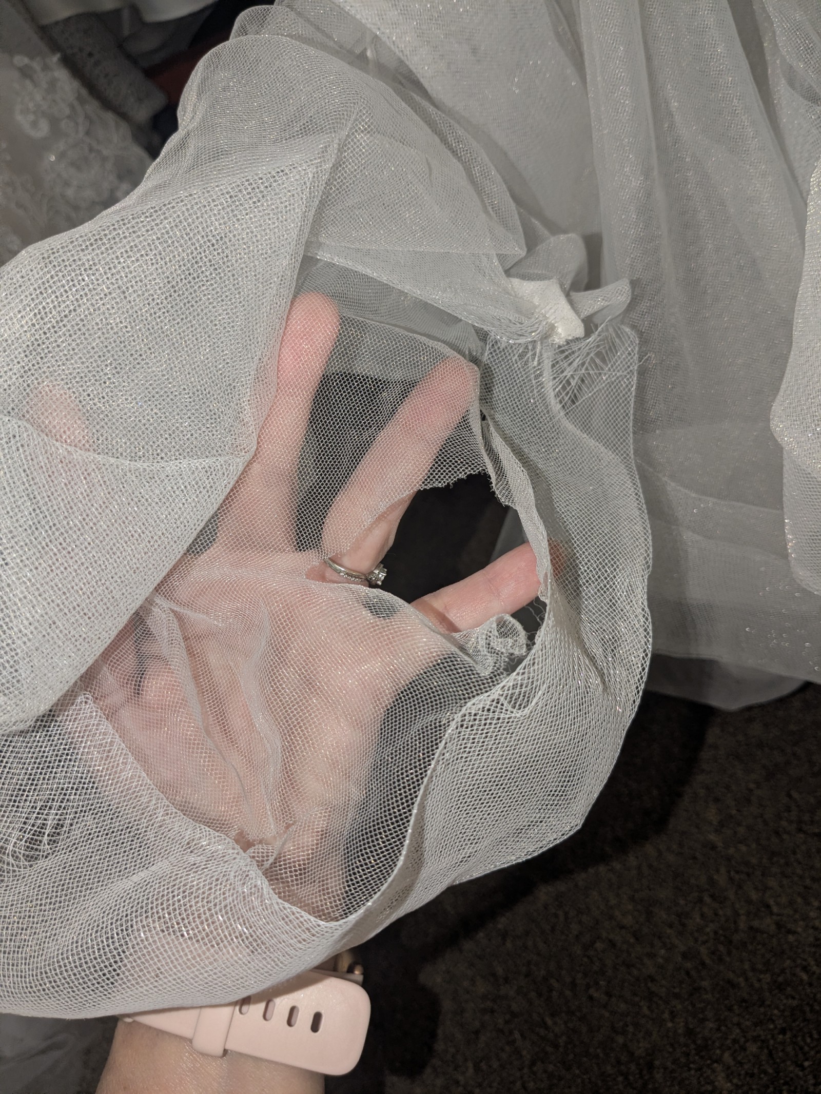 - so there is dirt underneath the train, There are a few inconsistencies that are very minor on the horsehair trim and then the side of the dress I found at the very bottom of the train hole, but there are so many layers to this dress