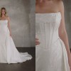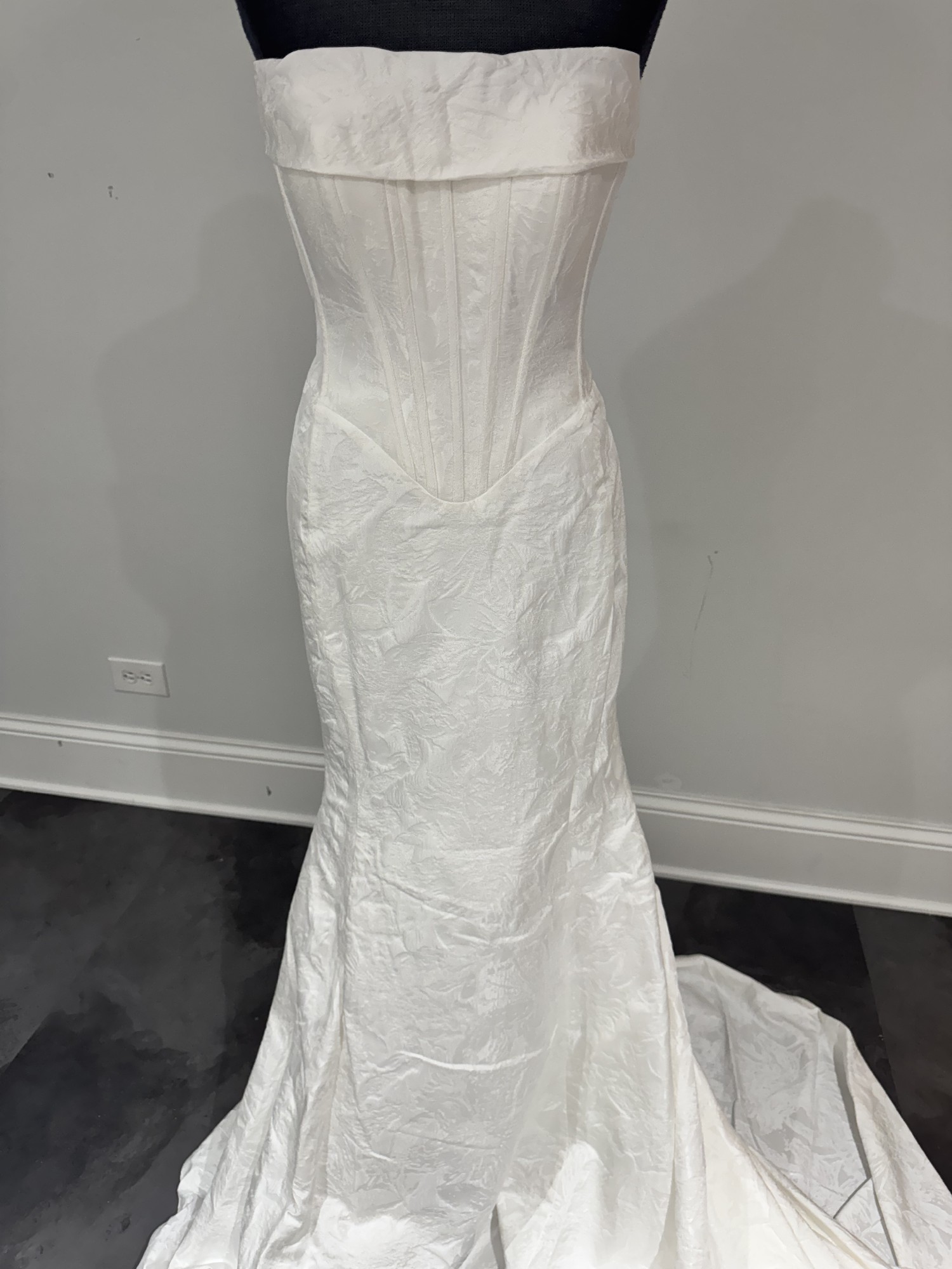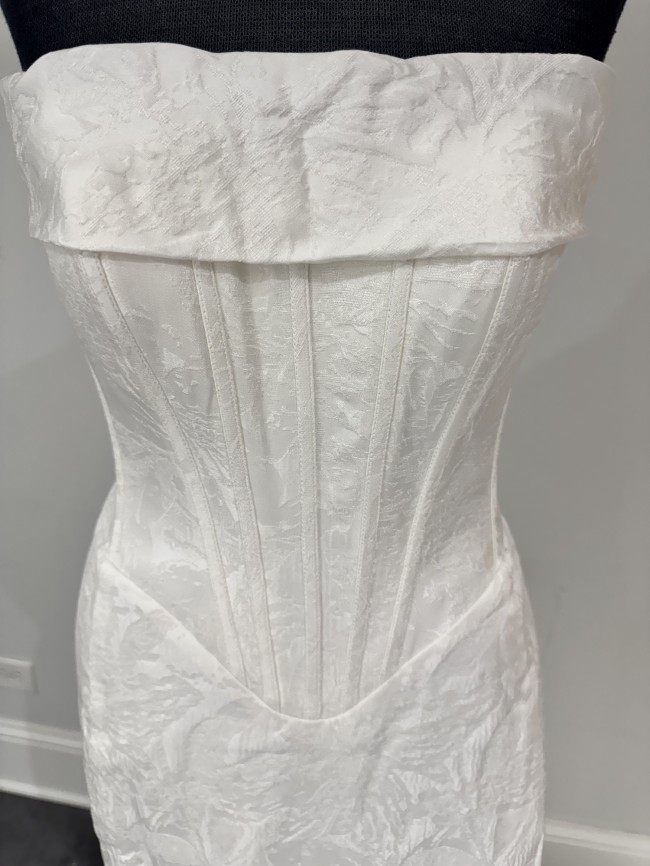 Sophisticated, modern and oh-so-glamorous, this luxe strapless fit-and-flare wedding dress showcases a clean, contemporary silhouette available in textured satin jacquard. Style D4149 features a straight-across strapless neckline, introducing a fully-lined bodice exquisitely tailored to reveal architectural corset boning that leads to a timeless basque waist. This modern wedding gown’s silhouette hugs the figure through the hips with sexy contour seamwork before flaring into a dazzling trumpet skirt.