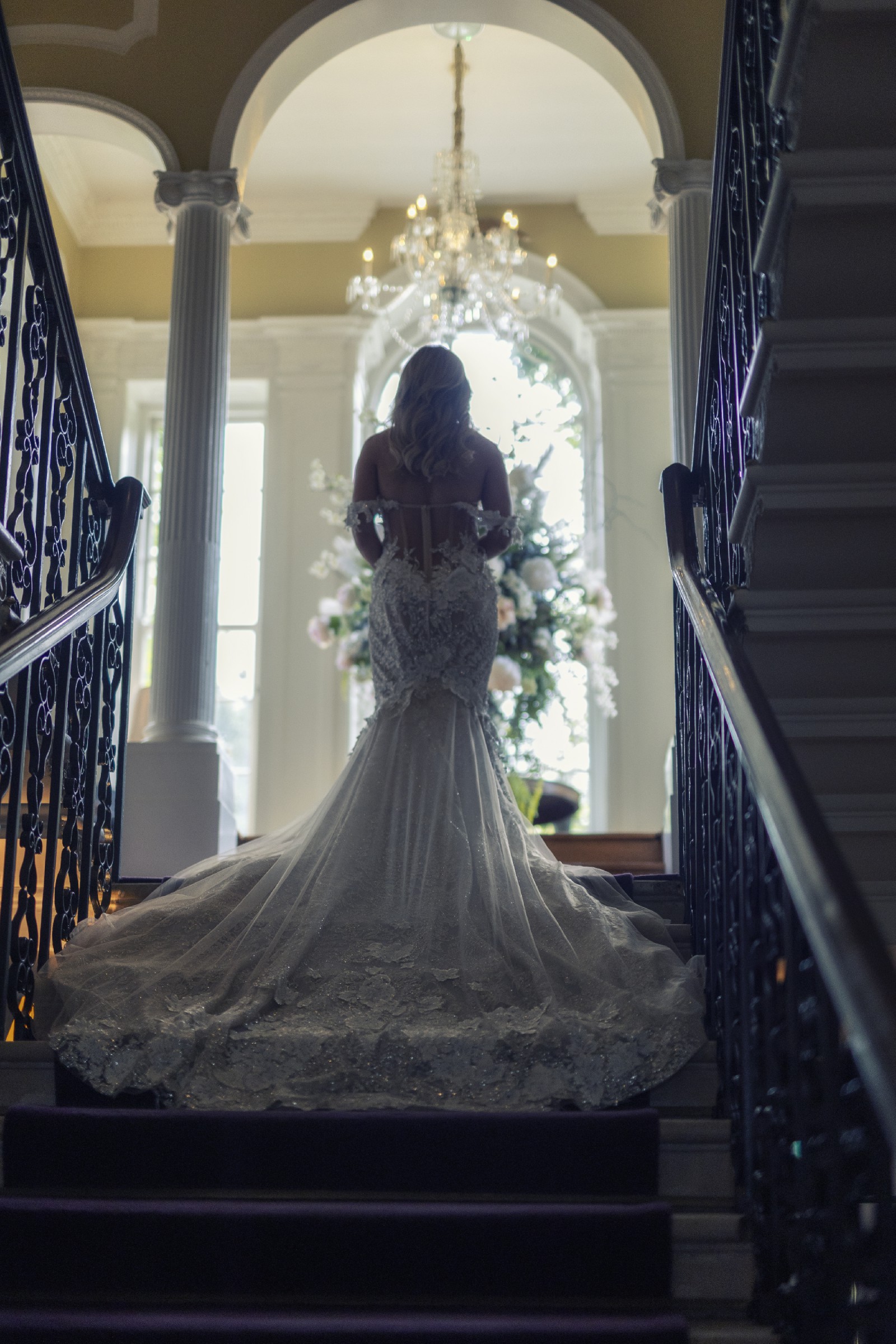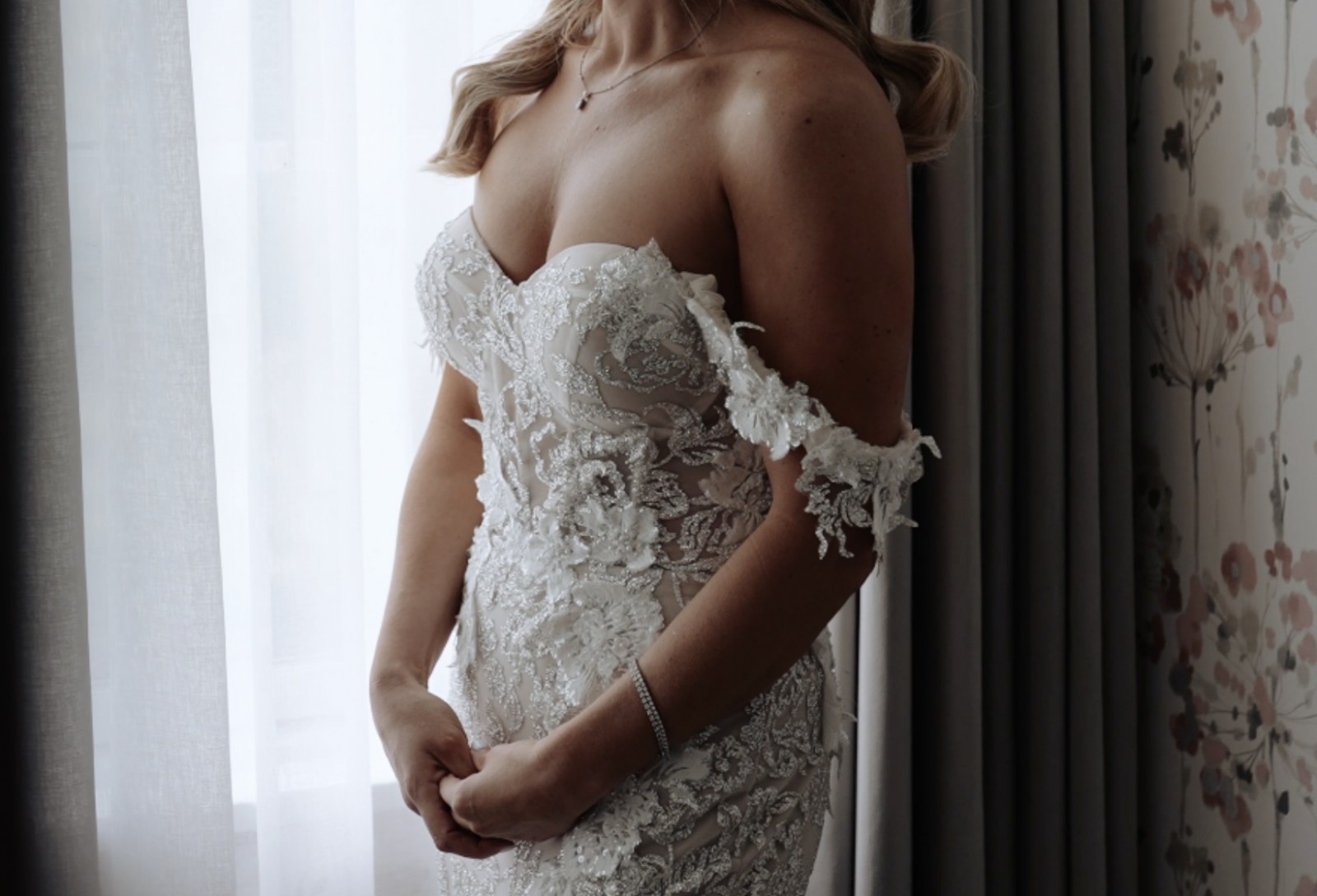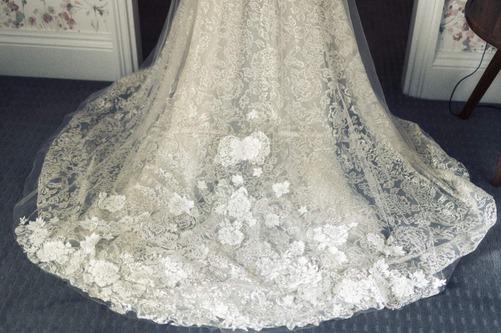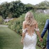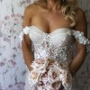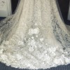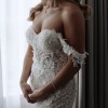Handcrafted lace fabric embellished with sparkling stones, intricate embroidery, and appliqué detailing throughout. This luxurious, heavyweight material is crease-resistant. The design features a backless silhouette with corset detailing and includes attached underwear. The straps may be worn over the shoulders if desired. Front hem alteration only.