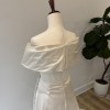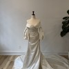 The A-line silhouette cascades gracefully to the floor, providing both comfort and movement, perfect for dancing the night away. One of my favorite features is the high slit, which adds a modern twist to the classic design, allowing for a little playful peek of leg. The detachable sleeves offer versatility, letting you create two distinct looks: one with romantic floating sleeves for the ceremony and another bare-shouldered for a sultrier vibe during the reception.
