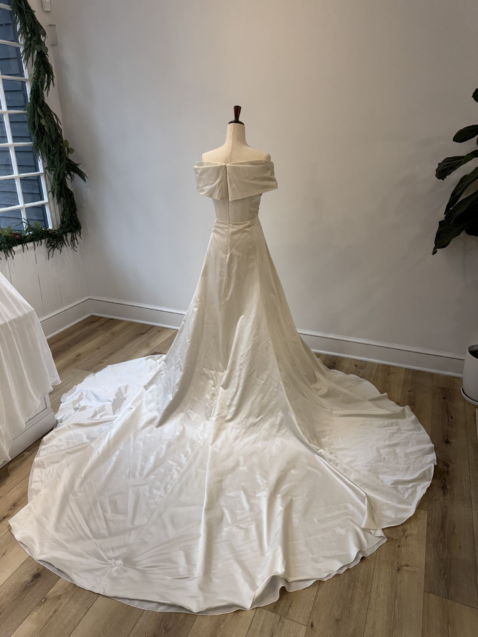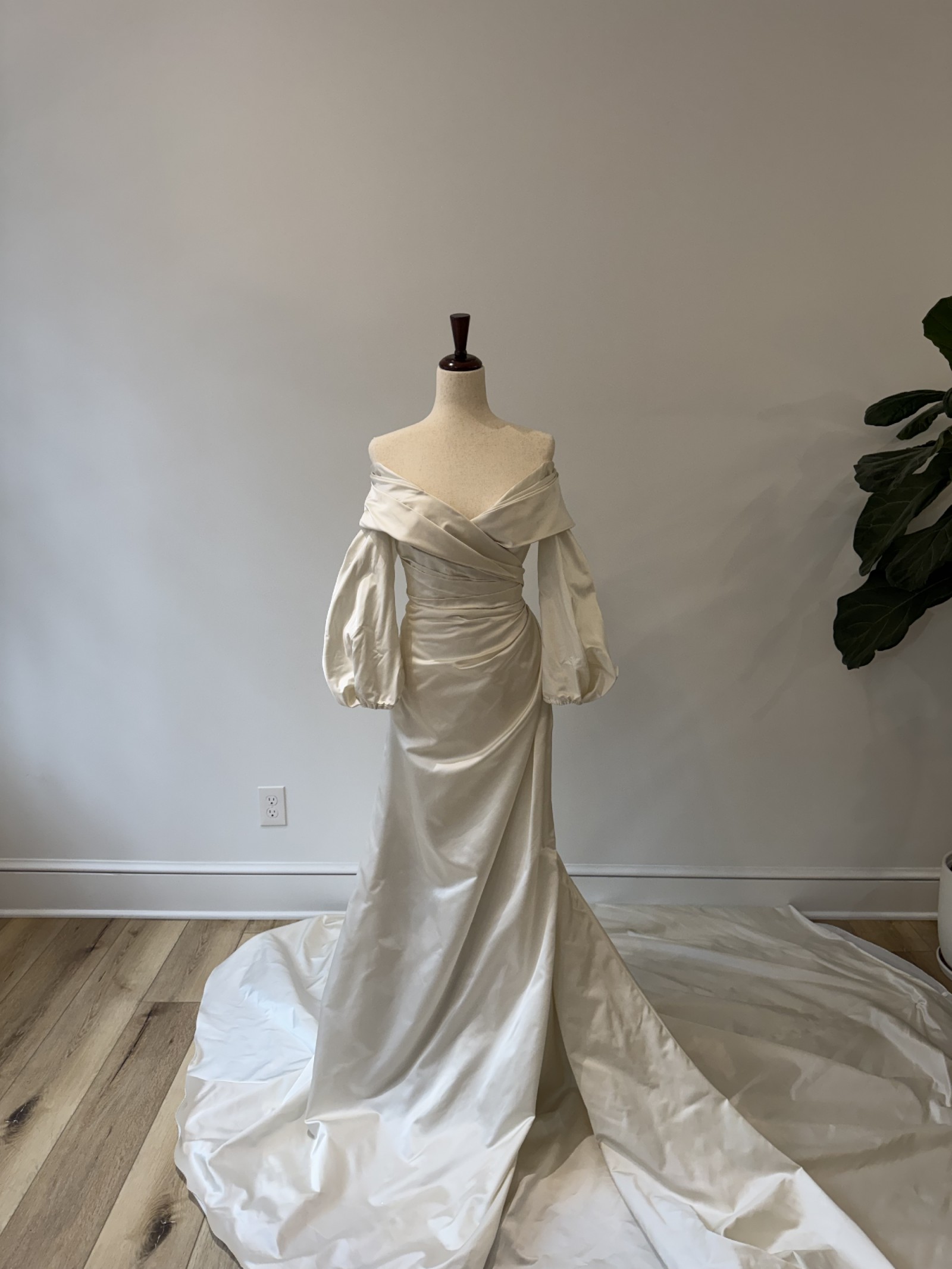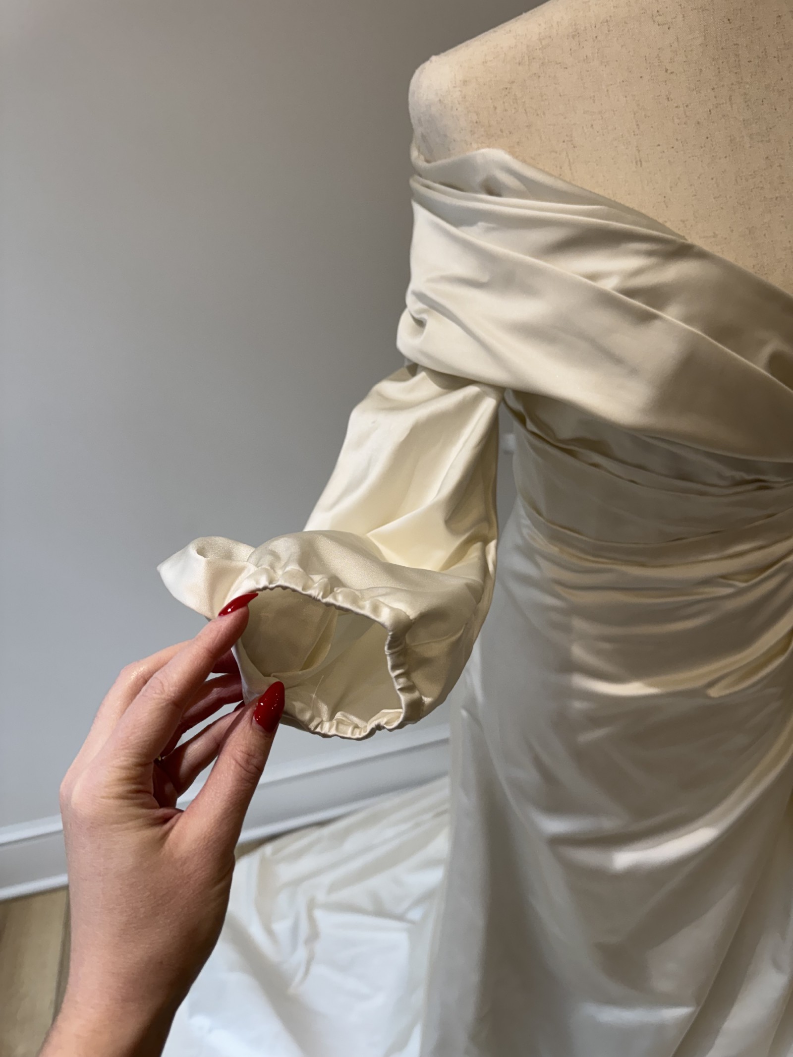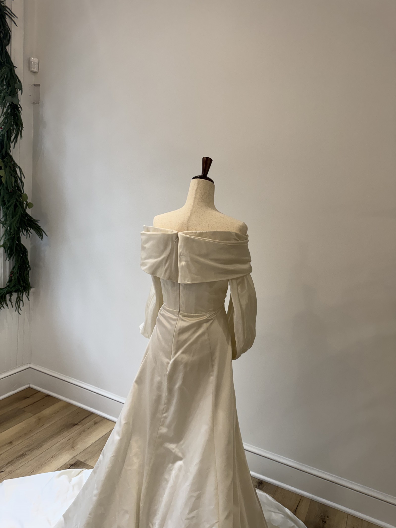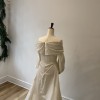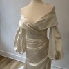 This stunning Selene wedding dress by Katherine Tash is the epitome of elegance and romance. The off-the-shoulder neckline beautifully frames the collarbone, while the long sleeves add a touch of sophistication and drama.