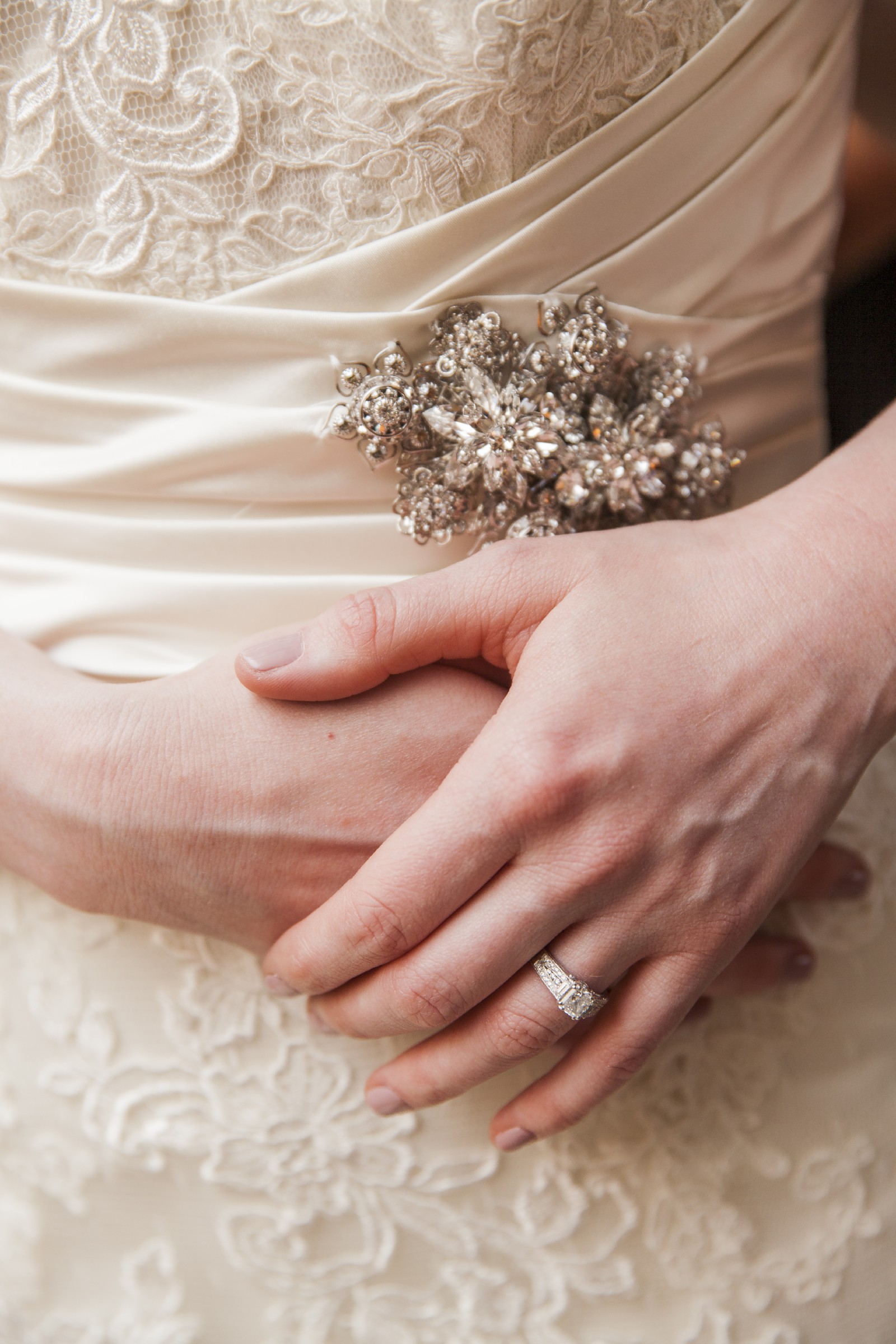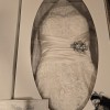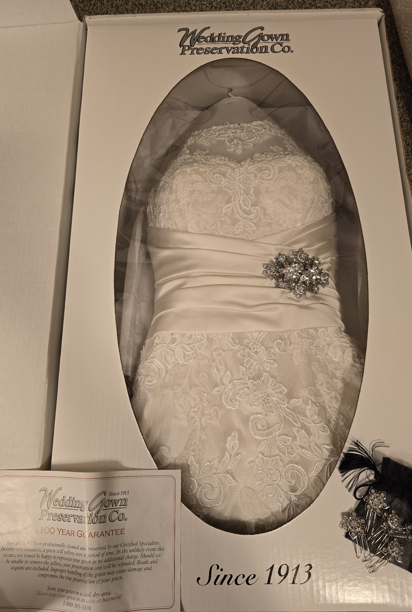 Justin Alexander's Lace Trumpet Wedding Dress with Sabrina Neckline showcases sheer Venice Lace with a boat-neckline, accentuating this sweetheart trumpet wedding dress. Featuring a pleated regal satin cummerbund at the waist. Additionally, I added a crystal brooch to the cummerbund with matching crystal hairpins. The crystal brooch can be removed by a tailor. The color is Ivory/Alabaster and is professionally cleaned and preserved by Wedding Gown Preservation Company. The only two alterations that have been made to this dress are the hem to fit my 5'1 frame and adding bust cups. The dress will be shipped in its preservation box. Crystal hairpins and brooch included.