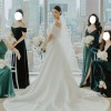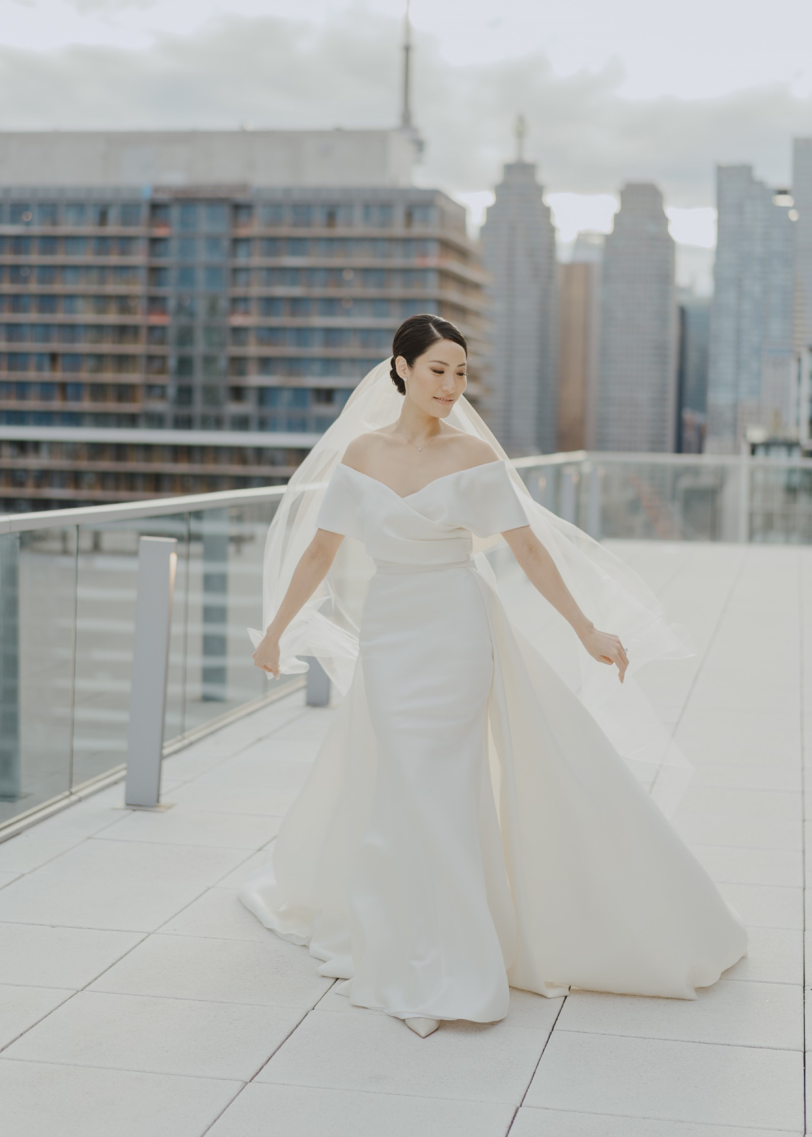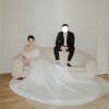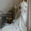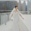 Includes an attached overskirt with a 90” cathedral train for a dramatic ceremony entrance, easily removed for a streamlined reception look.