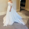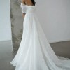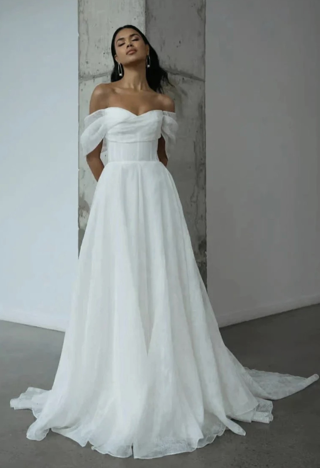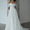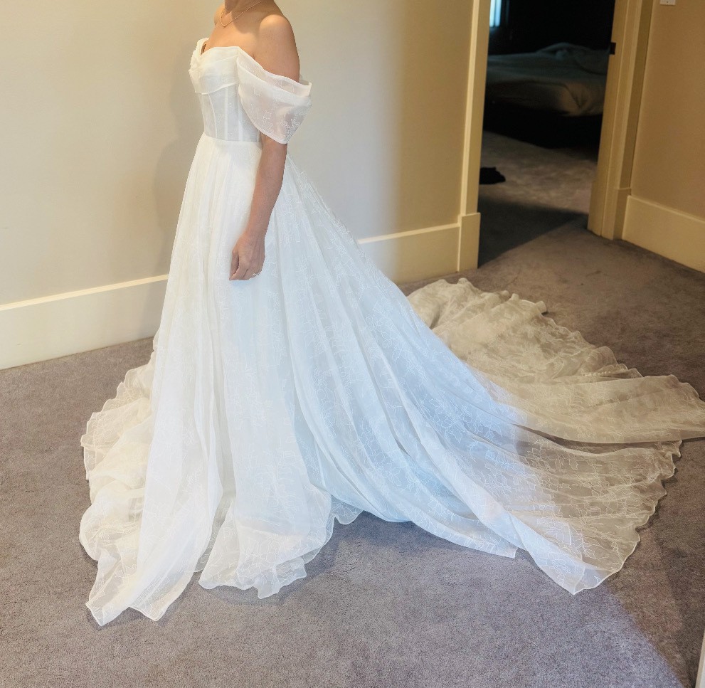 The Jenny Yoo Hazel Gillian dress is a romantic ball gown made from delicate, printed silk organza, featuring a draped sweetheart neckline, elegant pleated off-the-shoulder sleeves, and a full, flowing circle-cut skirt for a dramatic, ethereal look, embodying soft femininity with subtle detail.