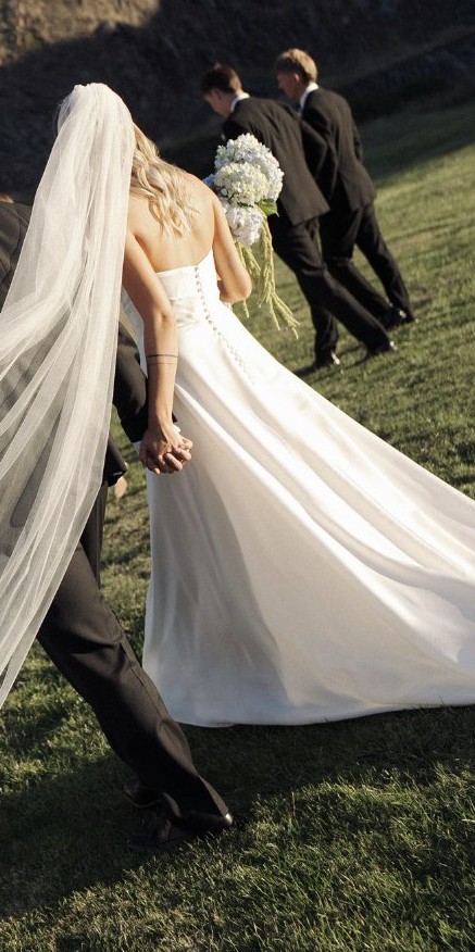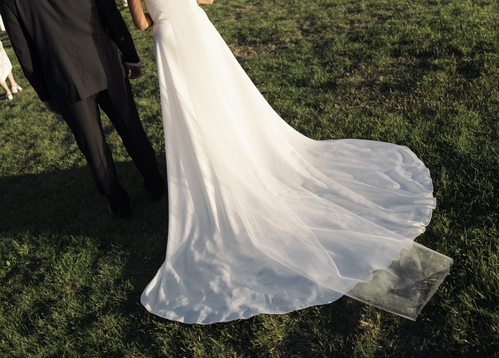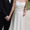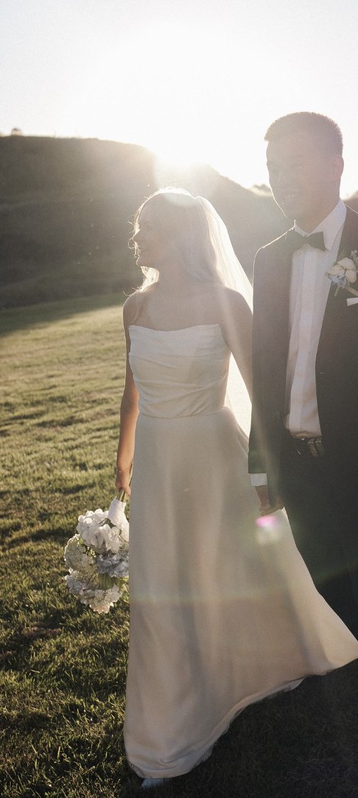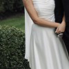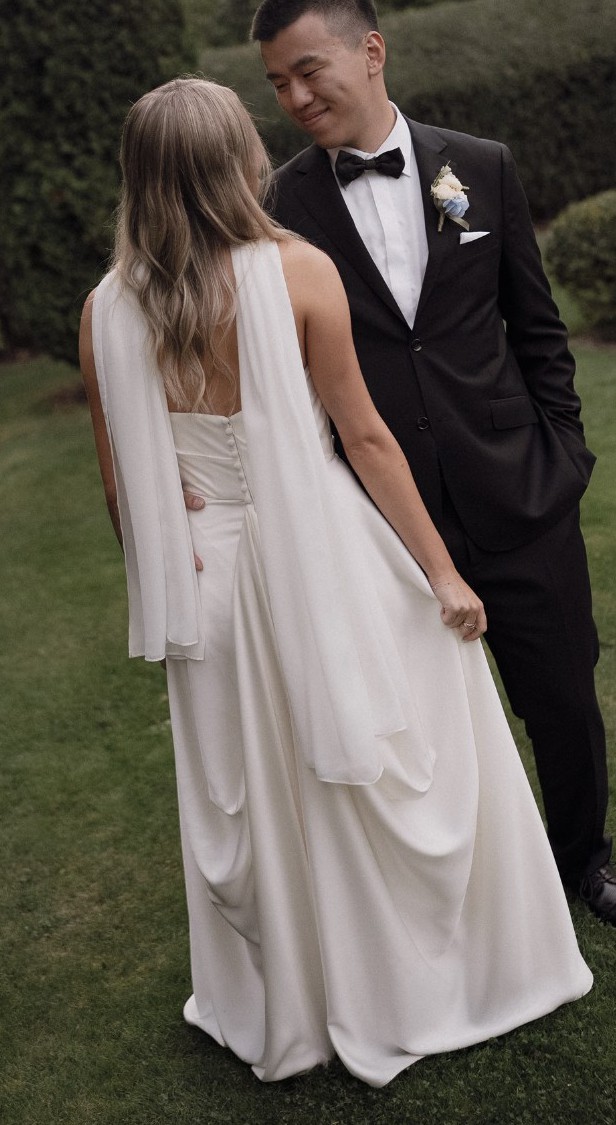 Gown is from Brides of Merivale. The dress has a softly draped bodice and a flattering A-line silhouette, and a beautiful train. The fabric is 100% silk, lightweight and flows really nicely, making it very comfortable and easy to move in. Style name: Isla (one-off design, not available online) Can be hooked on the back for after the cermony, and also has a wee string you can hold when walking around. Ivory colour.