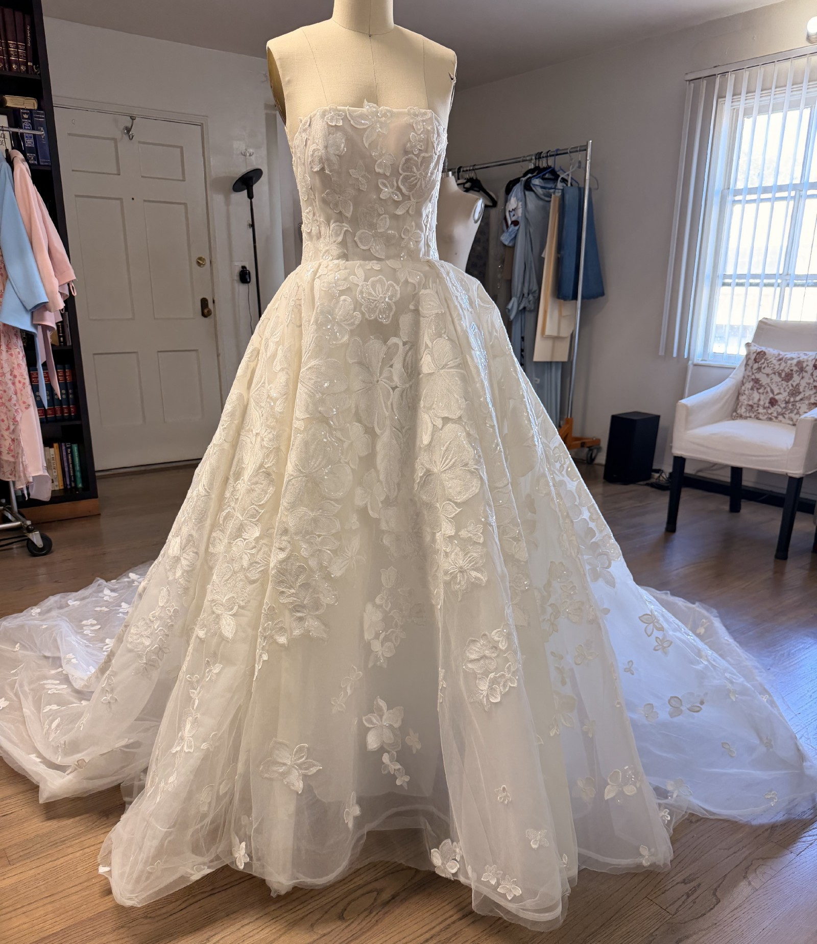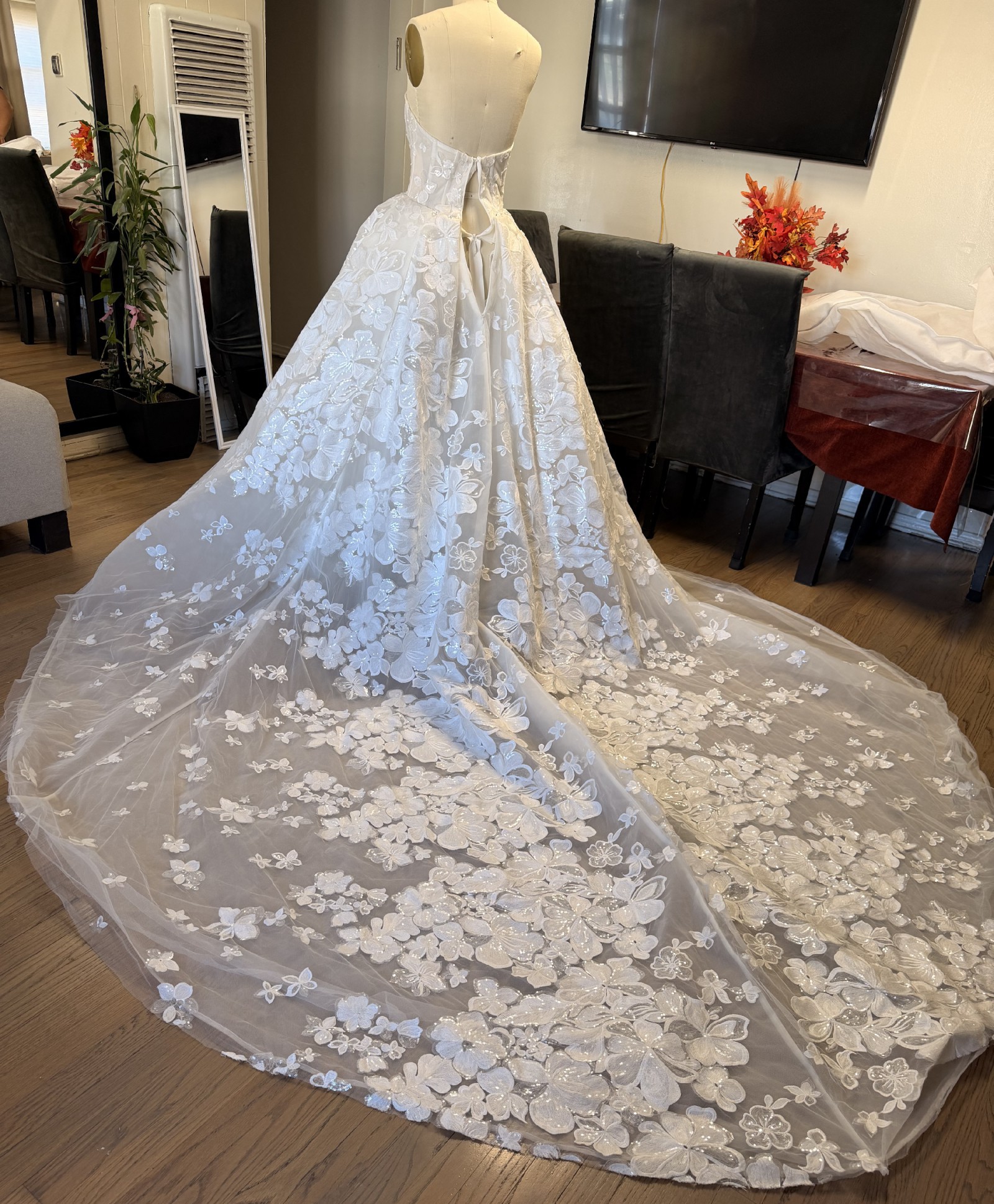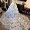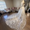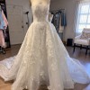 Galia Lahav ballgown with flower sequin appliqués and matching galia lahav cathedral veil. beautiful long train with bustle attachment included. Same fabric and style as the Renee gown but its not see through and has a straight neckline.