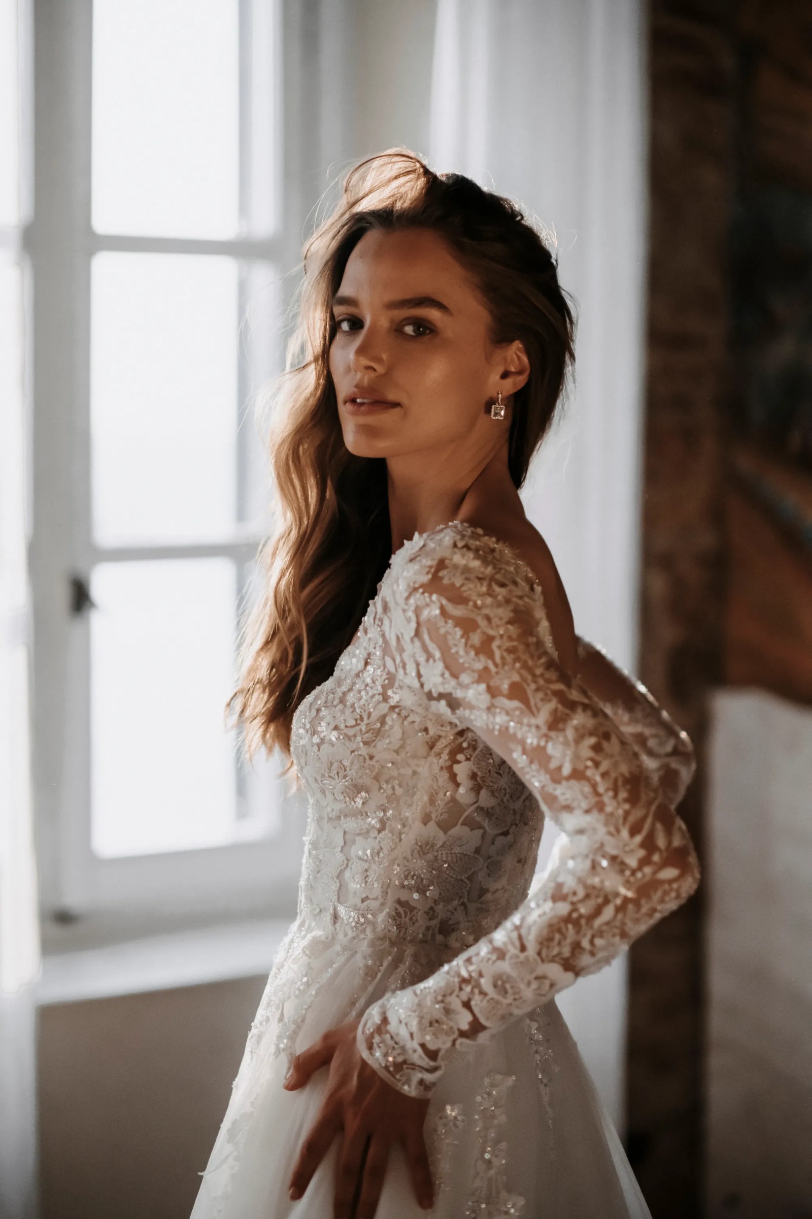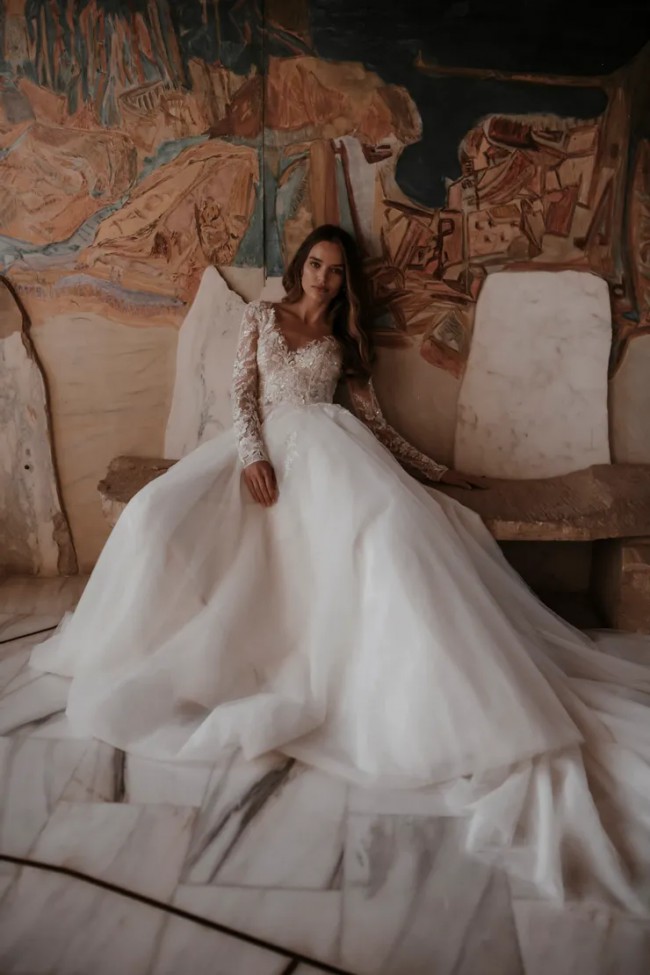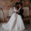 This elegant A-Line wedding dress has a breathtaking V-neck design that gracefully highlights the collarbone while offering a flattering silhouette. The long sleeves add a touch of sophistication and comfort, perfect for a fall or winter wedding. I fell in love with this dress the moment I tried it on, and I can't imagine walking down the aisle in anything else.