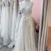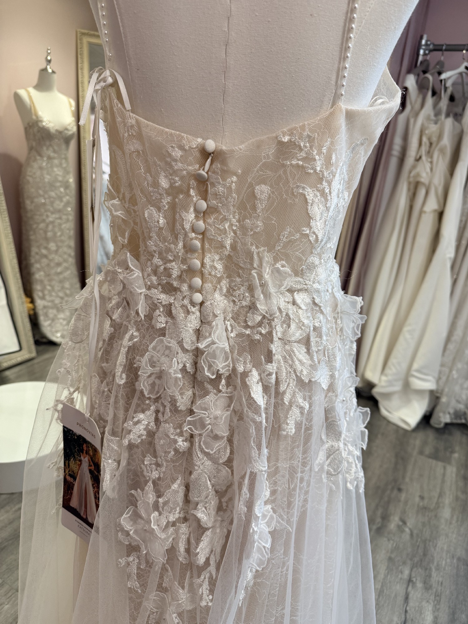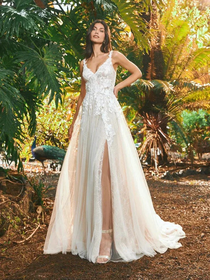 This stunning Pronovias Katsura dress has been the centerpiece of my most unforgettable day. Crafted with the utmost attention to detail, this A-Line gown features a flattering V-Neckline that accentuates the décolletage while maintaining an air of elegance, complemented by delicate spaghetti straps that add a touch of femininity.