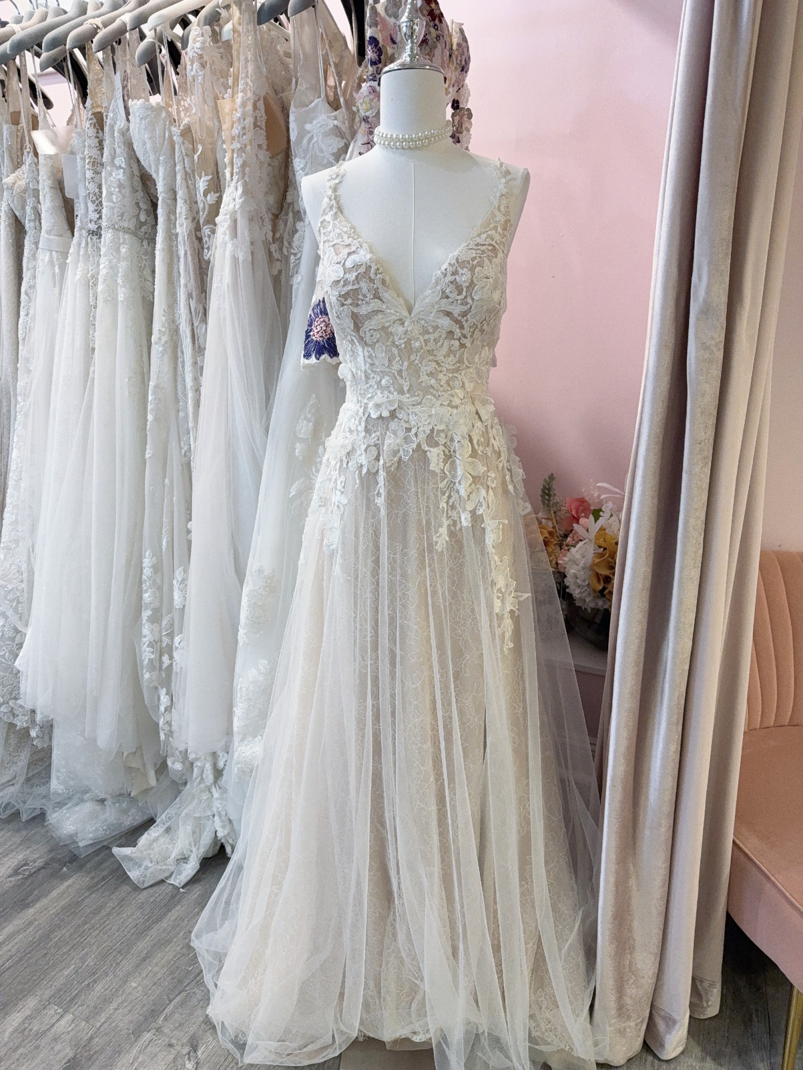 Worn once, this dress is a size 14 and flows gracefully to floor length, perfect for any bride looking to make a statement. Whether you're saying "I do" in an intimate garden or a grand ballroom, this dress will make you feel like a vision of paradise. I hope to pass it on to someone who will love it just as much as I did.