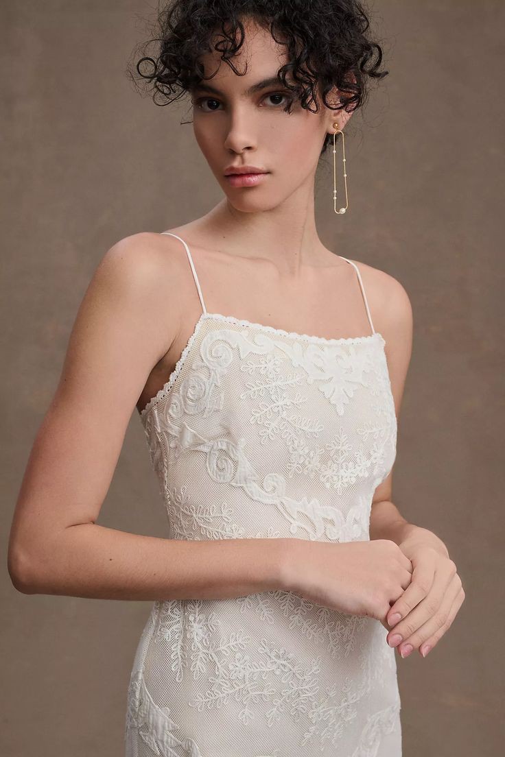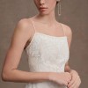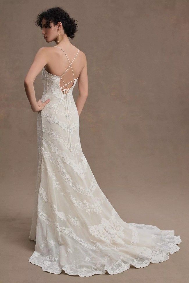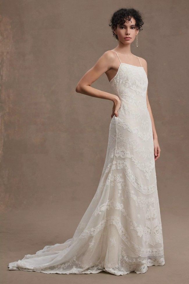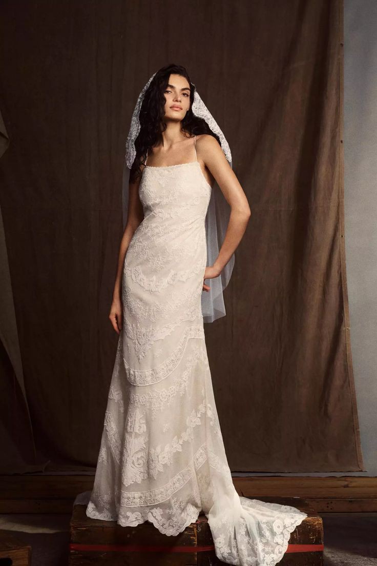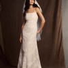 Intricate applique detailing adorns the silhouette of this enchanting gown. The straight neckline, lace-up back, and allover lace that sweeps down onto the court-length train combine for a gown that's fit for a fairytale wedding.