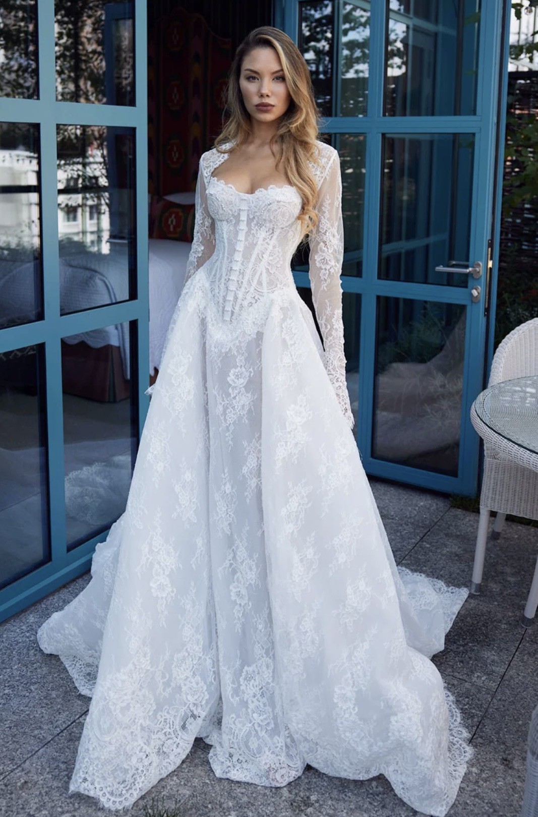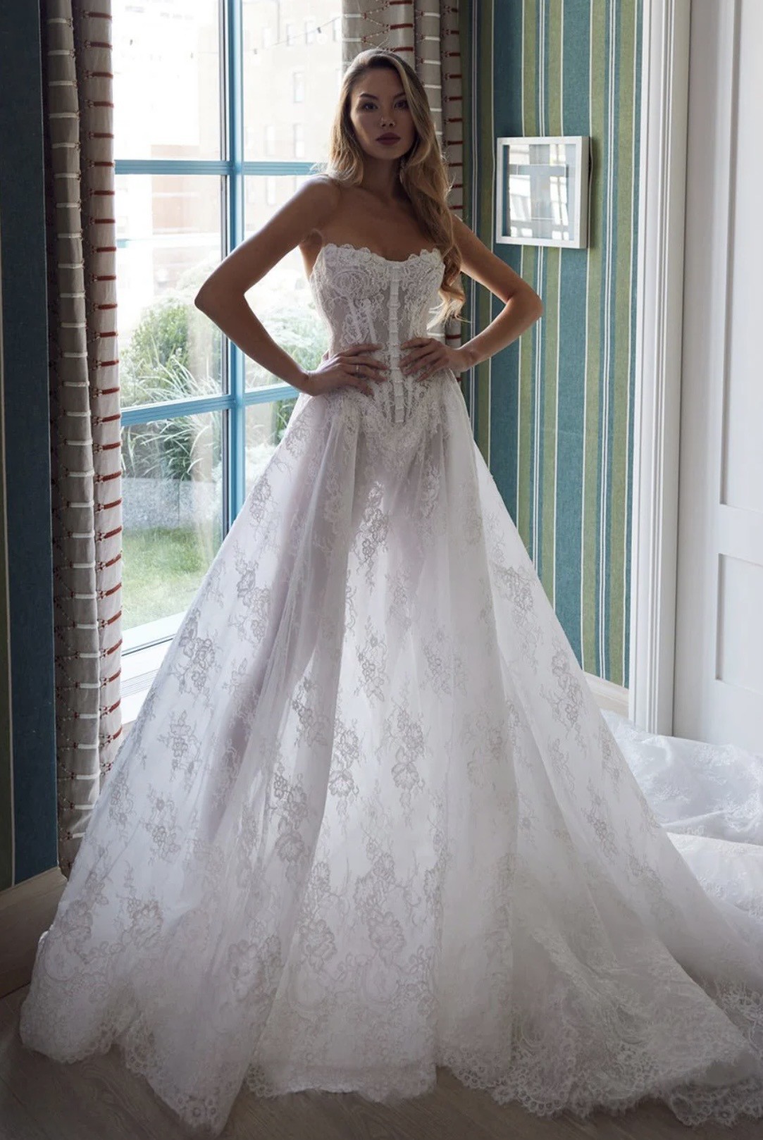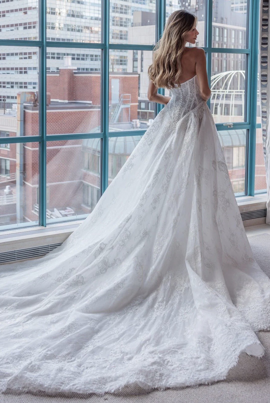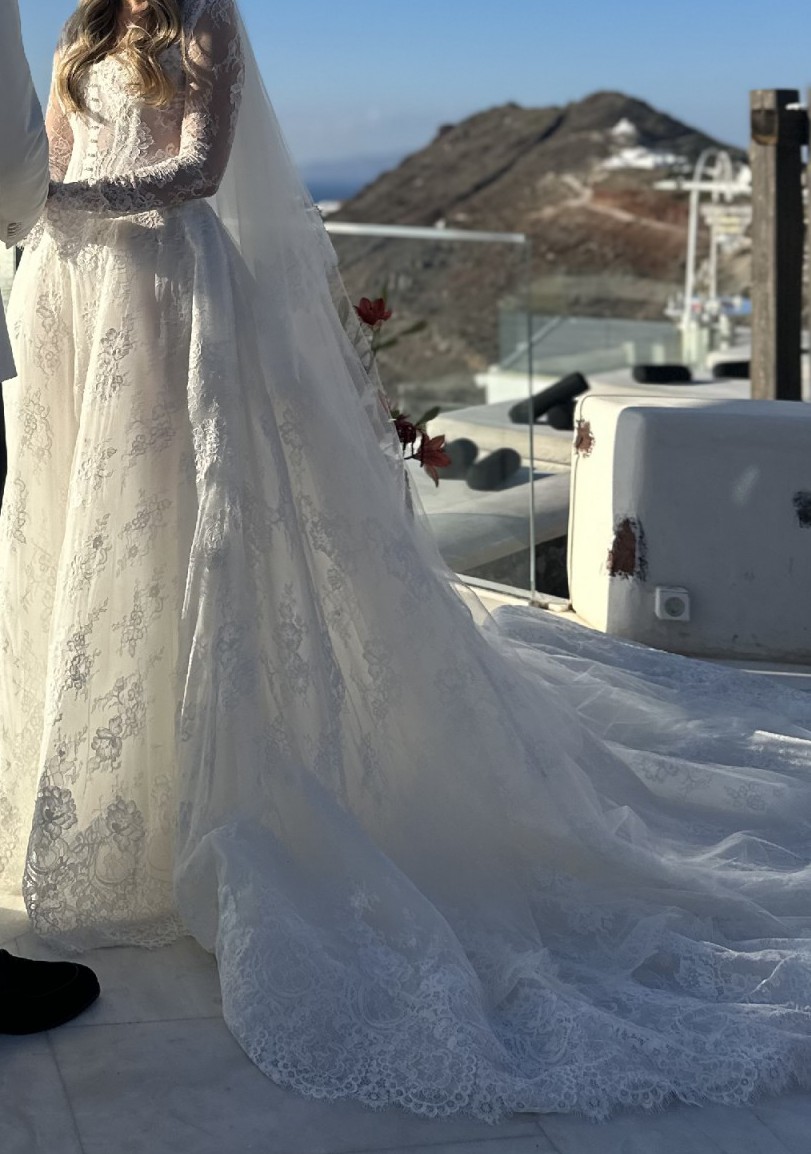 Selling my gorgeous wedding dress. Basque waisted- corset back, so flattering. Truly a show stopper! I’m 5’10 wearing 2 inch heels (see last photo) Will have dry cleaned before selling. Purchased in LA. Wedding was in December. Paid $10,100 for dress, $1,030 for Balero (can wear with our without) & $1,400 for alterations. Totaling $12,530. Worn for only 4 hours before changing into my second dress. Deciding to keep my veil as a keepsake :’)