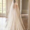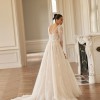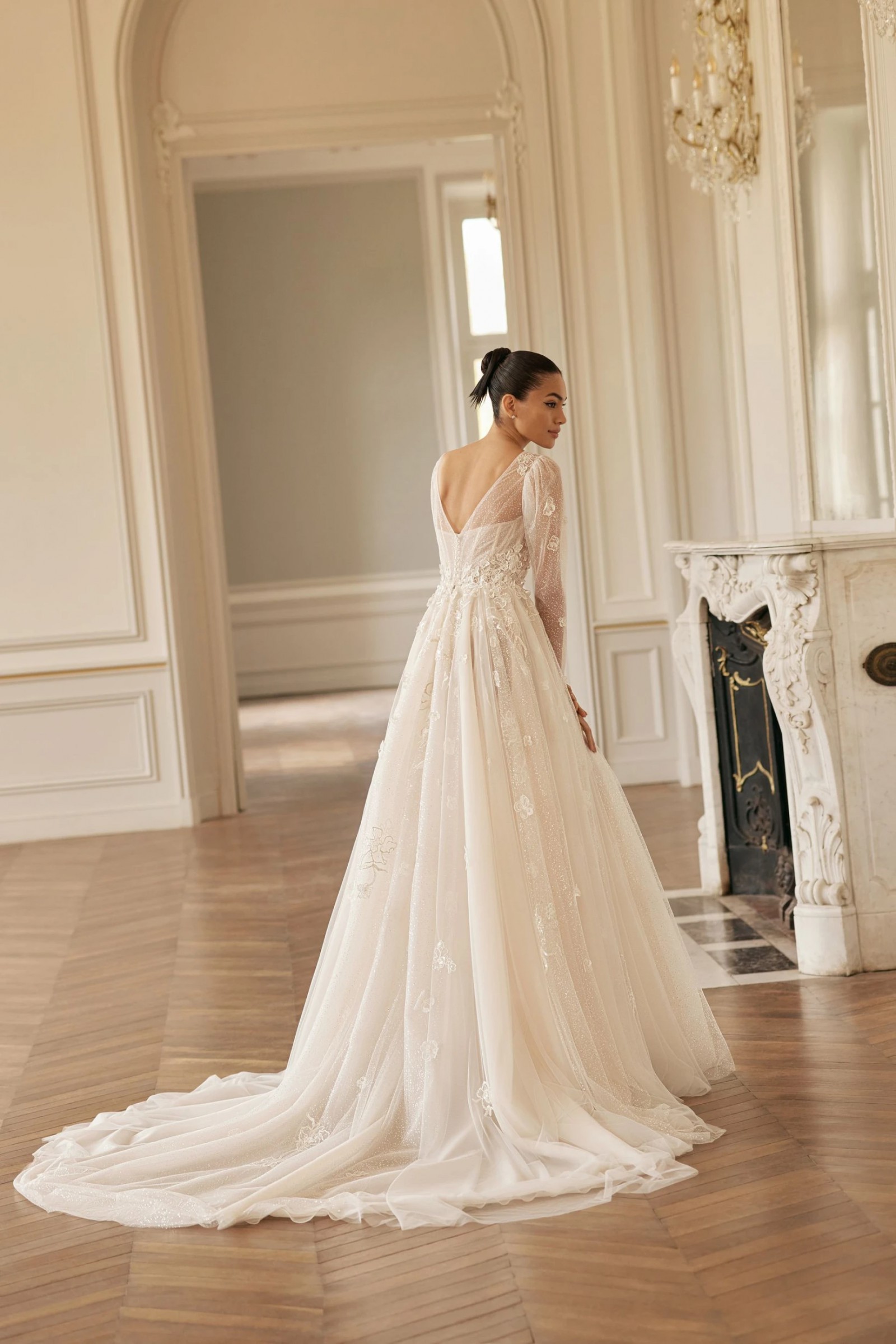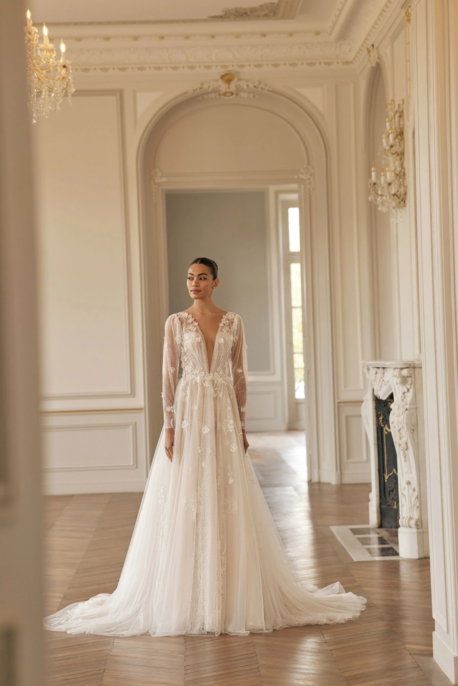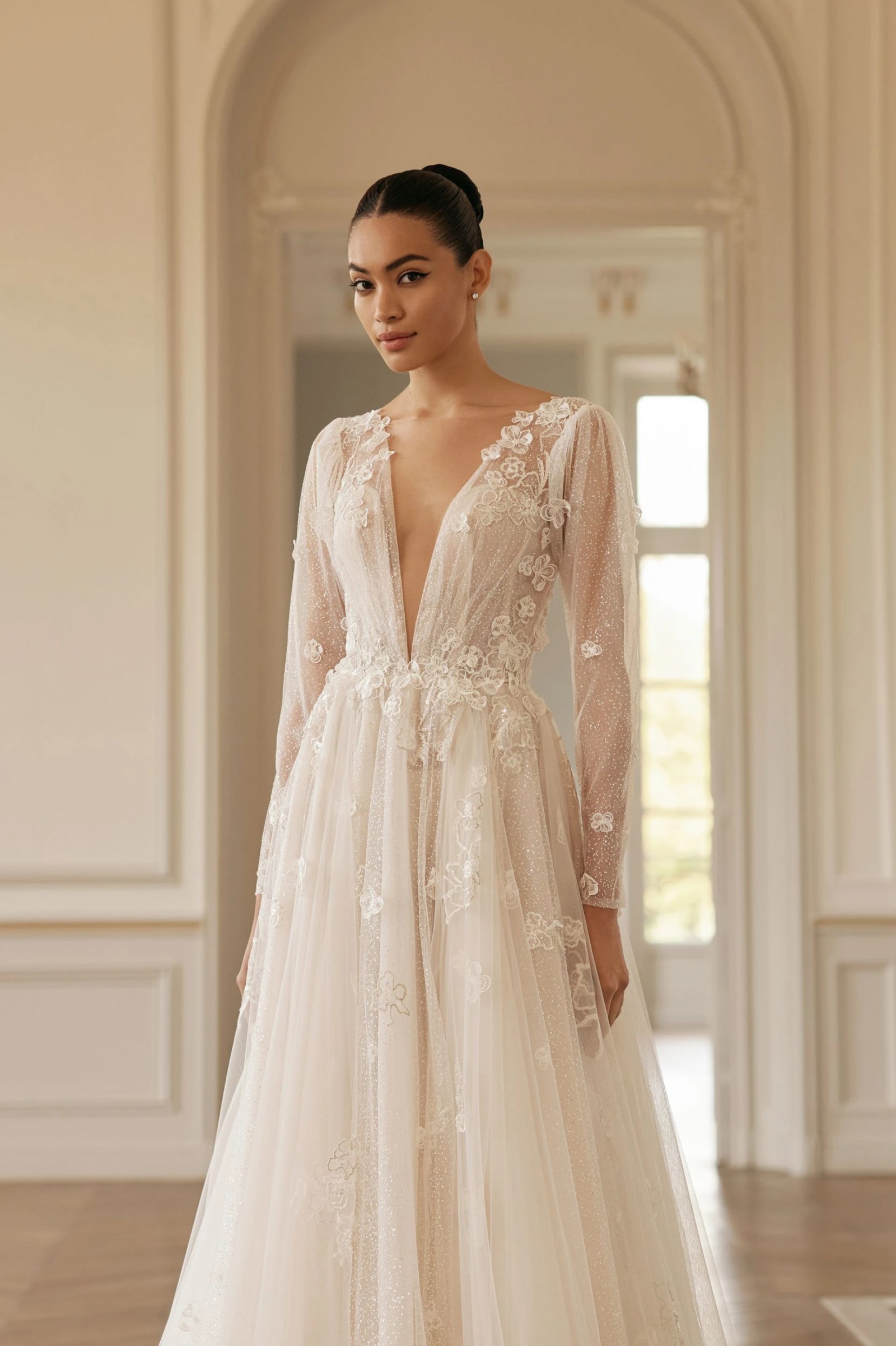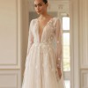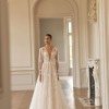 A-line dress in light skin color seduces with delicate transparency and shine. A deep neckline with a V-neck down to the waistline emphasizes the sexuality and charm of the bride. With a subtle sheen, the translucent long-sleeved top has a slight V-neckline on the back and a button and loop fastening in the center. The inner corset of the dress is made of mesh and is fastened in the center of the back with a hidden zipper. The top is decorated with embroidered appliqués that smoothly pass to a lush tulle skirt with a train, slightly covered with flowers with a 3D effect. A small gathering is made along the waistline. Vertical inserts made of fabric with a delicate shine are used as the decor of the skirt. The closure of the skirt is a hidden zipper. If desired, the bride can choose a dress in ivory color.