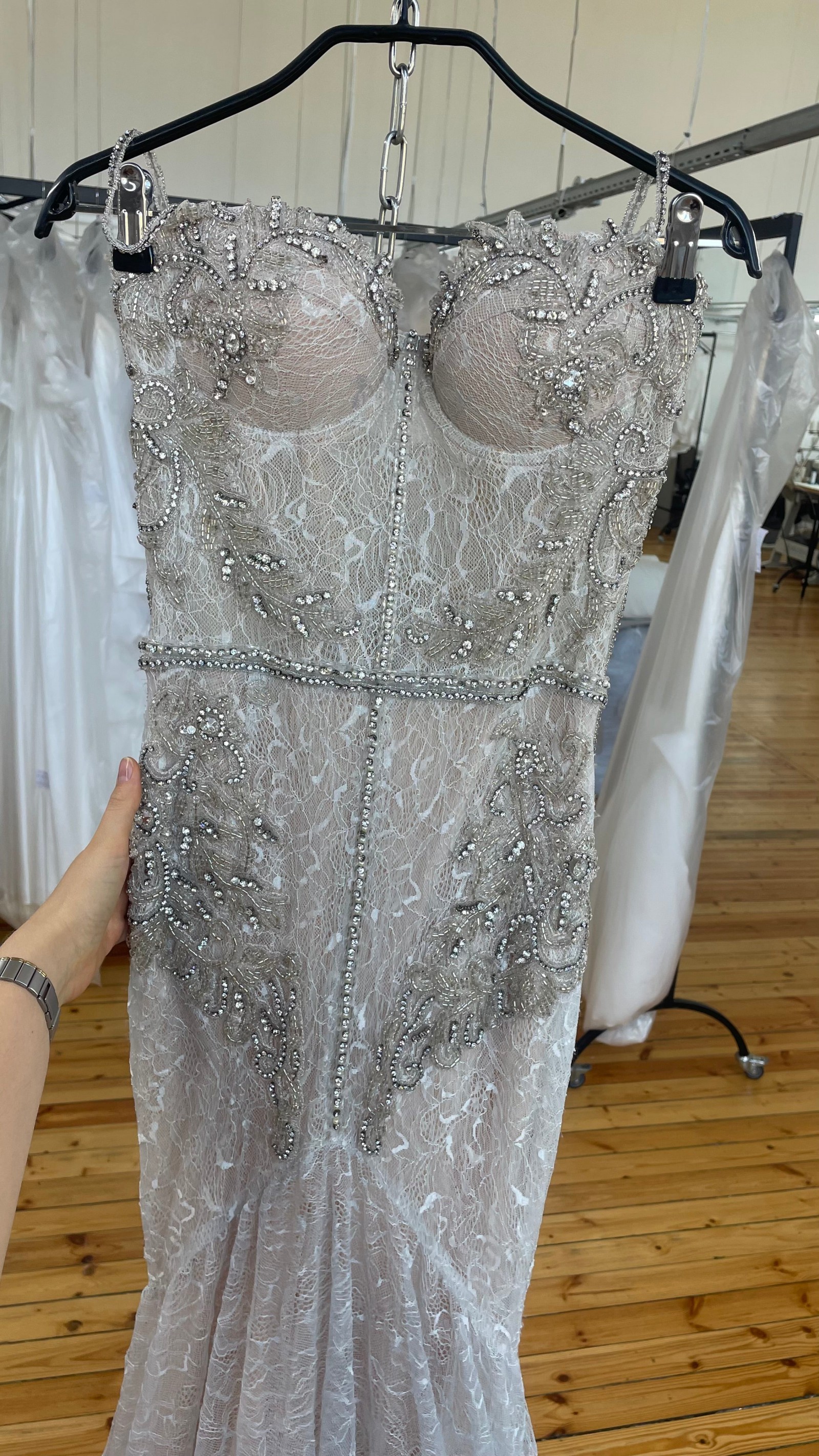 This wedding dress is the Darlin style by Other. I bought this dress in , it has not been professionally cleaned and is unaltered. I would describe it as a wedding dress featuring , a silhouette, and a neckline.