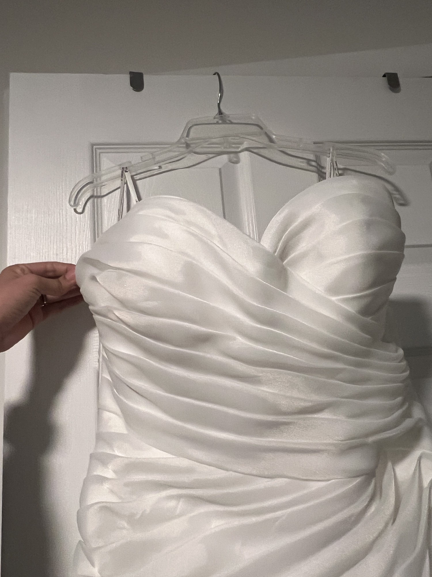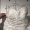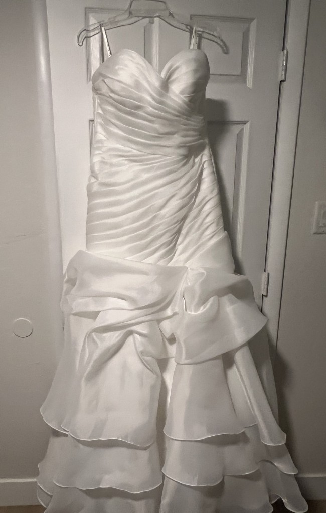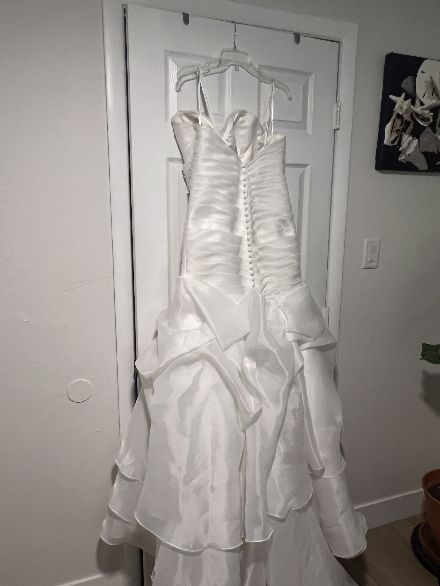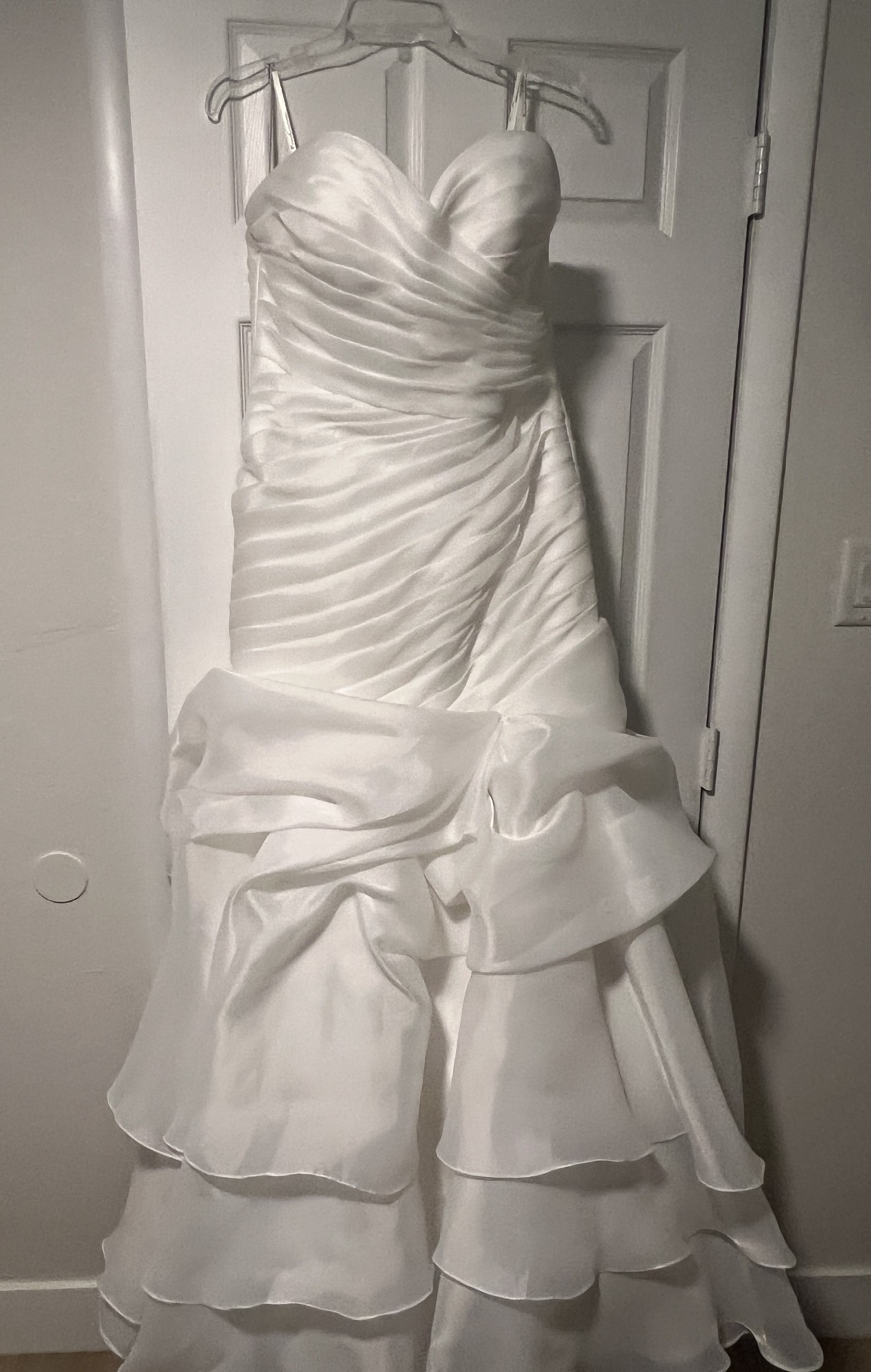 white strapless wedding dress with a ruched bodice and a tiered, ruffled skirt. Also had buttons down the back. Only been worn to try on. Free of marks or dirt.