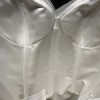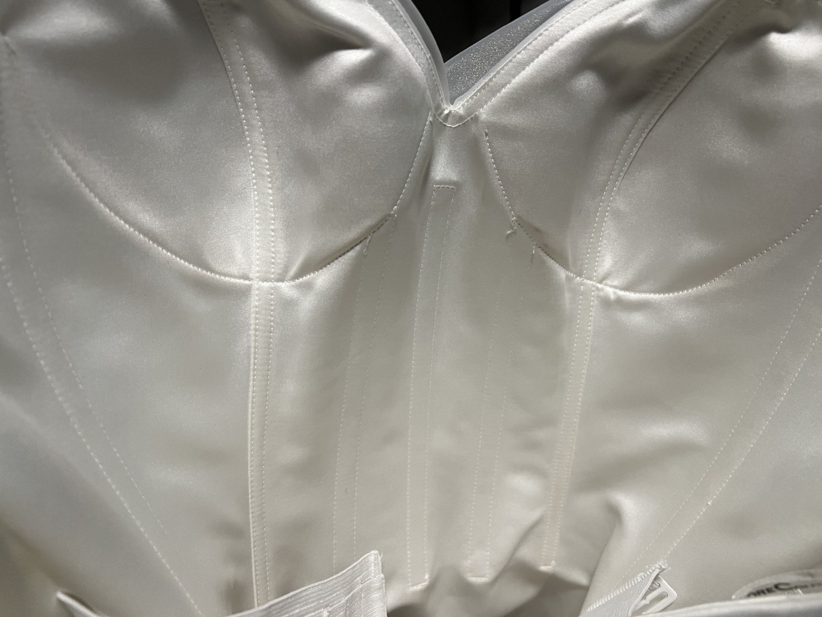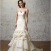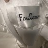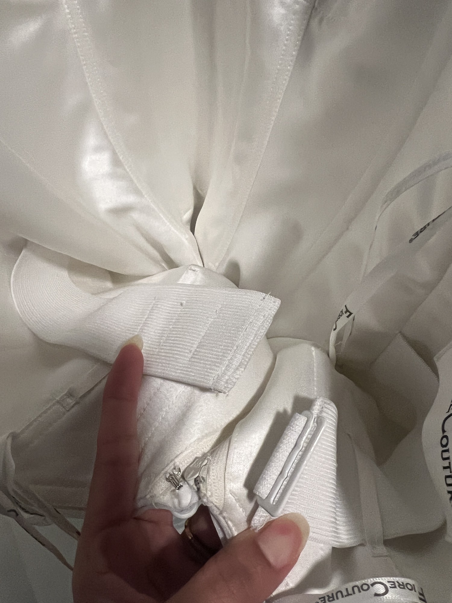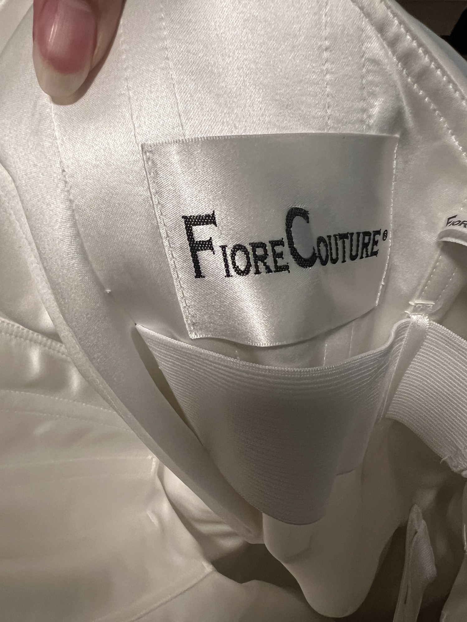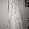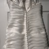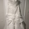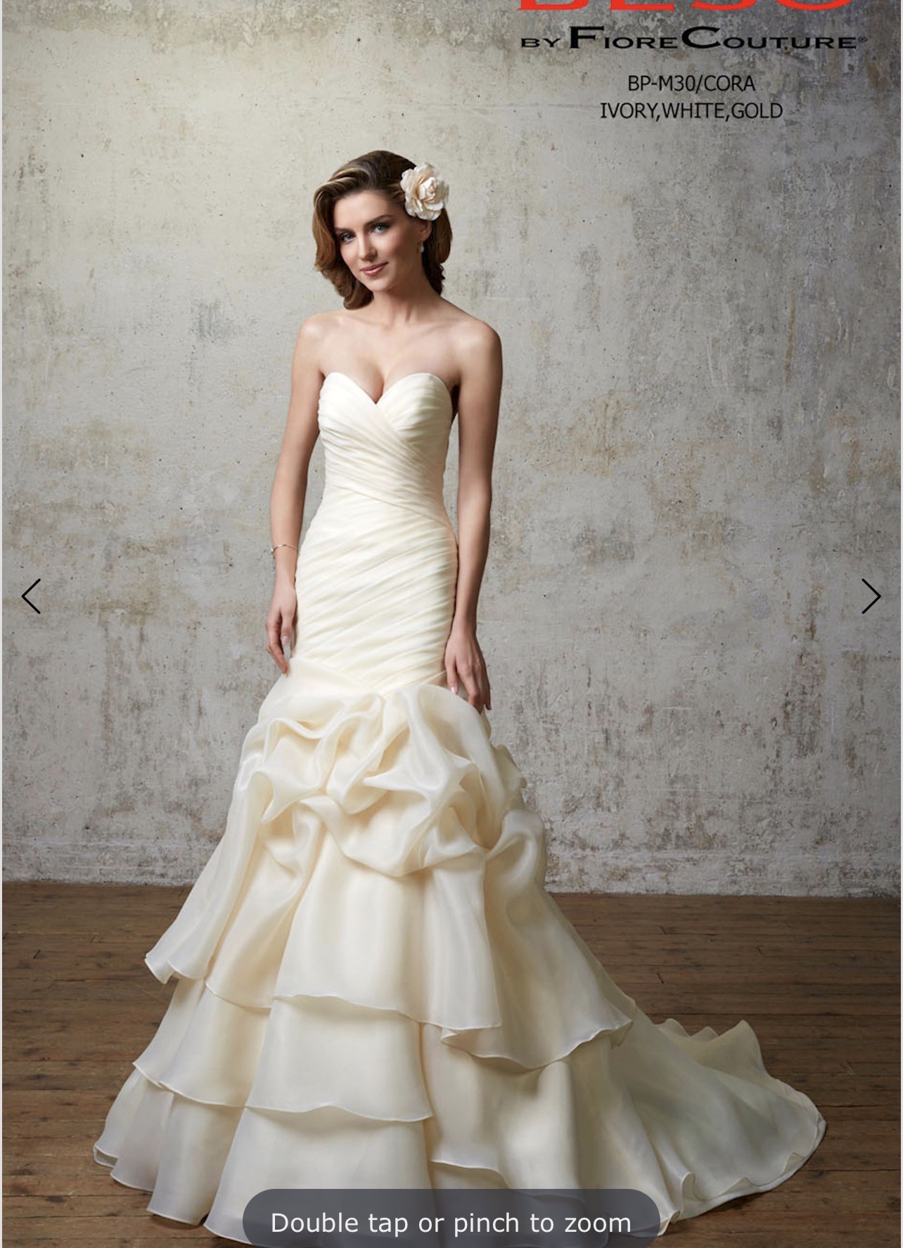 white strapless wedding dress with a ruched bodice and a tiered, ruffled skirt. Also had buttons down the back. Only been worn to try on. Free of marks or dirt.