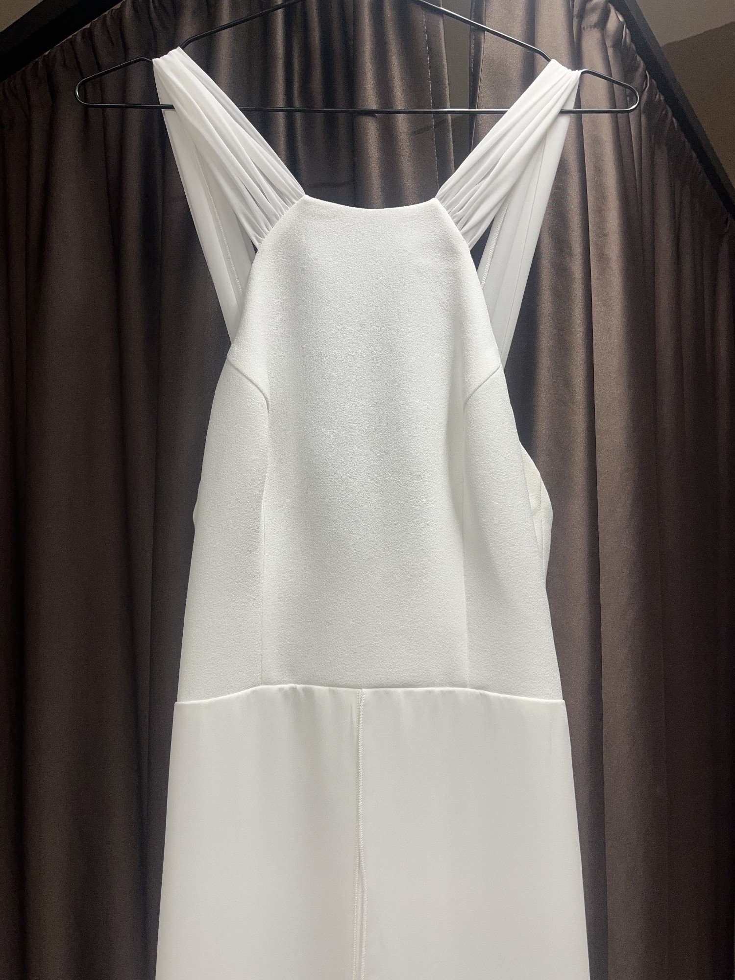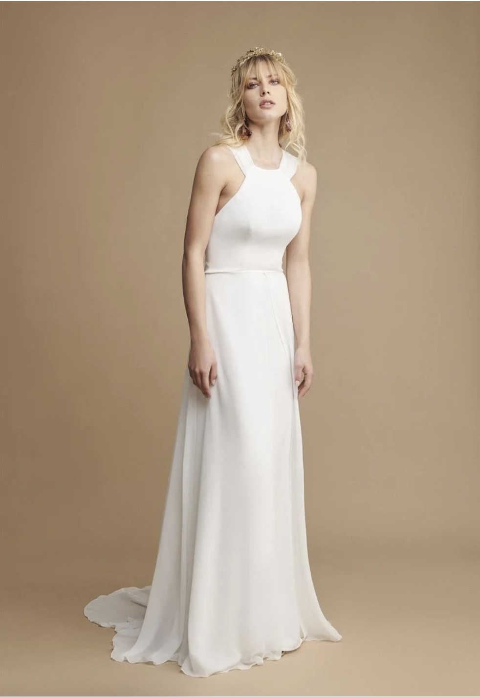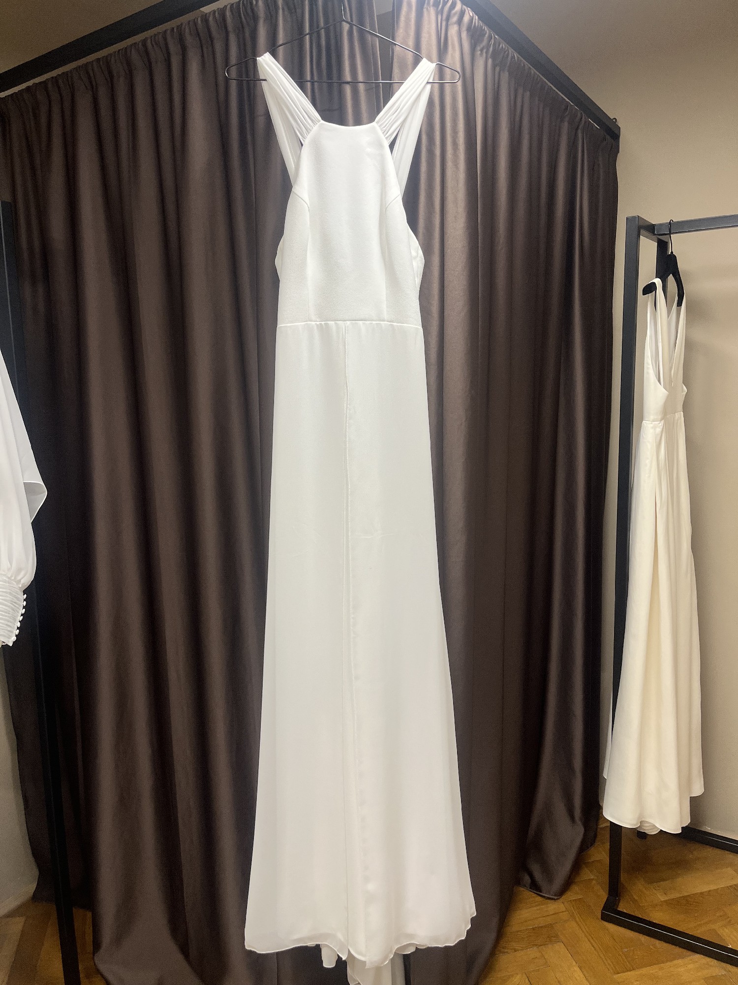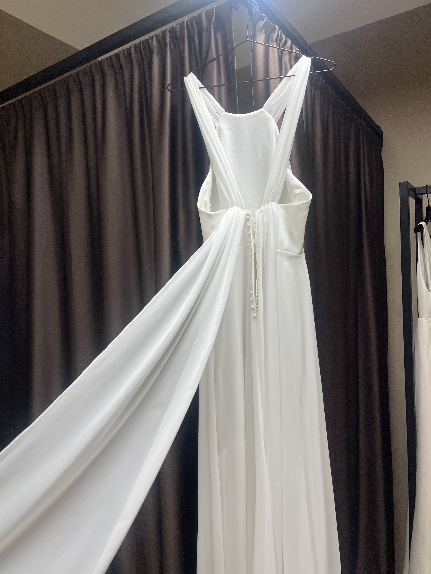 This stunning Rembo Styling Juncal dress was the perfect choice for my special day, and now I’m excited to pass it on to another bride who will cherish it just as much as I did. With its elegant halter neckline and flattering A-line silhouette, this dress beautifully highlights the figure while providing exceptional comfort. The romantic V-back adds an alluring touch that truly makes this gown unforgettable.