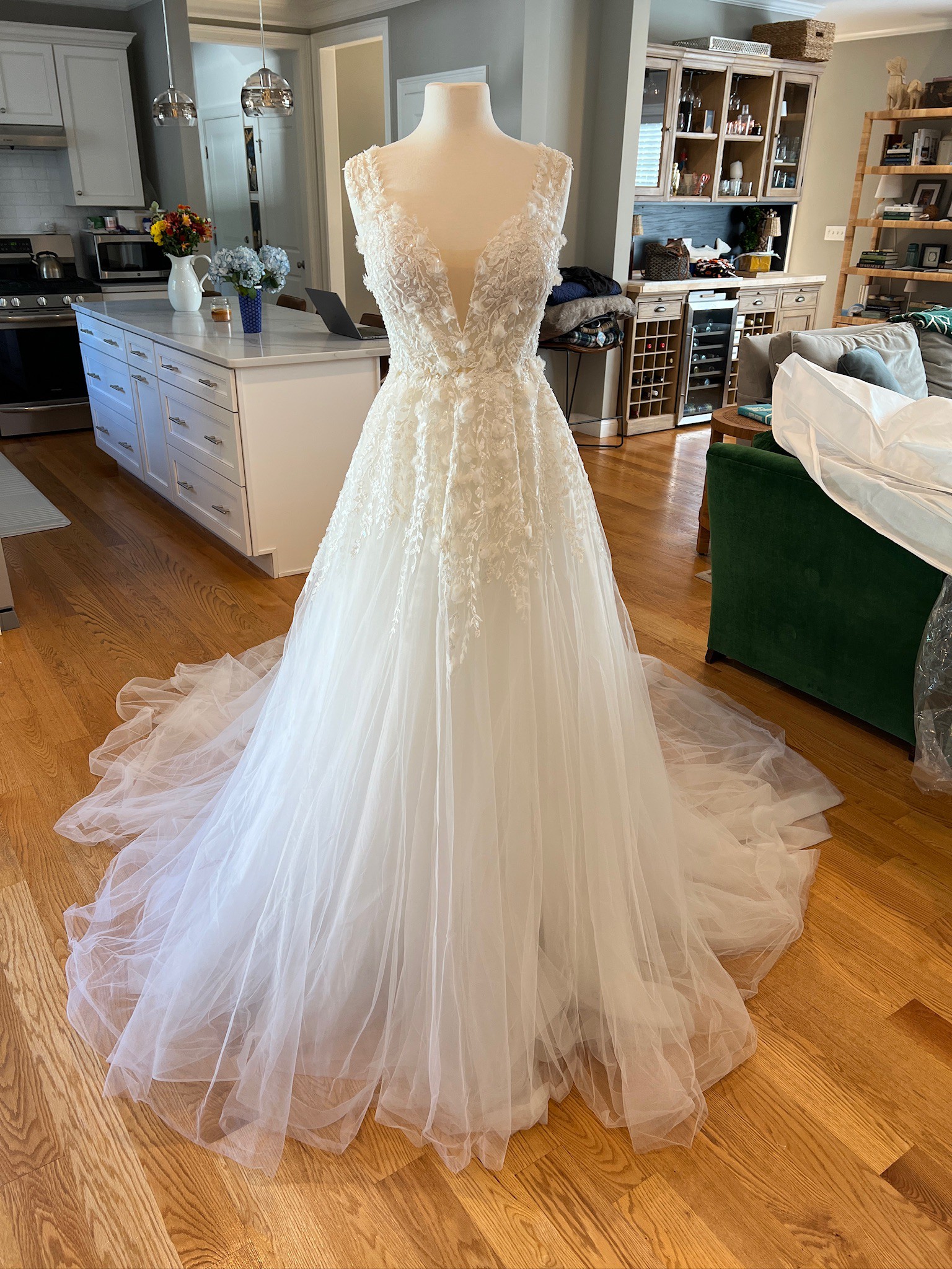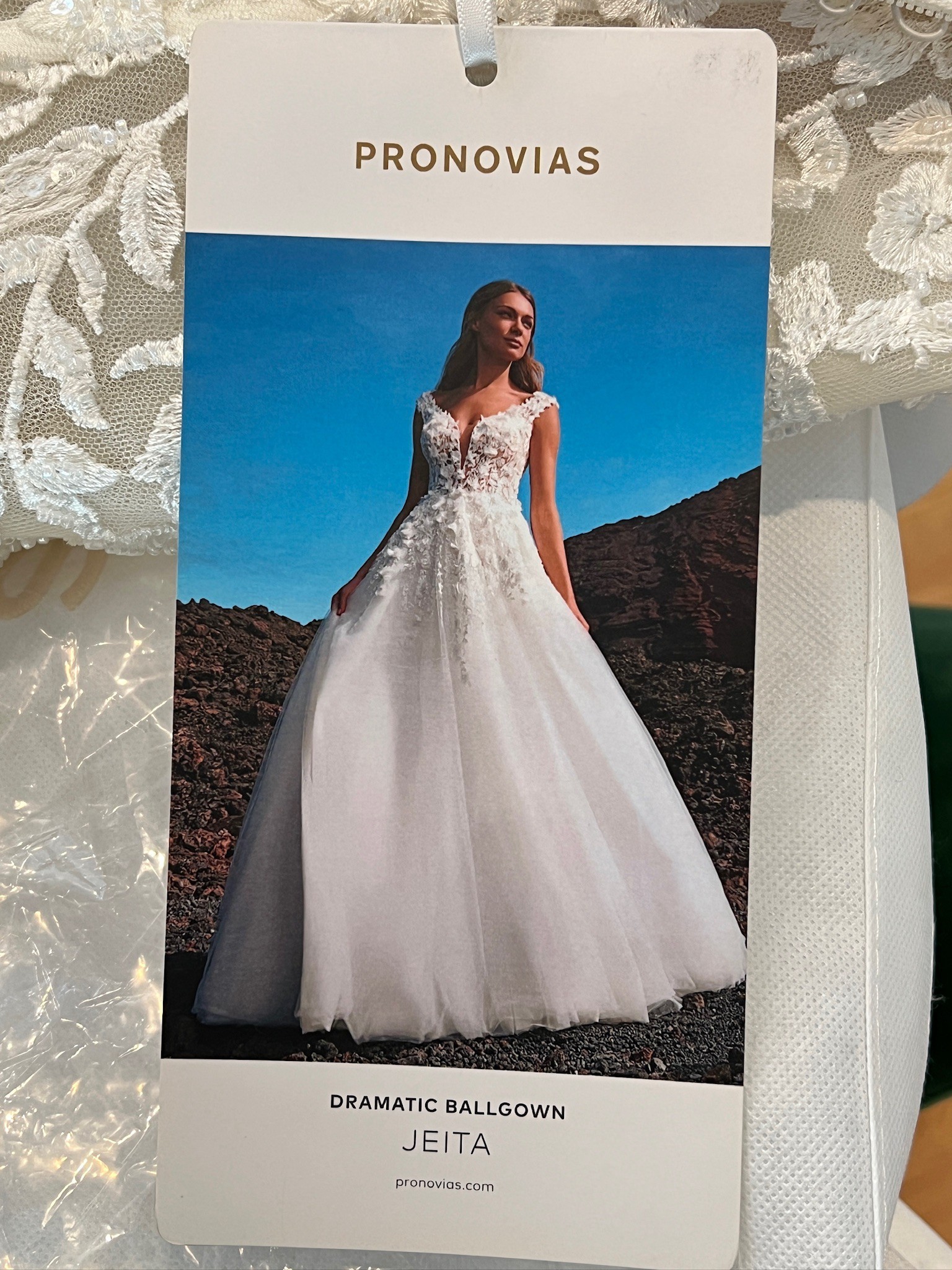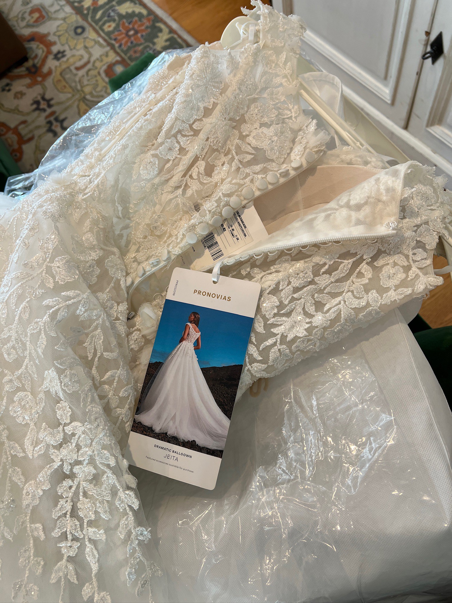 Never worn past trying on at the store. I purchased this a few sizes too big because it was beautiful. I was worried I would not find a gown in time. I would have worn this dress except I found out that it was going to take too long to alter it before the wedding. On my last dress appointment after buying this, my step daughter found another dress that fit perfectly needing no alterations. This dress has never had the tag removed and has not been worn in a wedding. It was available in the store so it was tried on before I bought it I’m assuming, but It’s in great condition. Lots of beading and very pretty. Happy to show you a picture of the dress I ended up wearing as proof that I did not wear this for my wedding and or show you my actual wedding dress that was very similar. If it had fit I would have 100% gotten married in this dress. For sale currently at: https://www.alexandrasbridalboutique.com/p19815078/pronovias-fashion-jeita.html