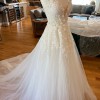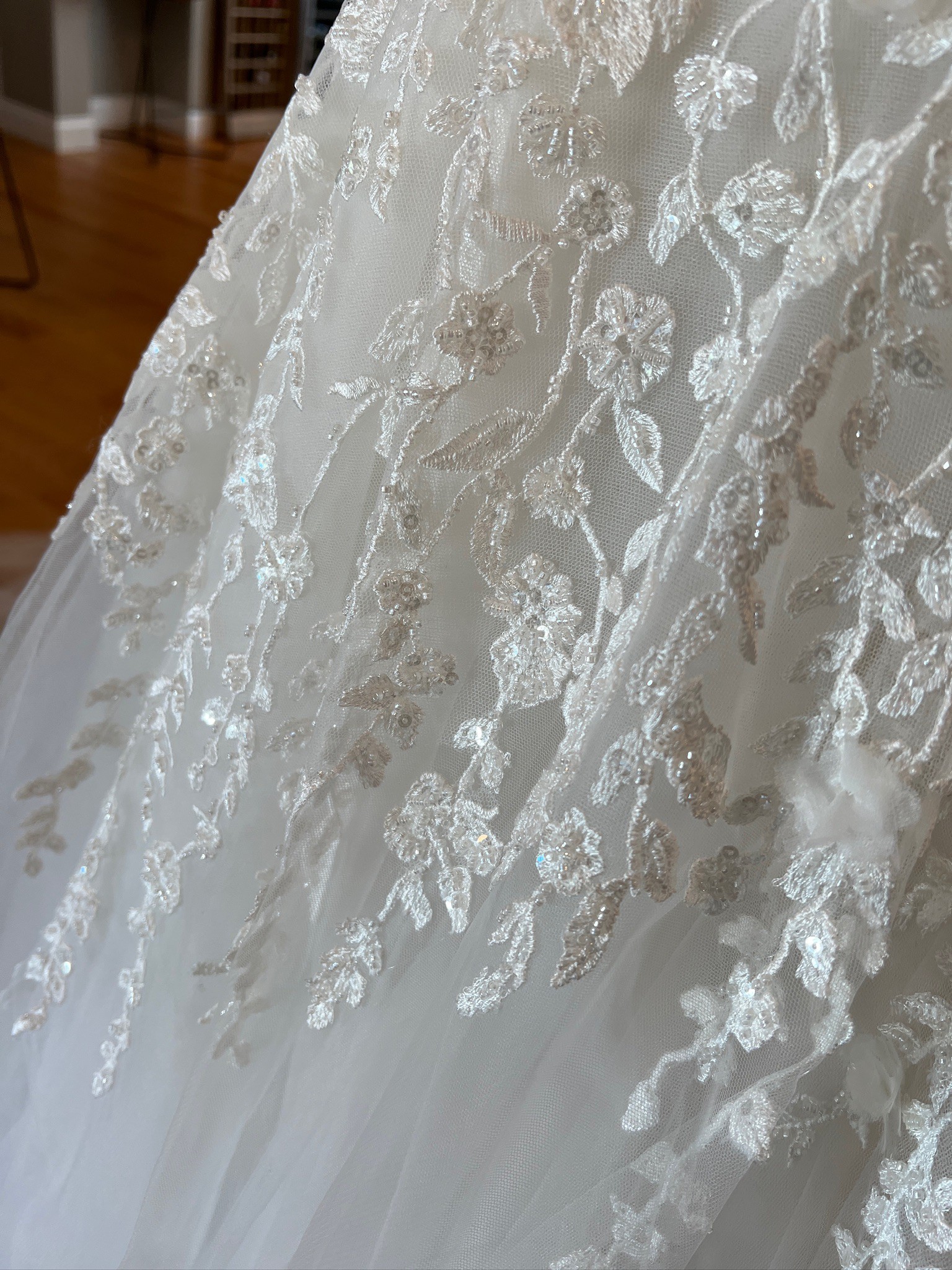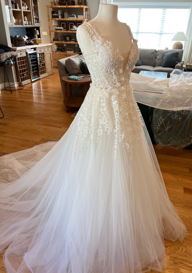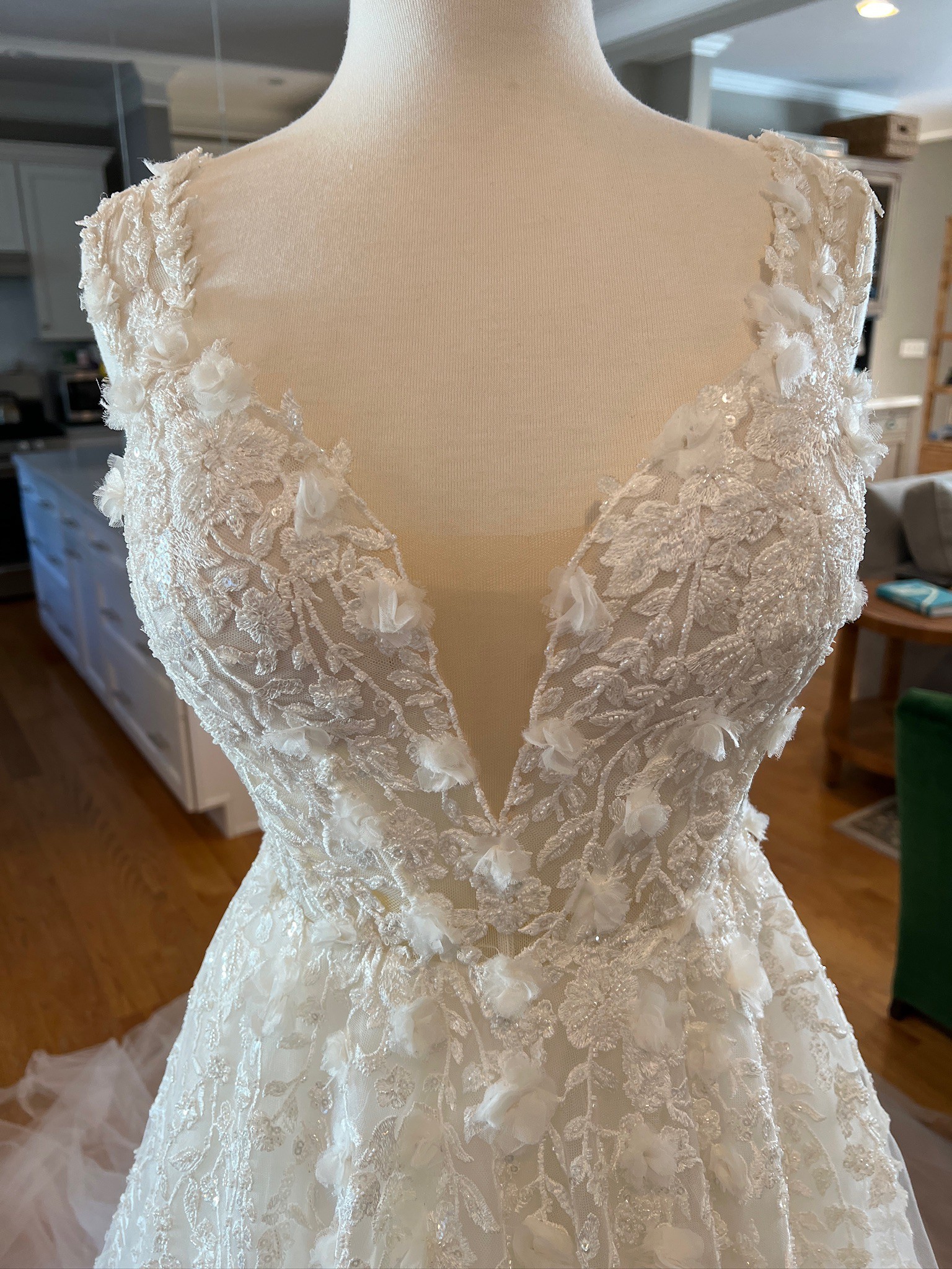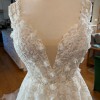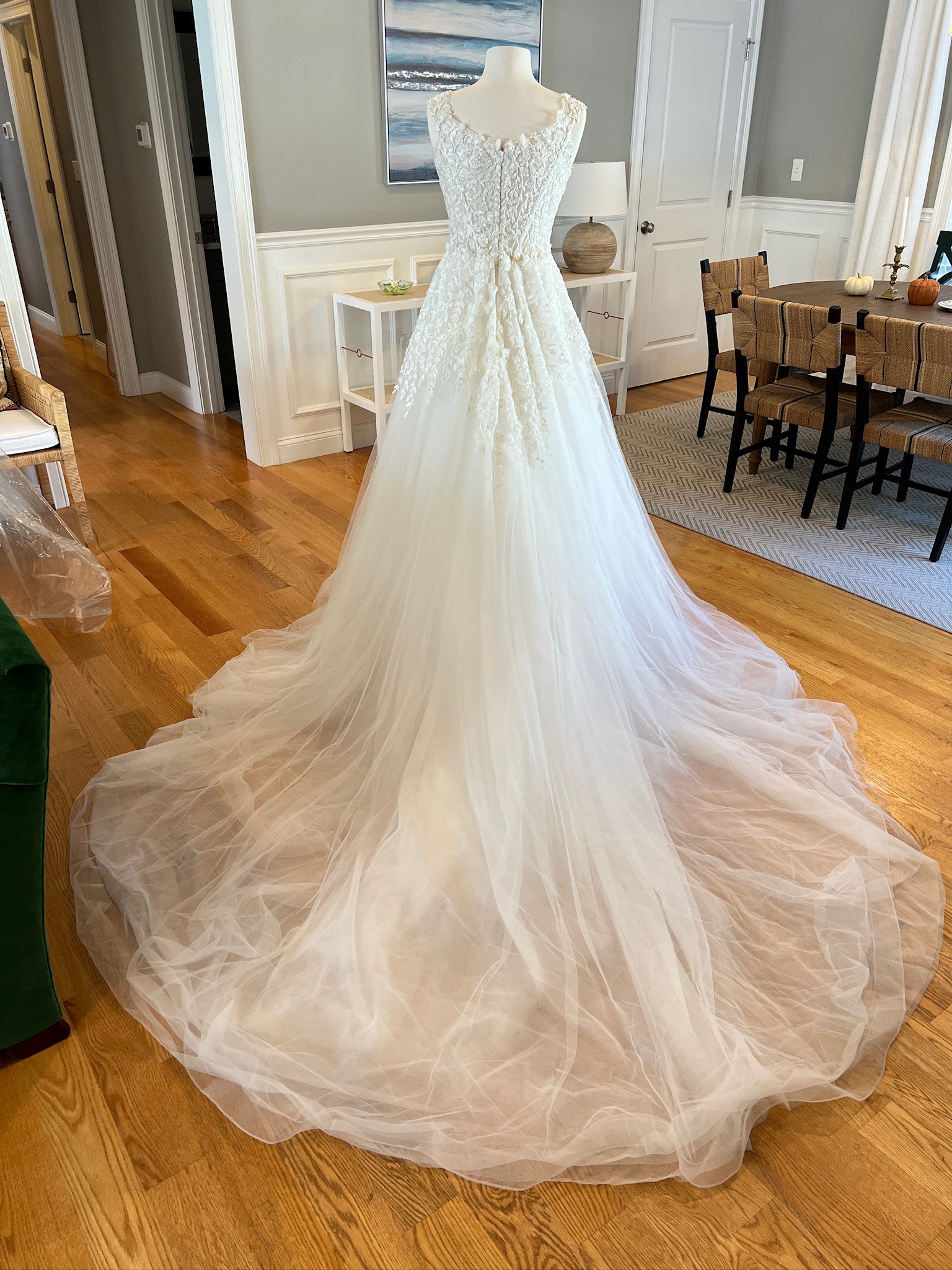 Never worn past trying on at the store. I purchased this a few sizes too big because it was beautiful. I was worried I would not find a gown in time. I would have worn this dress except I found out that it was going to take too long to alter it before the wedding. On my last dress appointment after buying this, my step daughter found another dress that fit perfectly needing no alterations. This dress has never had the tag removed and has not been worn in a wedding. It was available in the store so it was tried on before I bought it I’m assuming, but It’s in great condition. Lots of beading and very pretty. Happy to show you a picture of the dress I ended up wearing as proof that I did not wear this for my wedding and or show you my actual wedding dress that was very similar. If it had fit I would have 100% gotten married in this dress. For sale currently at: https://www.alexandrasbridalboutique.com/p19815078/pronovias-fashion-jeita.html