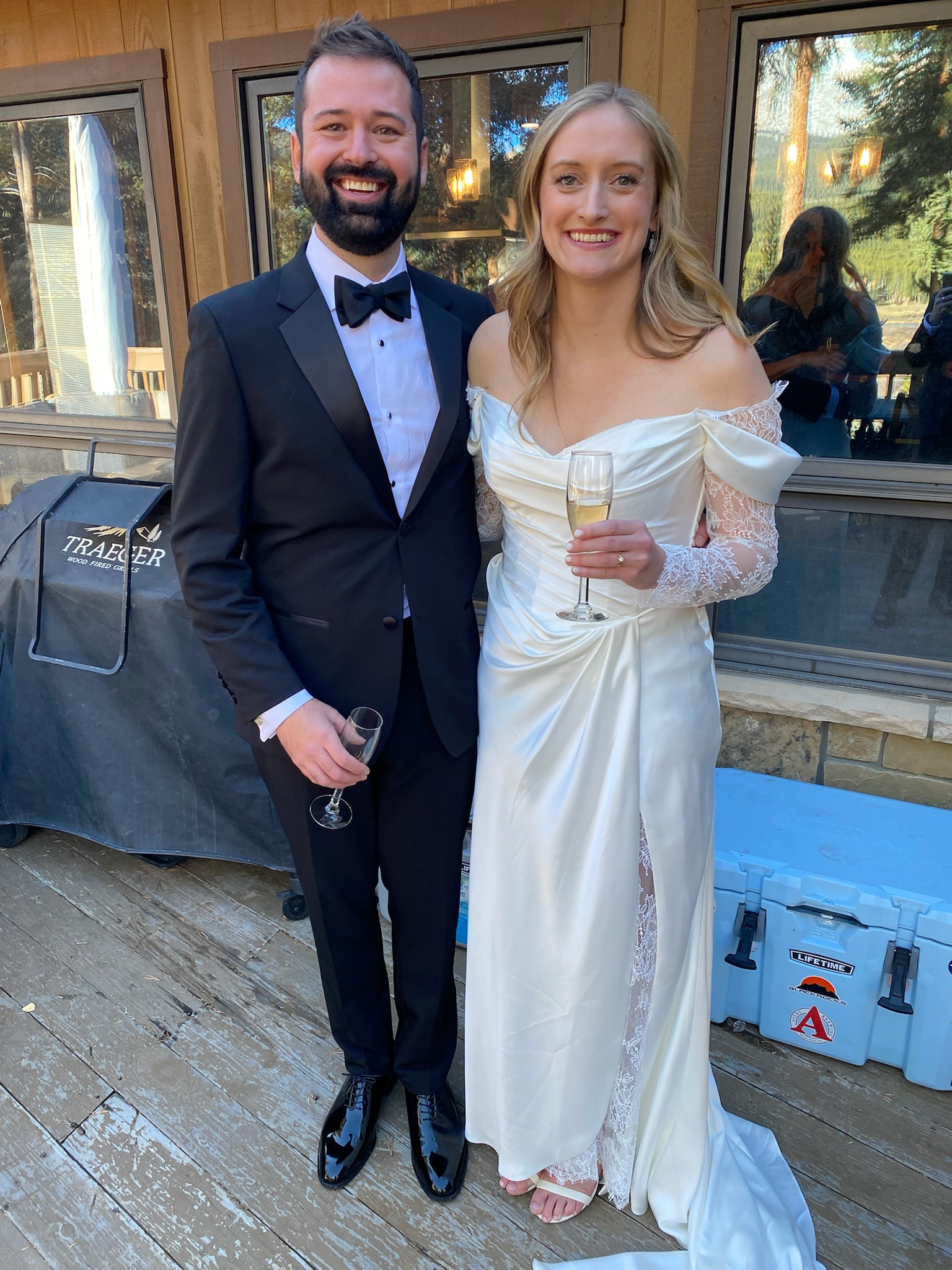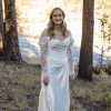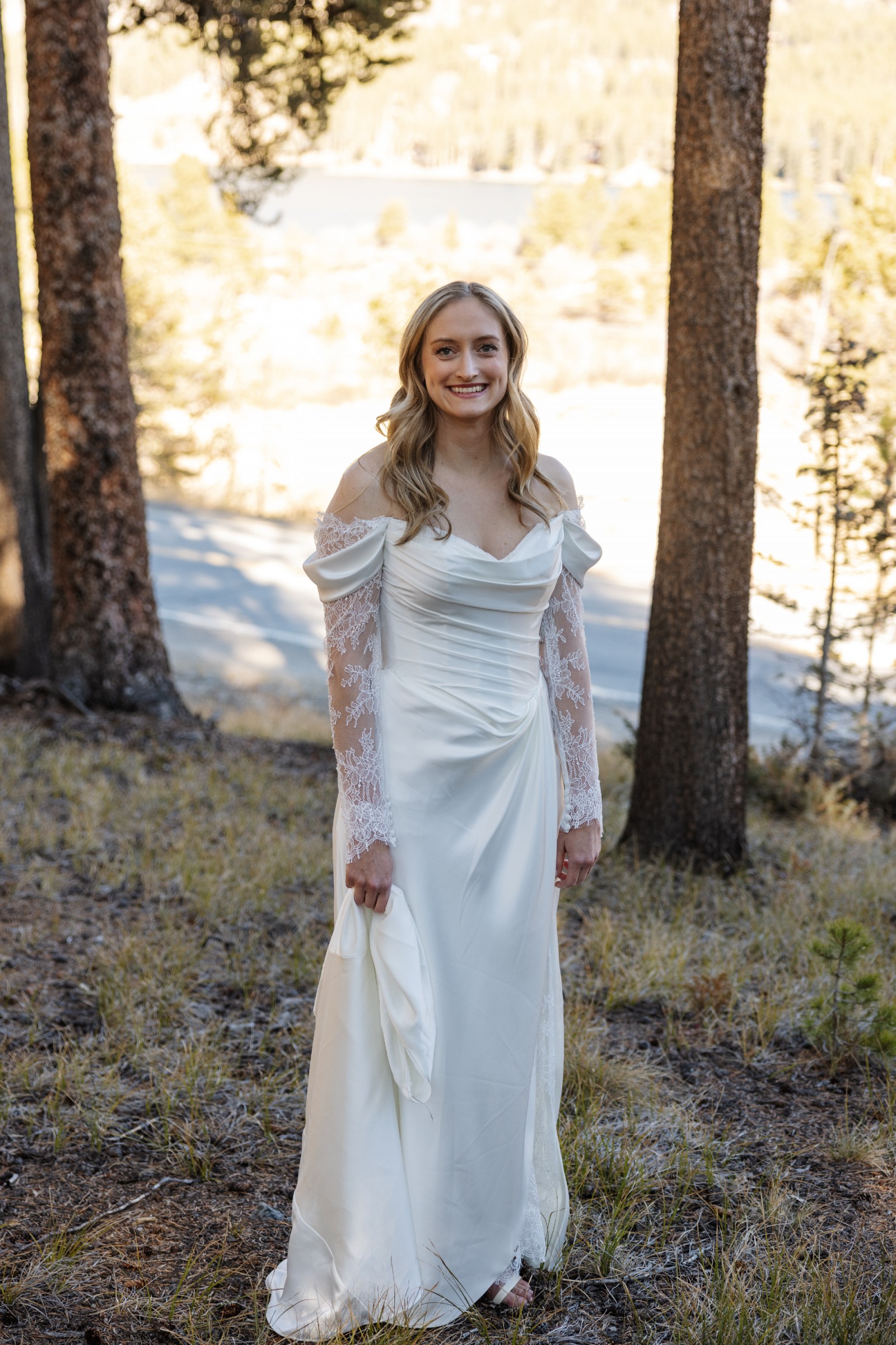 The Harlow Gown by Watters is cut from luxurious high-shine satin, lined with an intricately patterned lace slip. The corseted bodice features an off-the-shoulder neckline and beautifully draped fabric, cascading into a faux-wrap skirt with a daring thigh-high side slit.