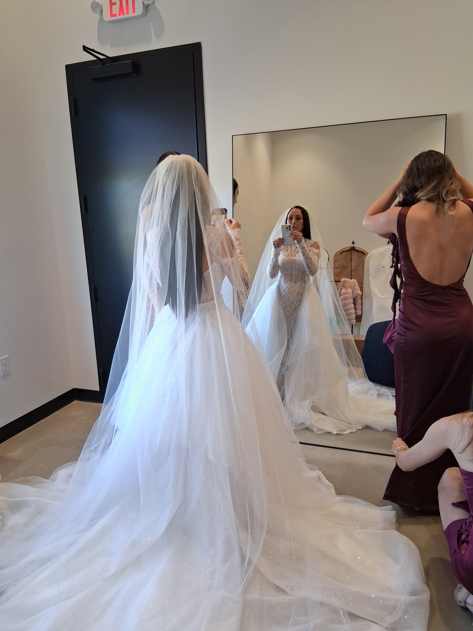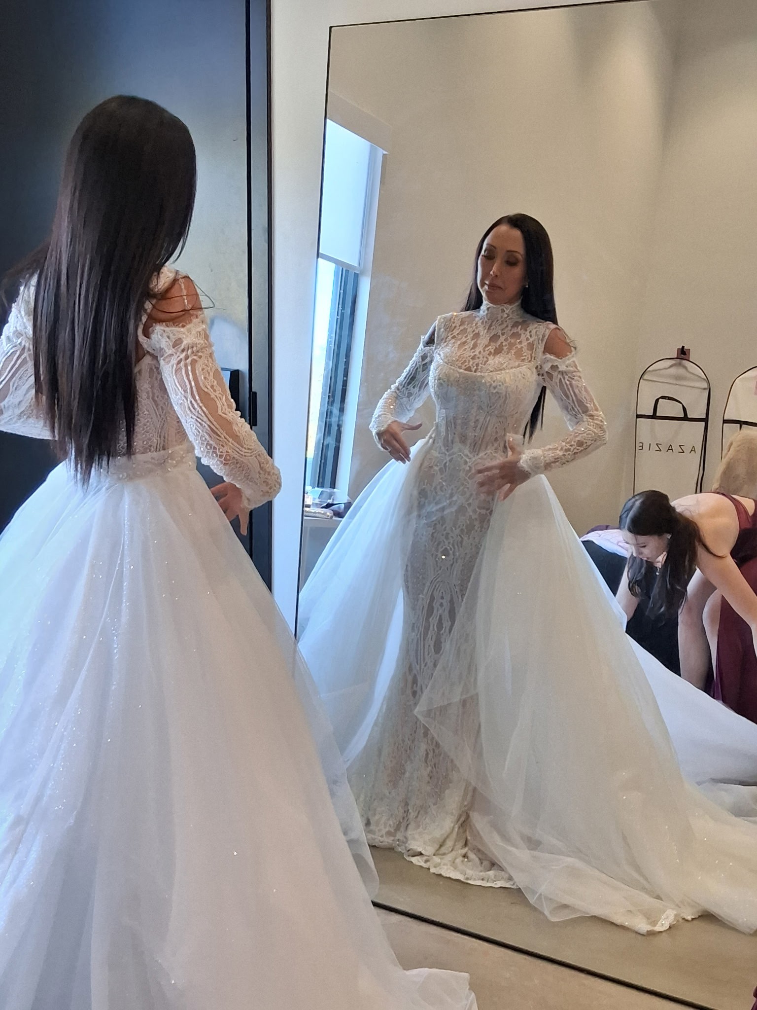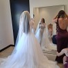 The stunning Mariposa open-front tulle overskirt with a flowing hem creates a bold, transformative look. Designed for versatility, it offers multiple ways to elevate your bridal style. It has layers of glitter on the top of the tulle, it's stunning in the light. Worn once. Has buttons added already so you snap it on to your gown (you will need to add snaps to your gown). Worn for only my ceremony and pictures.