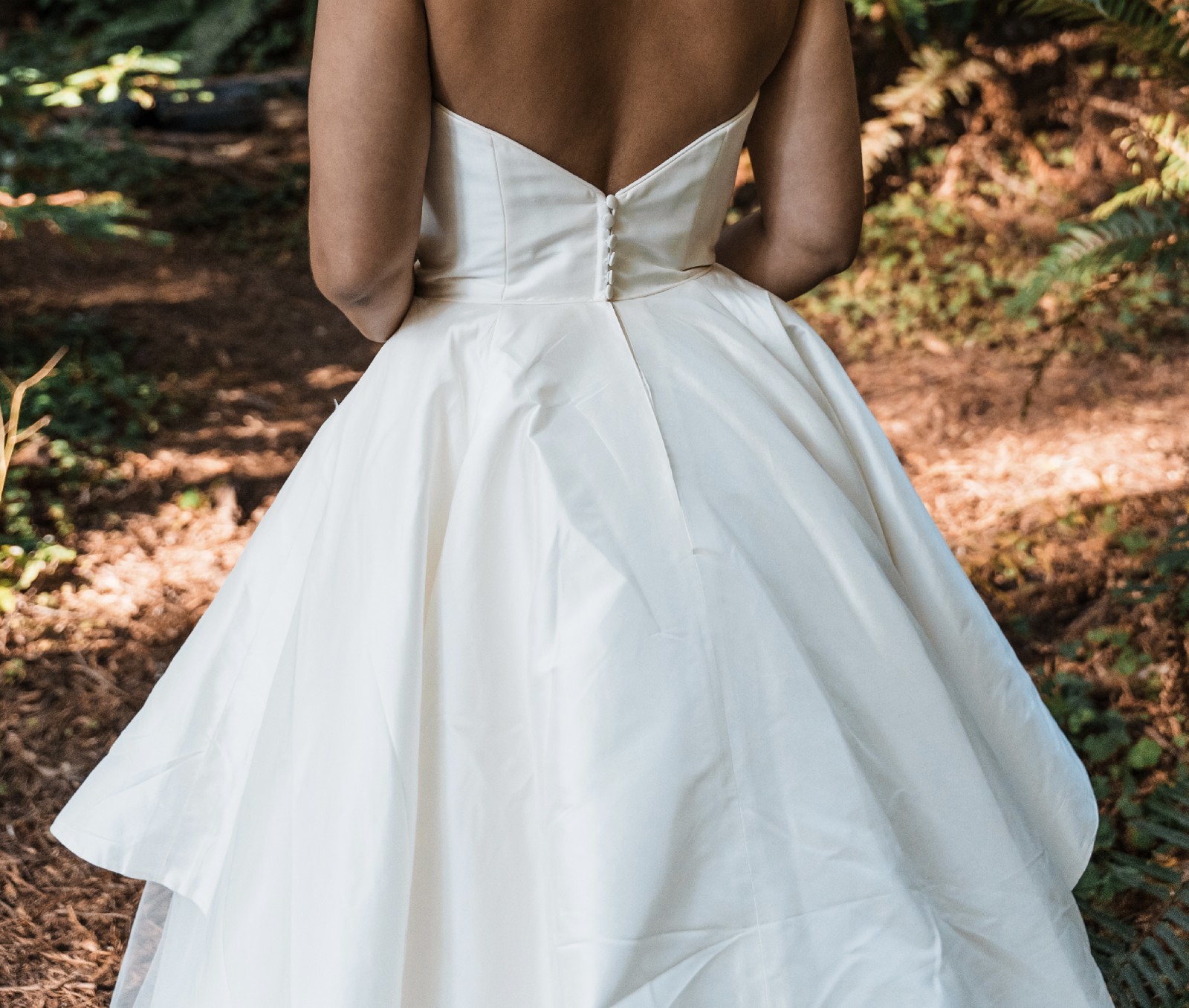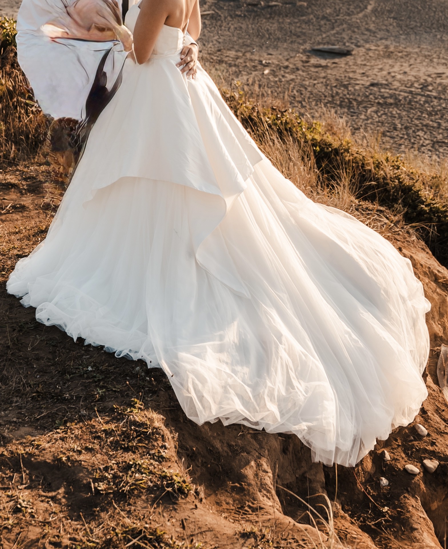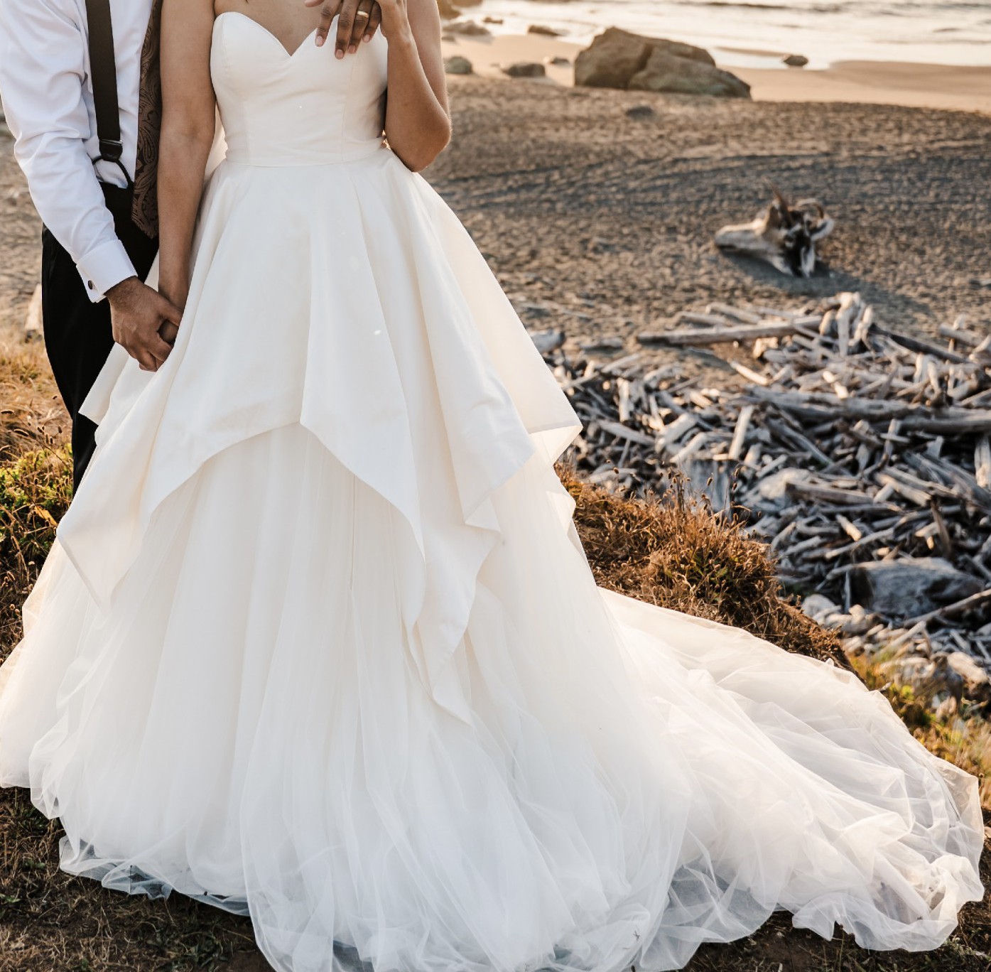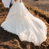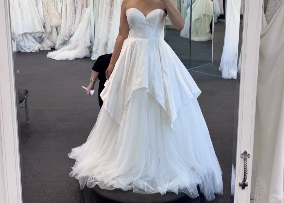 This Justin Alexander Adonia gown features a silk dupion sweetheart bodice with a tulle apron skirt and a chapel-length train. The layered skirt and clean neckline create a look that stands out while still feeling classic and elegant.