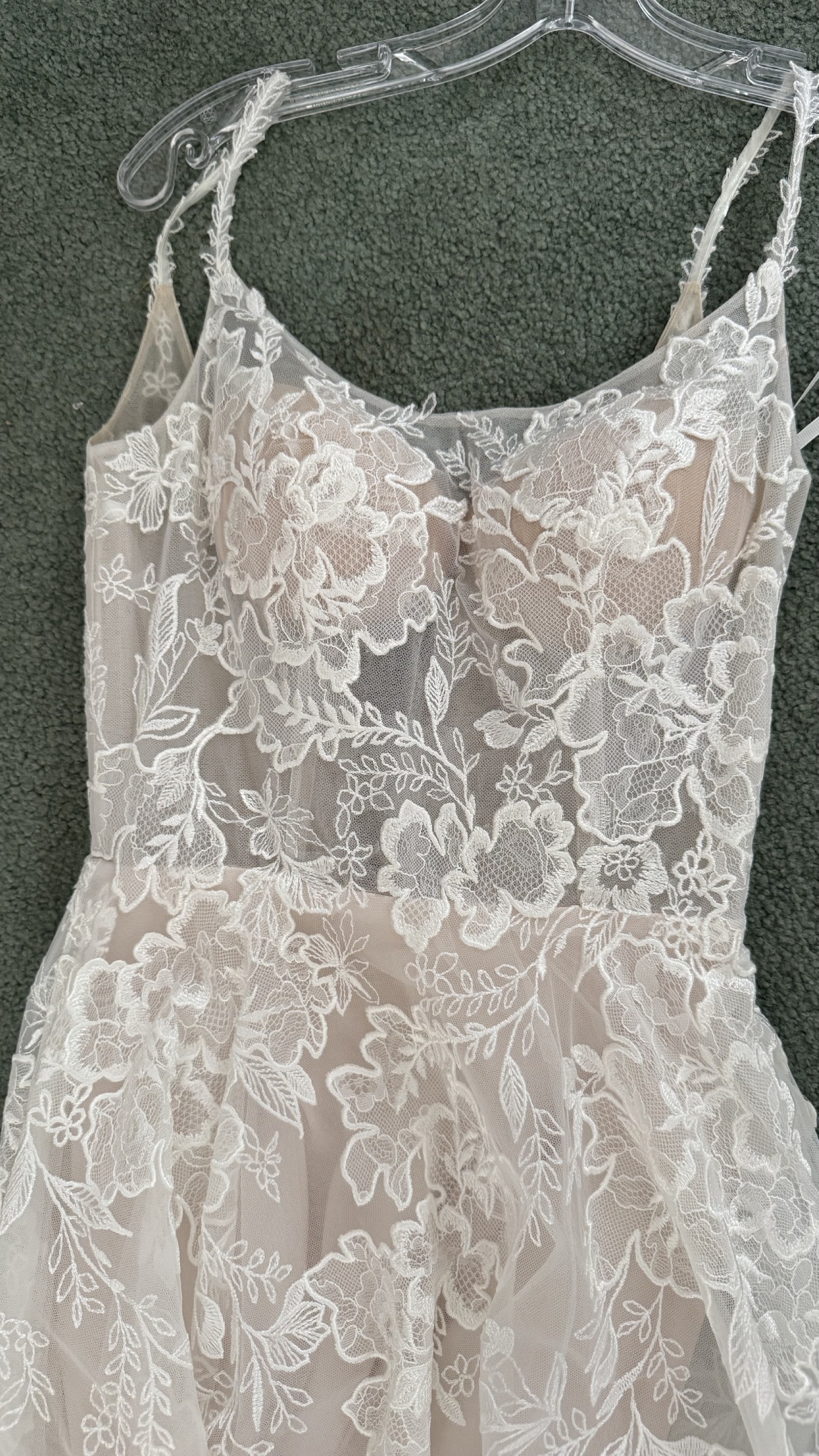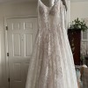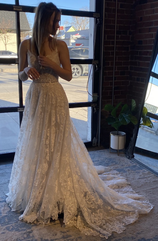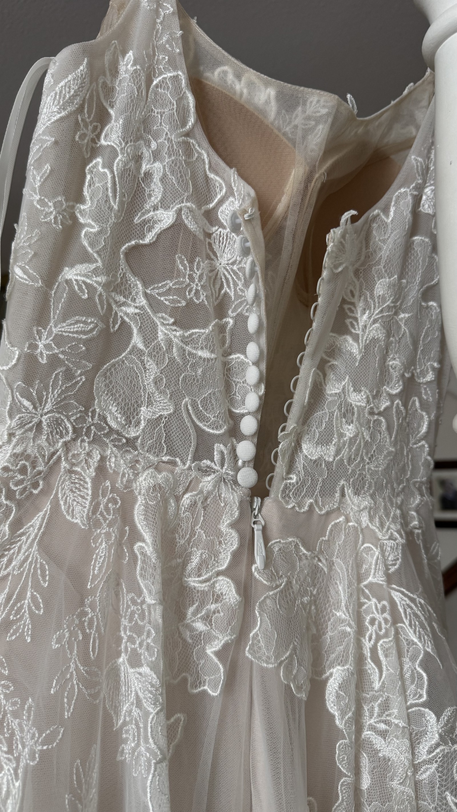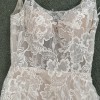 Beautiful 2022 dress bought from luv bridal and never got married in. It’s been put on but never worn for more than 20 min. (Belt in first photo not included with dress) Dress has beautiful lace flowers all over and a short train that would make it perfect for a spring or summer wedding. The back has a zip up for the bottom half and has buttons for the upper half. The bodice is not lined and is still see through but it’s an easy and inexpensive alteration. The short train has a strap so you can bustle it, strap as seen in one of the photos.