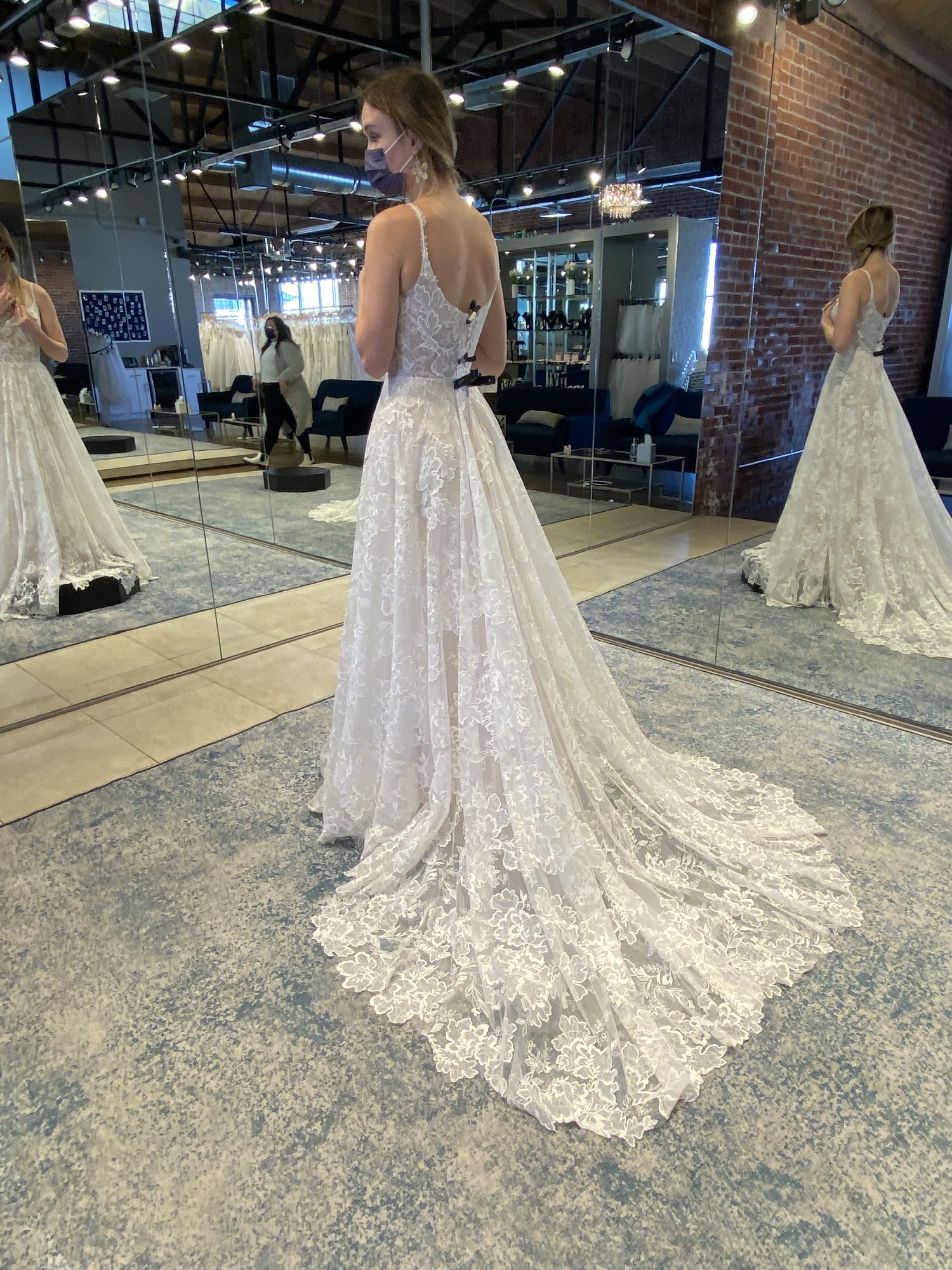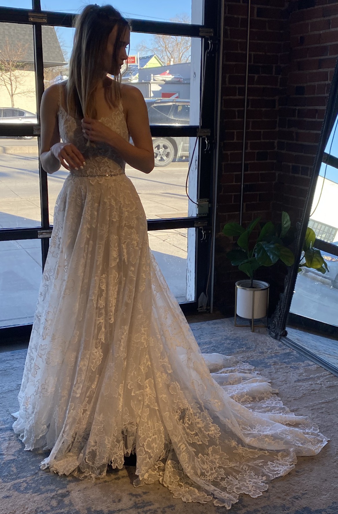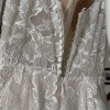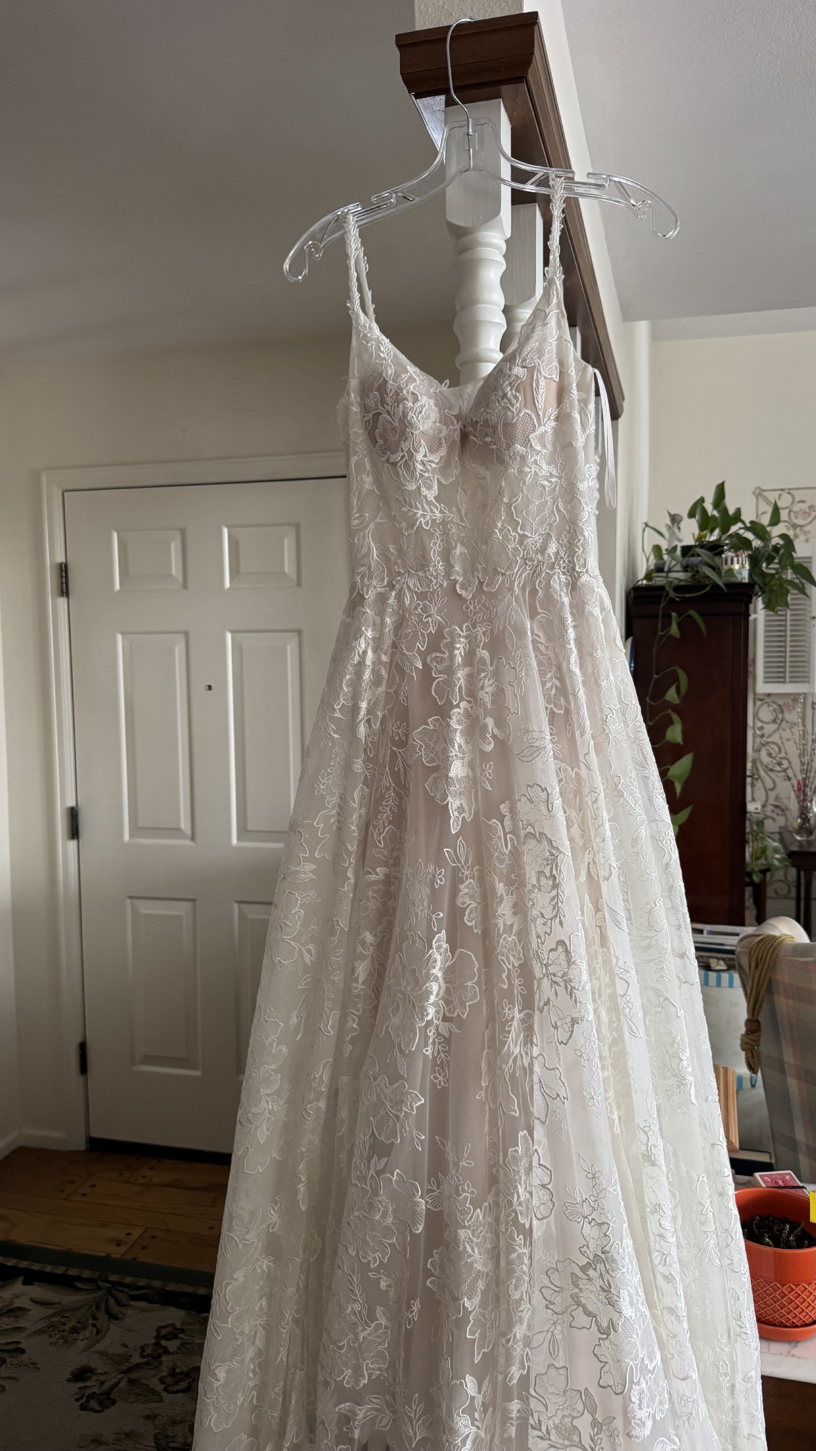 Beautiful 2022 dress bought from luv bridal and never got married in. It’s been put on but never worn for more than 20 min. (Belt in first photo not included with dress) Dress has beautiful lace flowers all over and a short train that would make it perfect for a spring or summer wedding. The back has a zip up for the bottom half and has buttons for the upper half. The bodice is not lined and is still see through but it’s an easy and inexpensive alteration. The short train has a strap so you can bustle it, strap as seen in one of the photos.