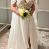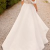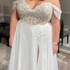 The gown has removable off-the-shoulder draped sleeves, allowing it to be worn with or without straps for two distinct looks. A flowing A-line skirt crafted from lightweight organza and tulle offers movement and comfort, with a tastefully adjusted side slit for ease of walking while maintaining a modest, timeless look.
