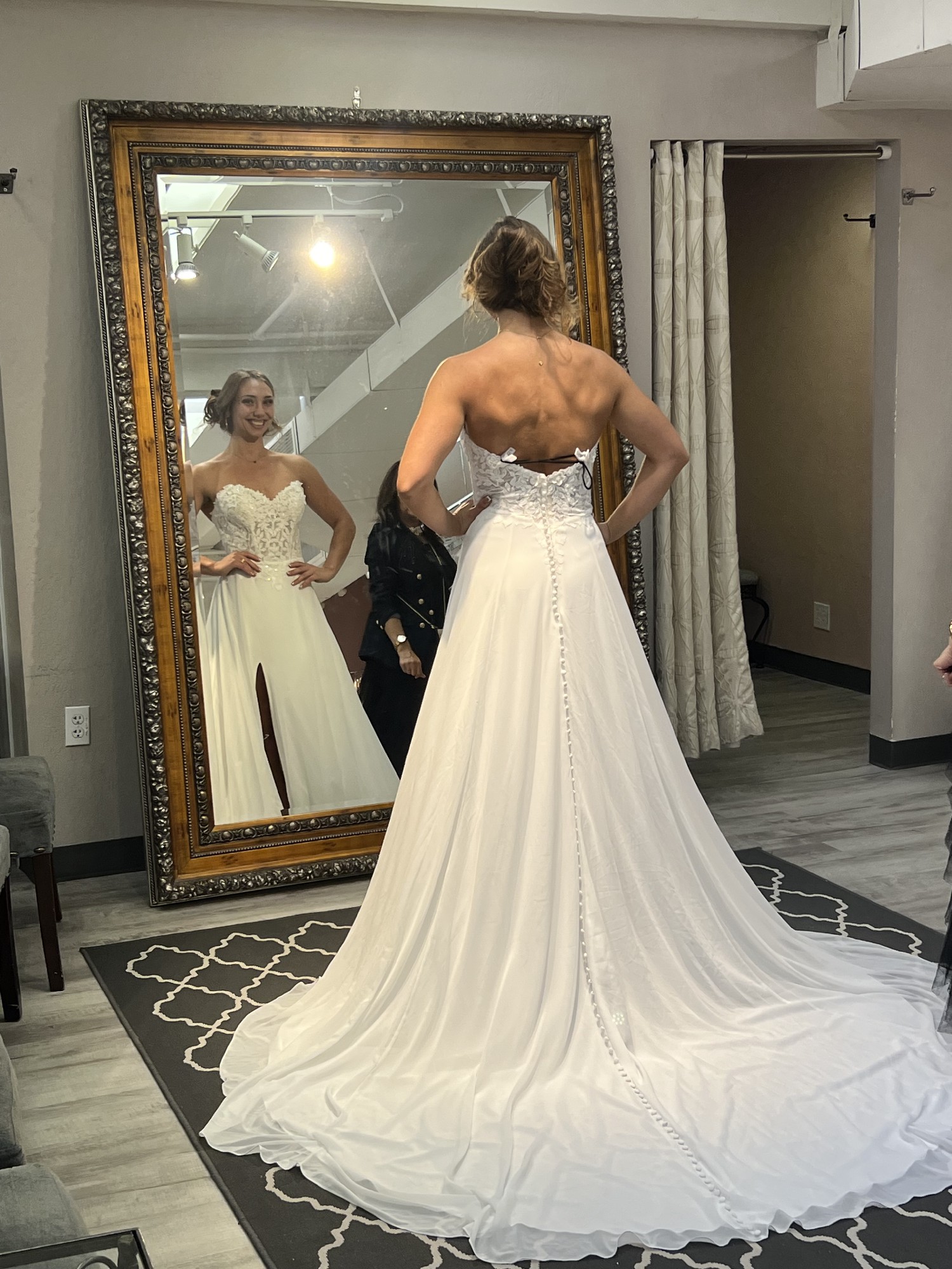 This gown is a standard Morilee size 6 with NO ALTERATIONS to the waist or bodice the measurements listed reflect my exact measurements on my wedding day, and the dress fit like a glove. I would love to keep it, but with a very small house and closet, I’m ready to pass it on to another bride. When I was dress shopping I searched high and low on Still White for something like this dress. Don’t miss this opportunity if this dress is speaking to you!