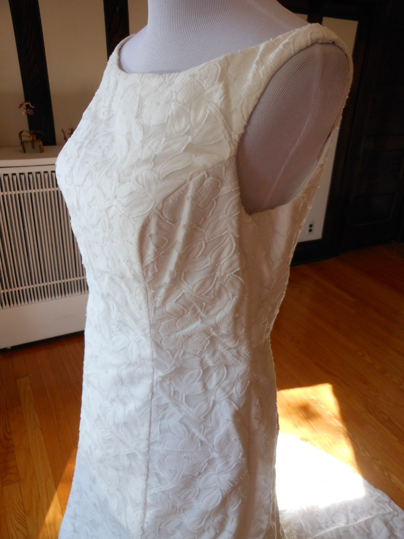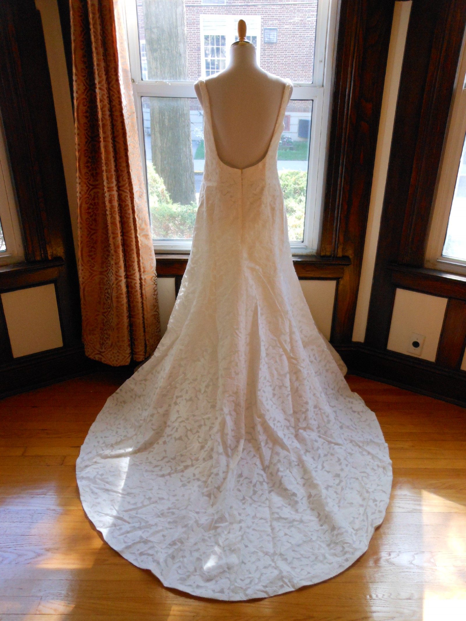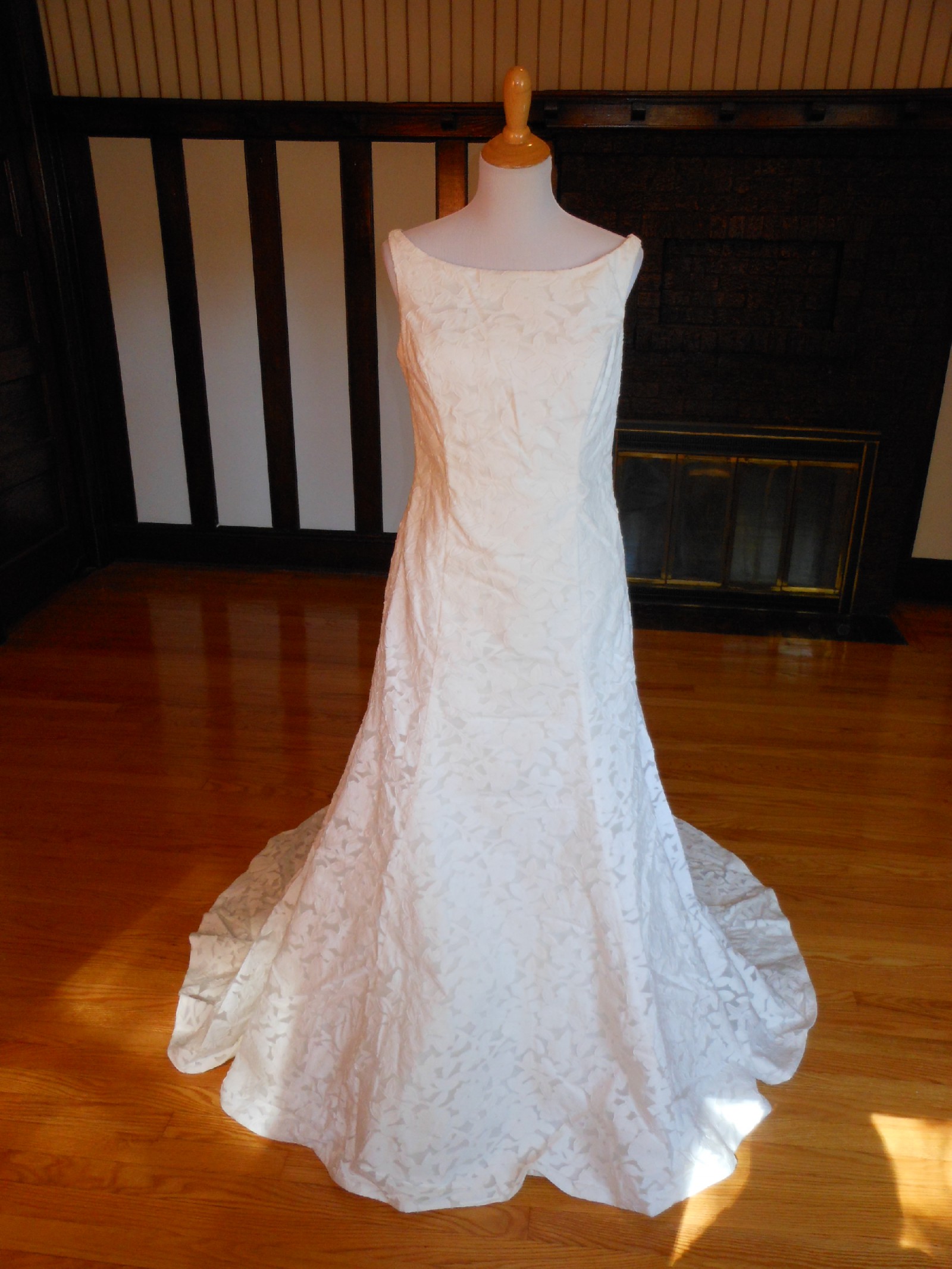 This is an Authentic PRONOVIAS Bridal Wedding Dress Gown. The name of the dress is DEBUT. It has a gorgeous fit and flare style with a fabulous long train. The gown is made of exquisite floral printed fabric. The bodice also has boning to build a perfect shape. The skirt has netting petticoat inside to support a fit and flare shape. This dress is brand new in great condition with the original label and tags. It was never worn.
