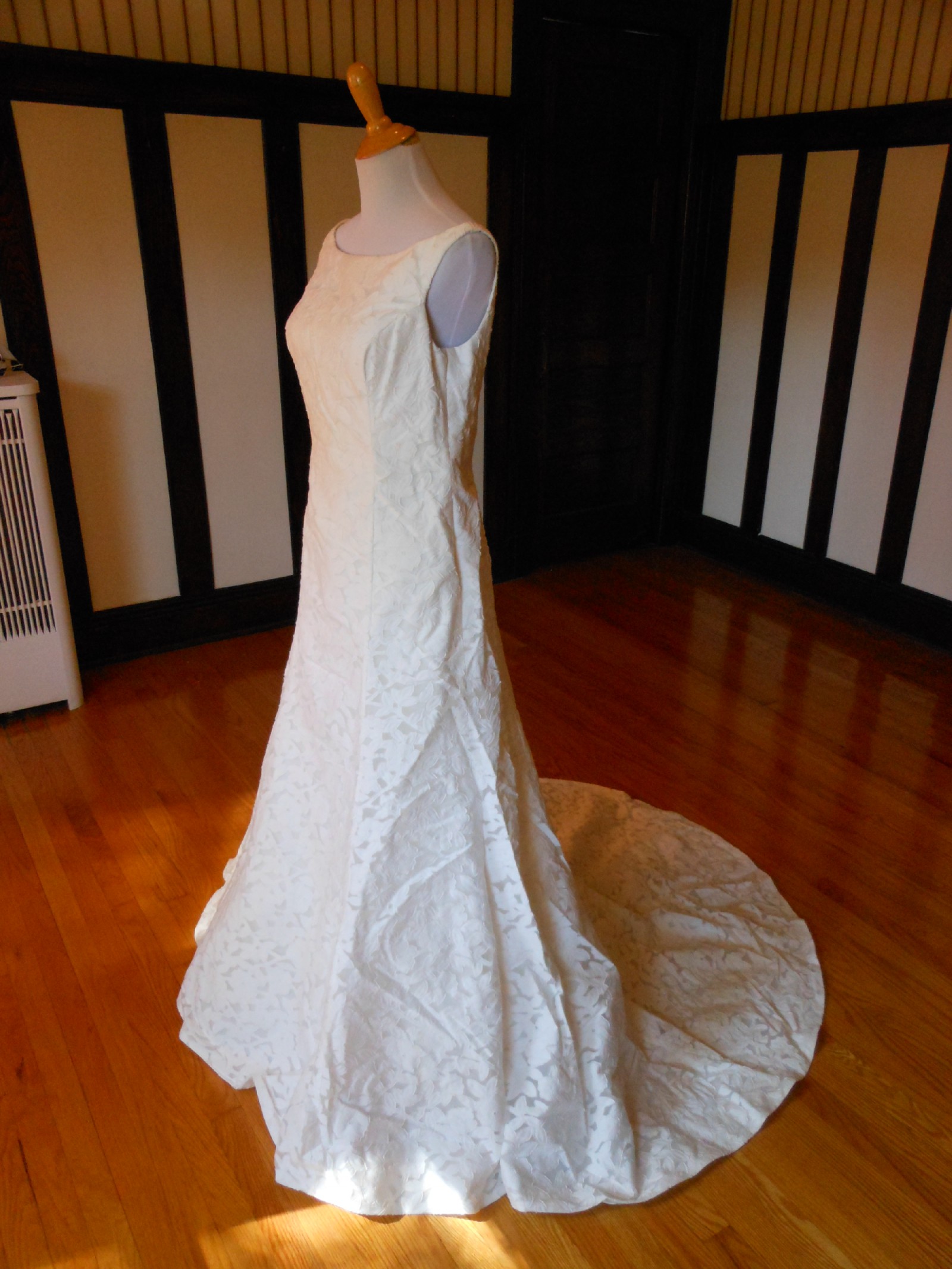 This is an Authentic PRONOVIAS Bridal Wedding Dress Gown. The name of the dress is DEBUT. It has a gorgeous fit and flare style with a fabulous long train. The gown is made of exquisite floral printed fabric. The bodice also has boning to build a perfect shape. The skirt has netting petticoat inside to support a fit and flare shape. This dress is brand new in great condition with the original label and tags. It was never worn.