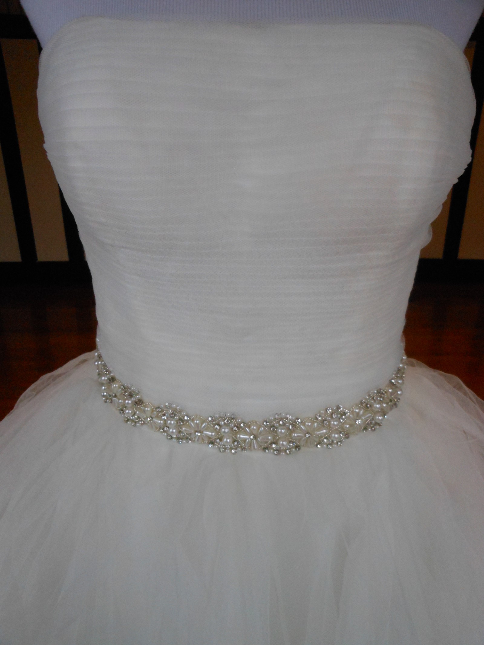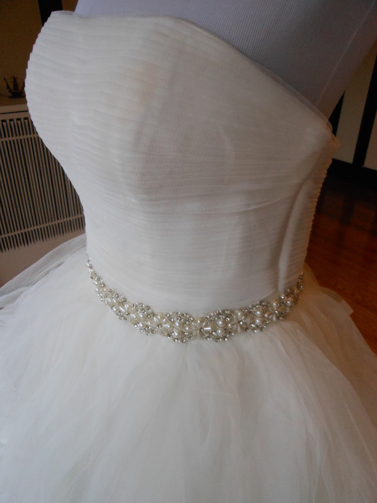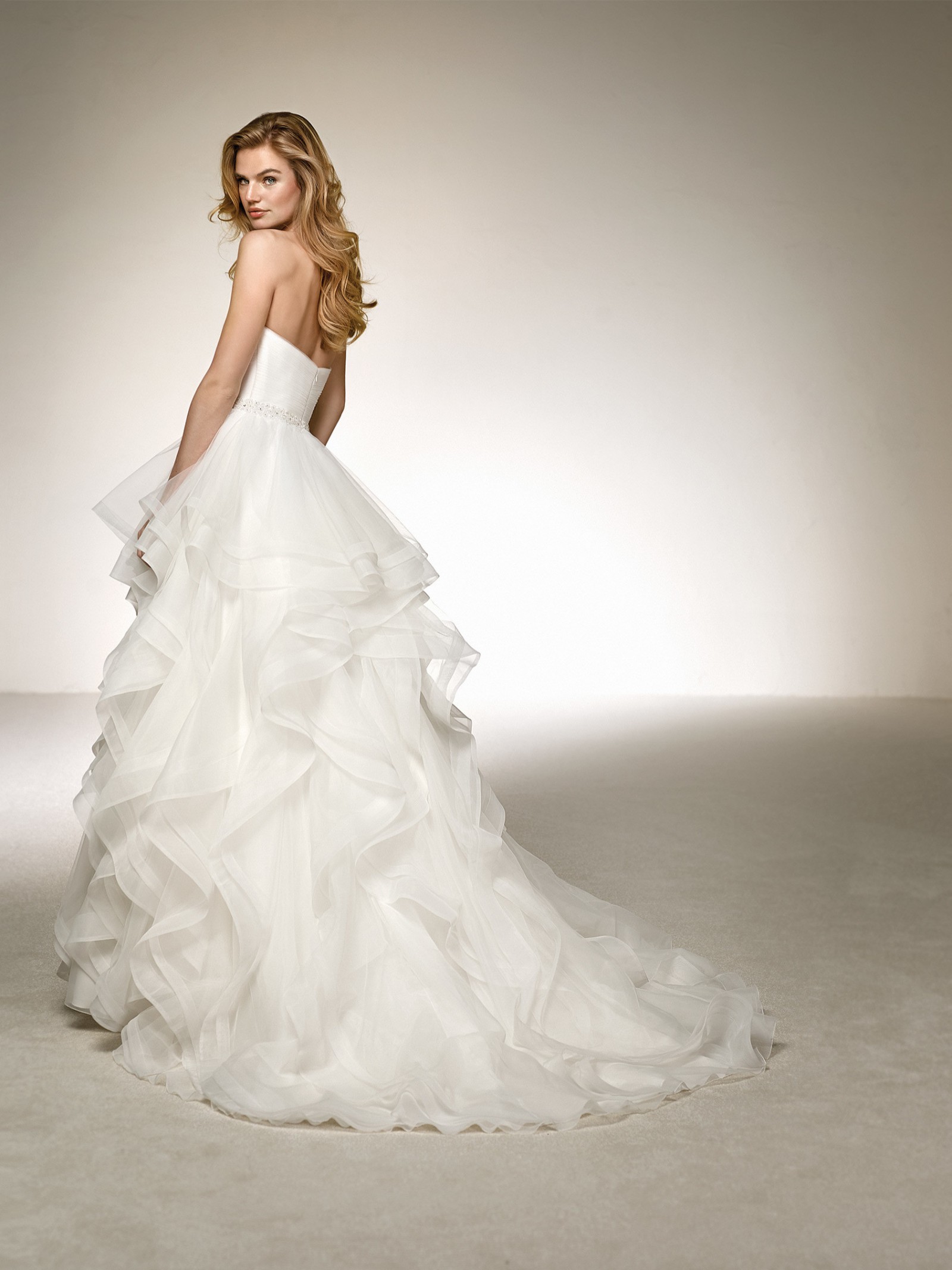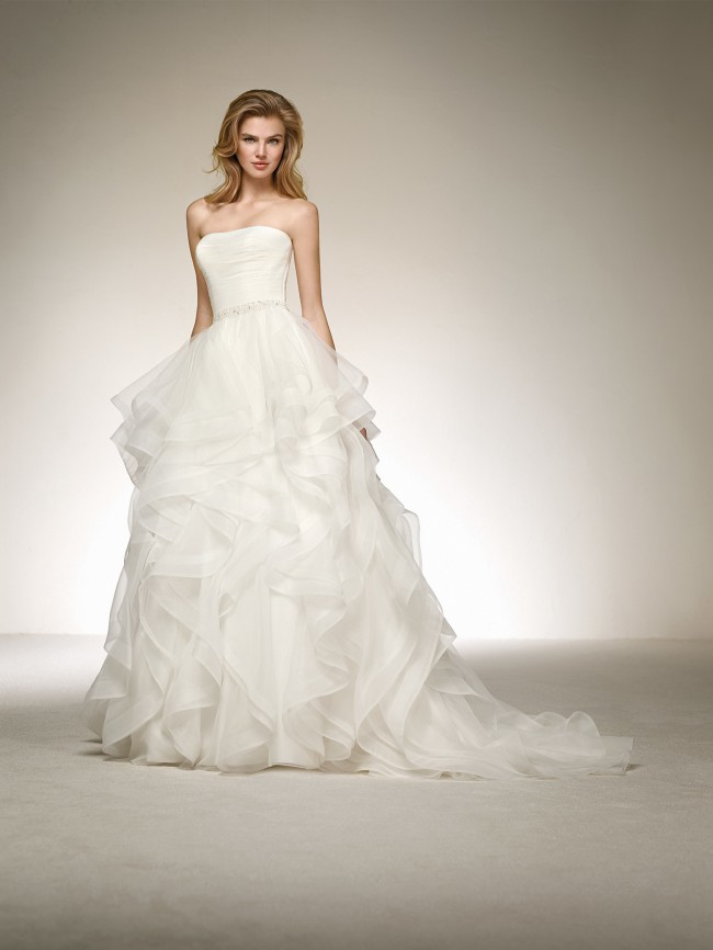 This is an Authentic PRONOVIAS Bridal Wedding Dress Gown. The name of the dress is DONCELLA. It has a gorgeous A line style with a fabulous layered skirt and chapel train. The waistline is embellished with exquisite crystals and beads. The bodice also has boning to build a perfect shape. The skirt has netting petticoat inside to support a full shape. This dress is brand new in great condition with the original label and tags. It was never worn.