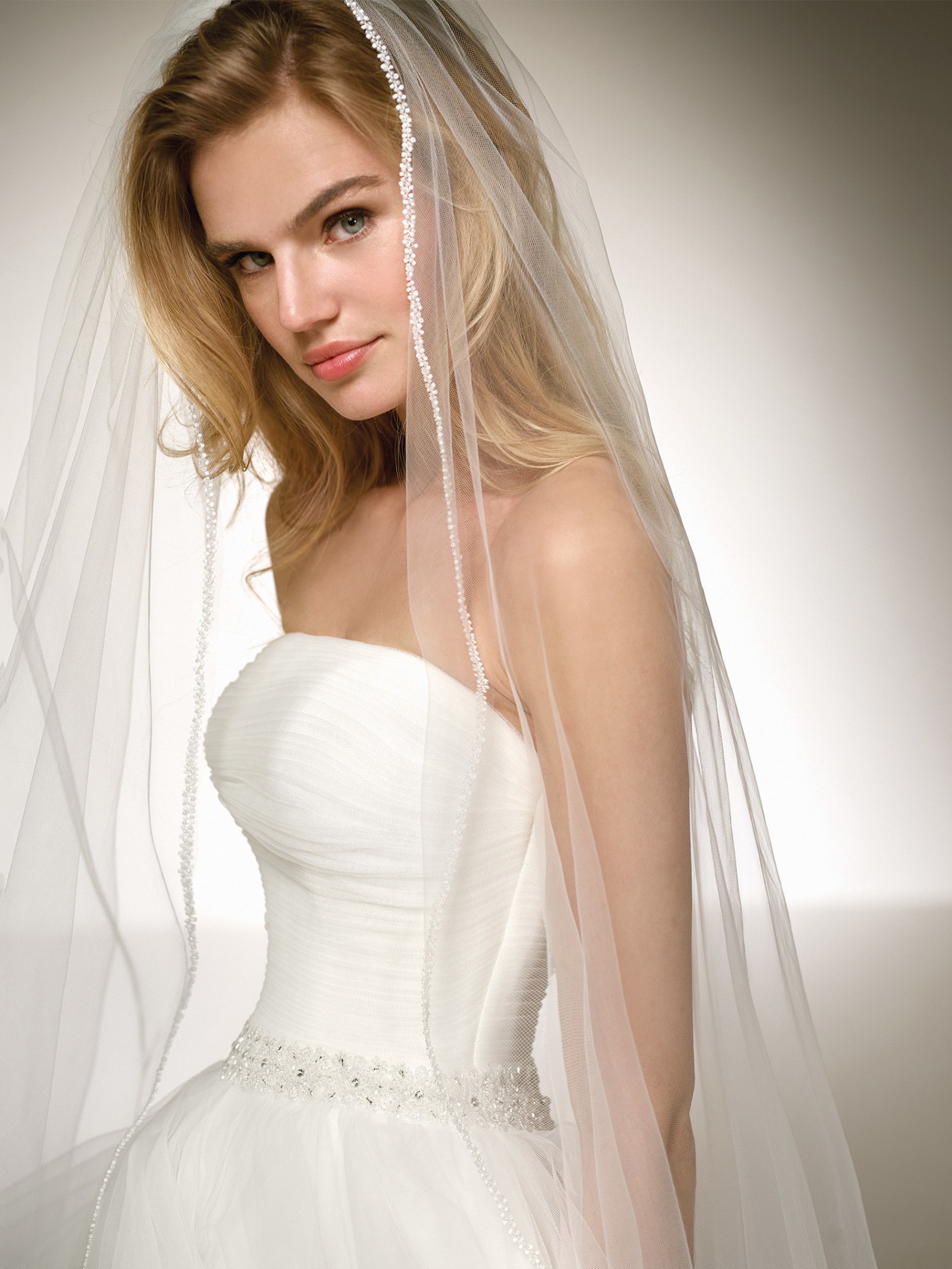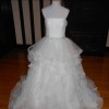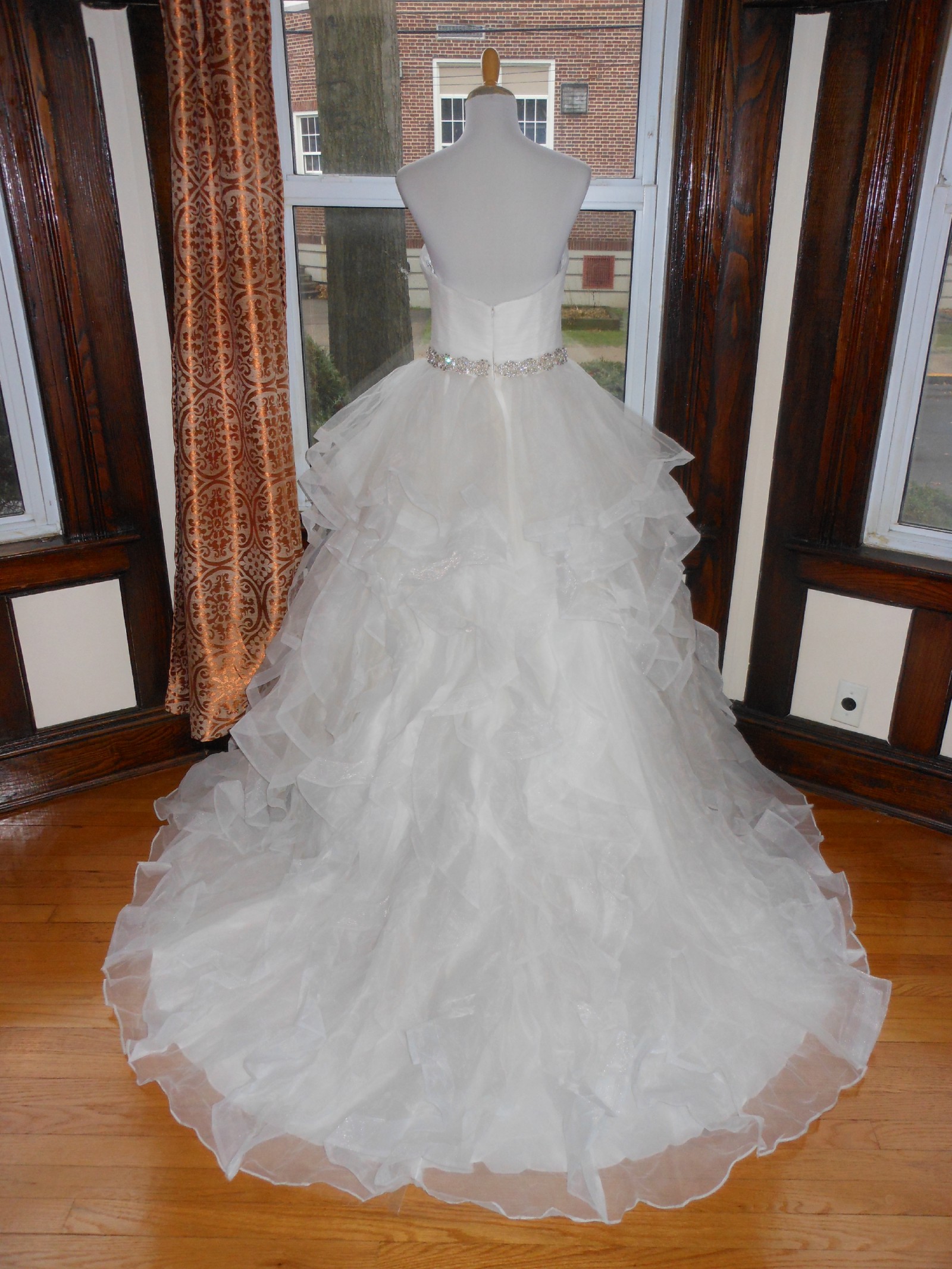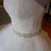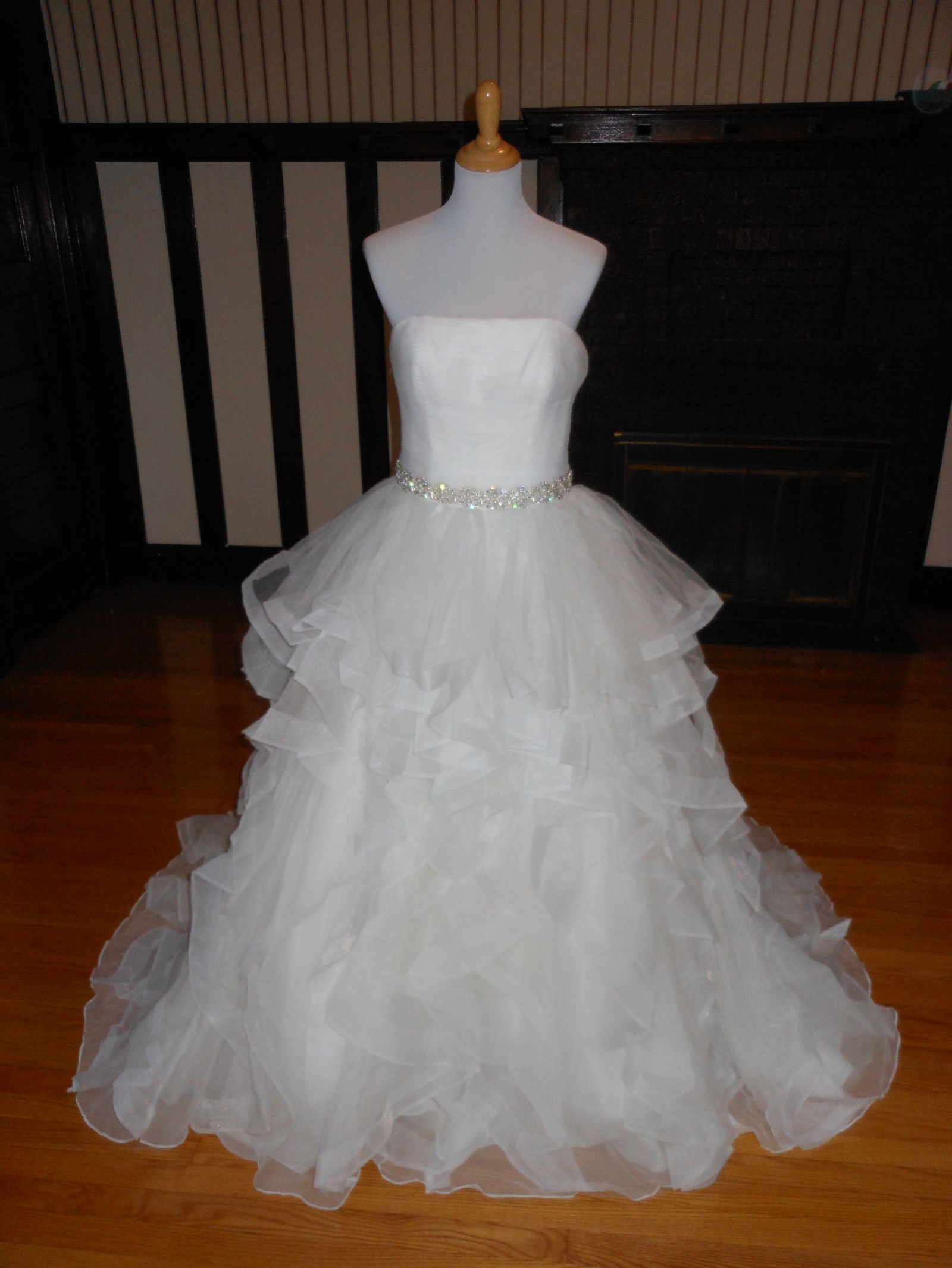 This is an Authentic PRONOVIAS Bridal Wedding Dress Gown. The name of the dress is DONCELLA. It has a gorgeous A line style with a fabulous layered skirt and chapel train. The waistline is embellished with exquisite crystals and beads. The bodice also has boning to build a perfect shape. The skirt has netting petticoat inside to support a full shape. This dress is brand new in great condition with the original label and tags. It was never worn.