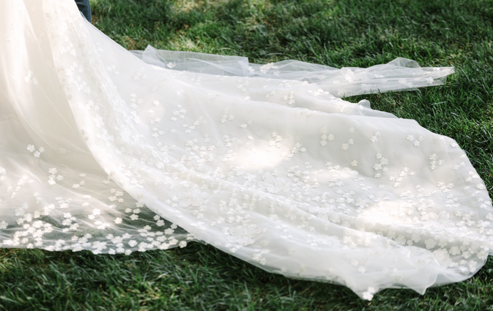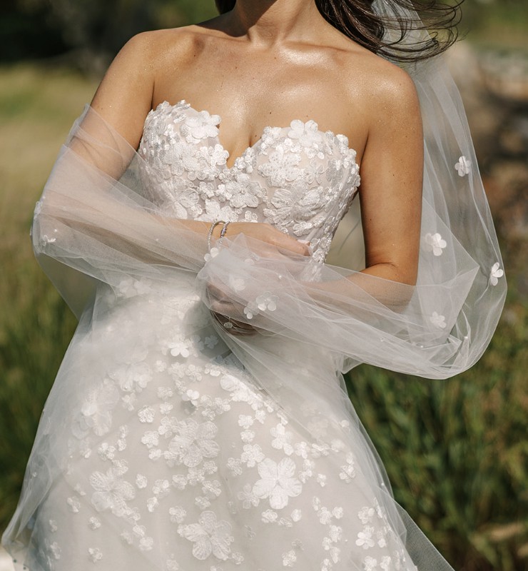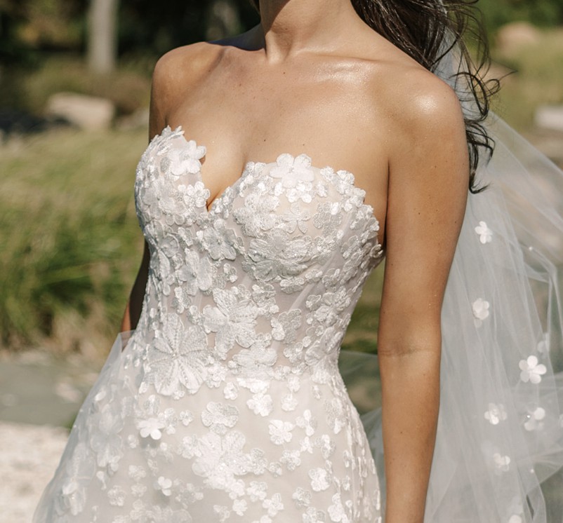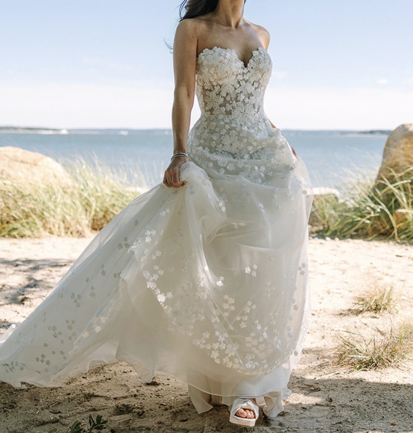 Gorgeous custom Mira Zwillinger dress. Sweetheart strapless A-line gown with delicately scattered florals throughout. Top was made custom to be sheerless. This dress retails for $15,500 now.