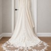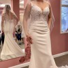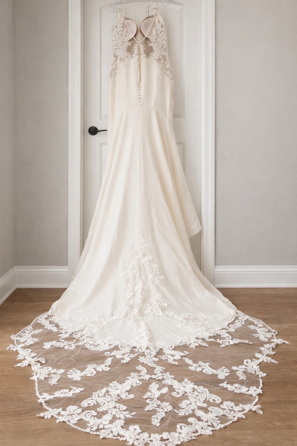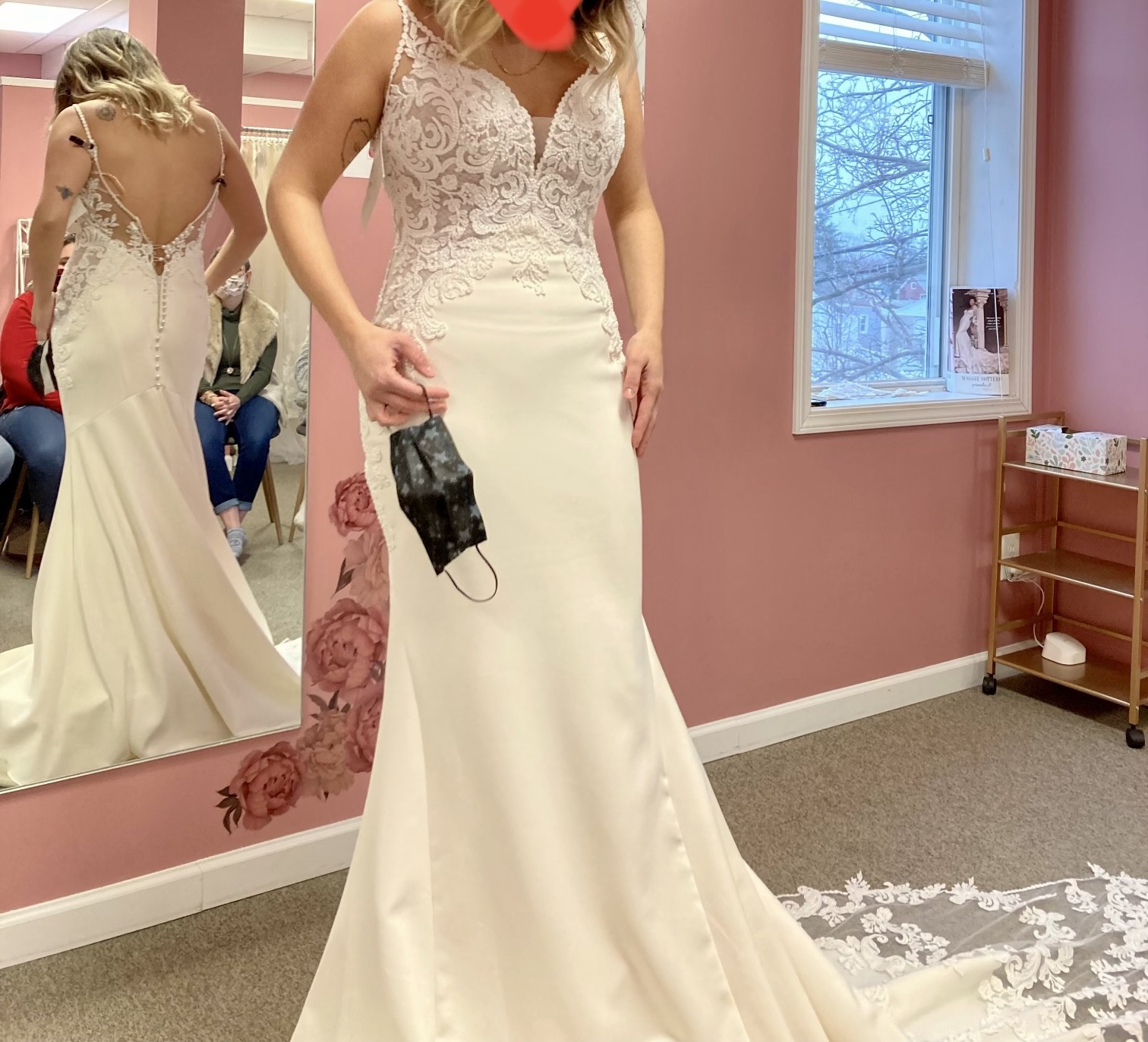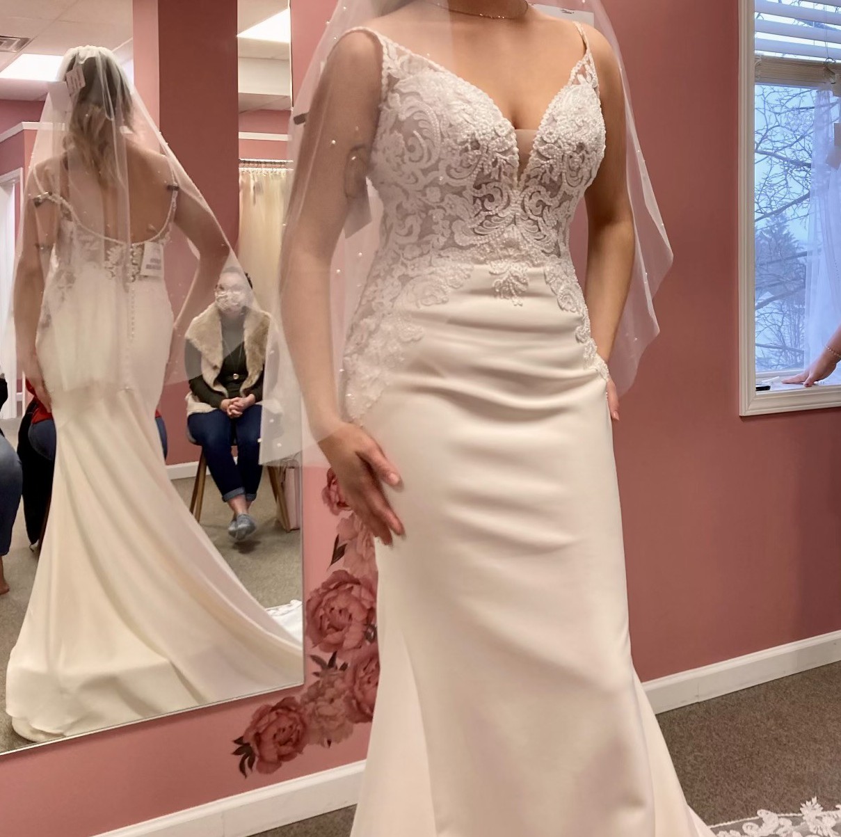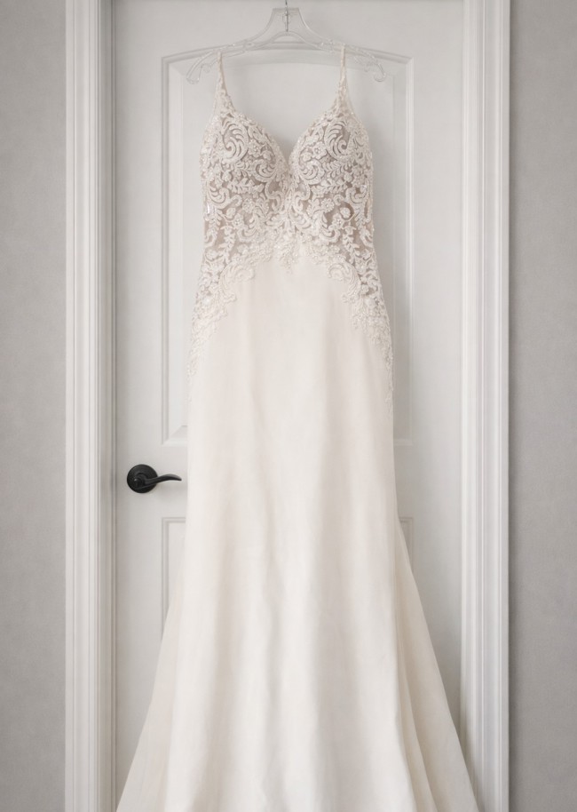 The Maggie Sottero Style #20MS678 "Nikki" wedding dress is a luxuriously bohemian and romantic mermaid gown featuring a beaded lace bodice, deep V-neckline, and an extended scalloped illusion lace train.