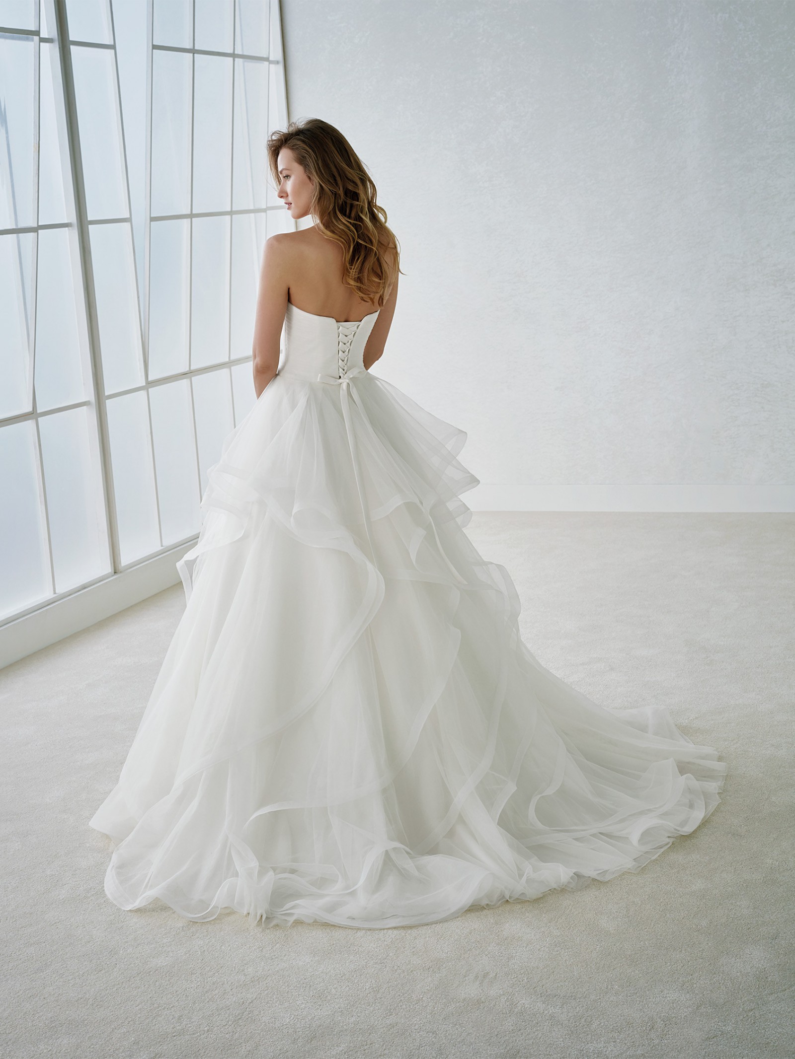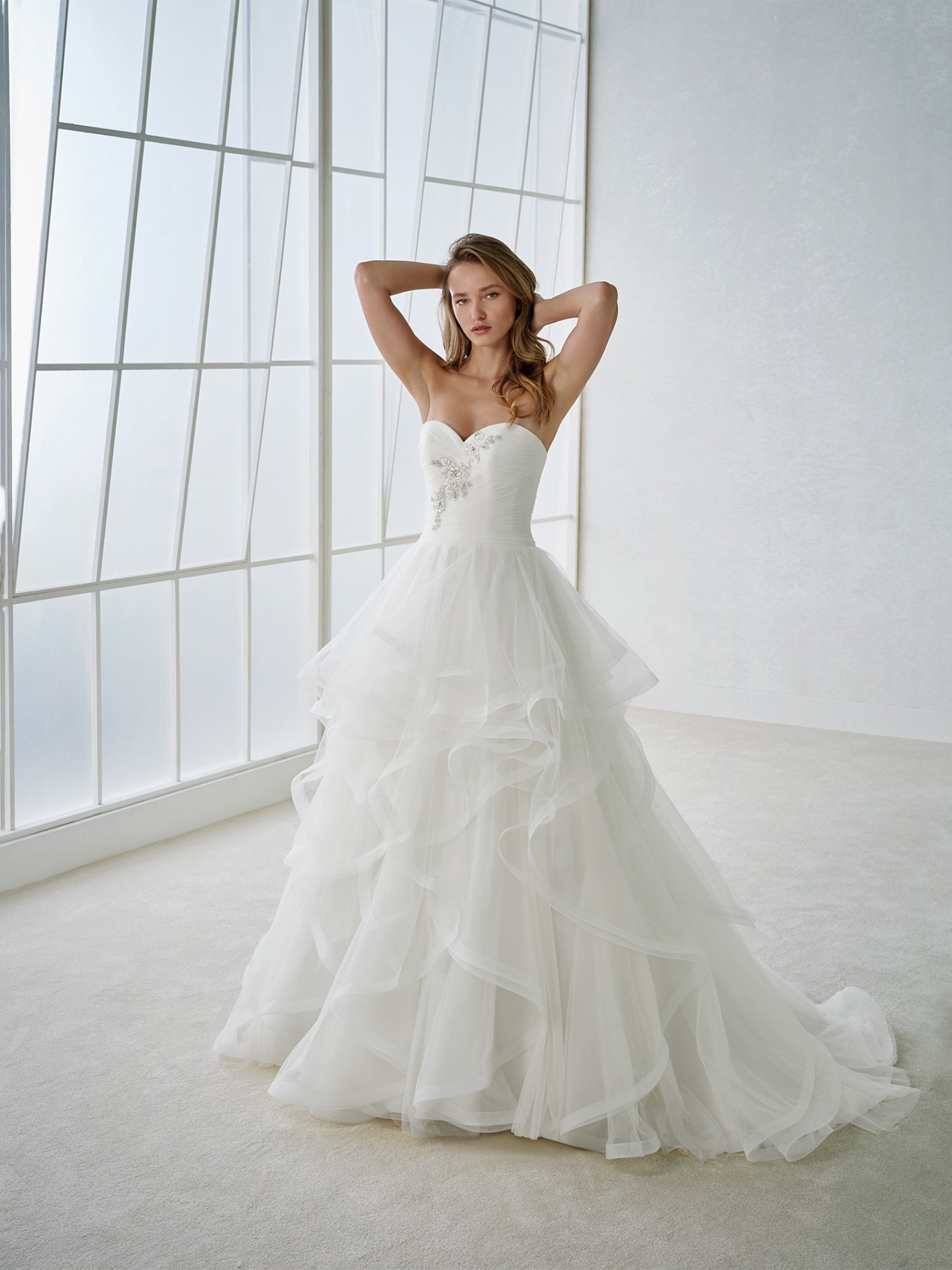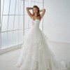 This is an Authentic WHITE ONE by PRONOVIAS Bridal Wedding Dress Gown. The name of the dress is FLORIANA. It has a gorgeous A line style with a fabulous layered skirt and a chapel train. The dress is embellished with exquisite floral embroidery, and sparkling crystals and beads on the front. The bodice also has boning to build a perfect shape. The skirt has netting petticoat inside to support a full shape. This dress is brand new in great condition with the original label and tags. It was never worn.