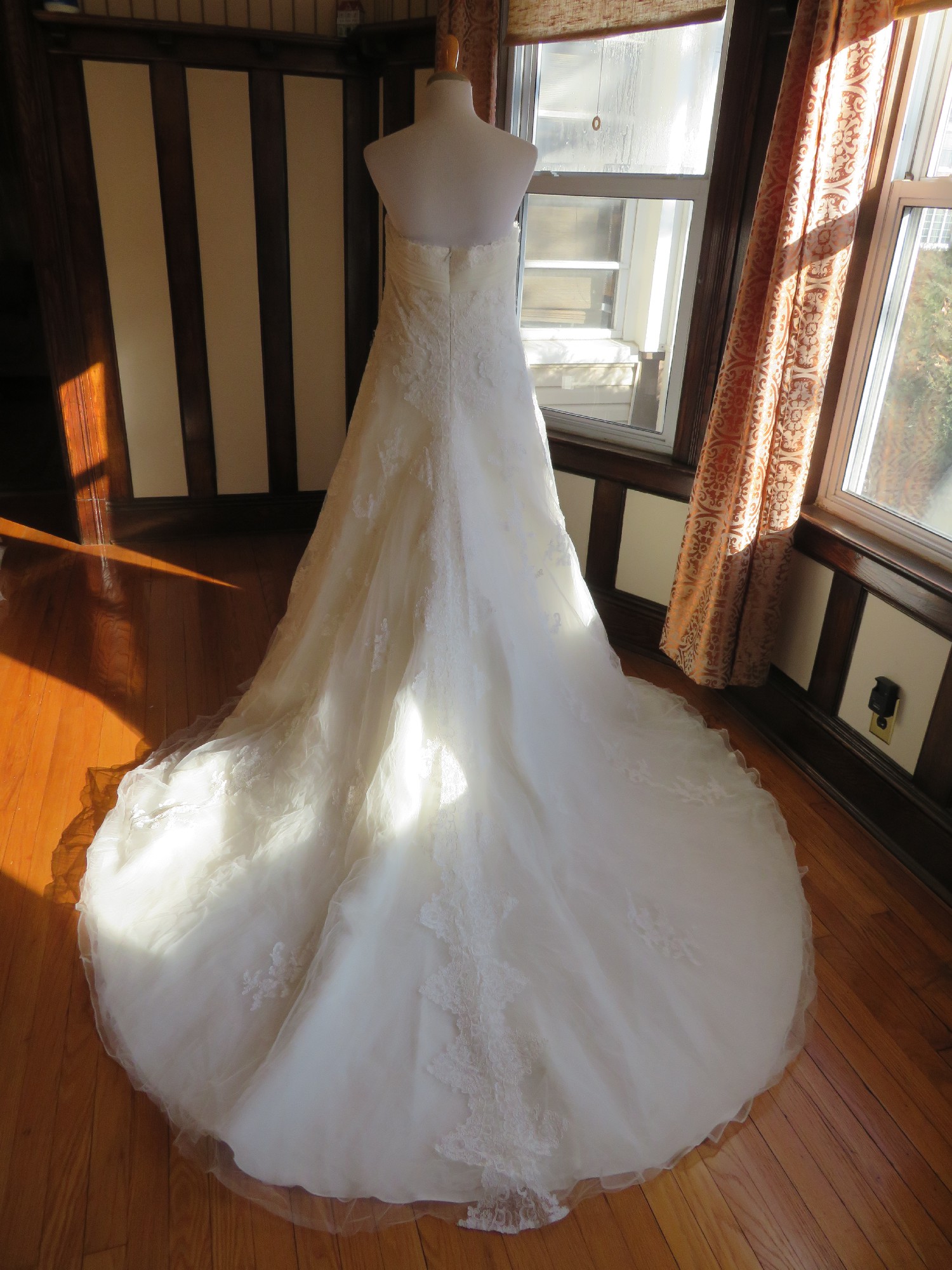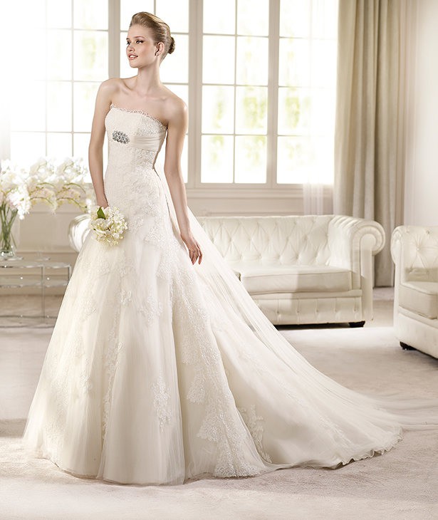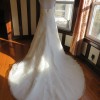 This is an Authentic SAN PATRICK by PRONOVIAS Bridal Wedding Dress Gown. The name of the dress is RIAZA. It has a gorgeous A line style with a fabulous long train. The entire gown is embellished with exquisite floral lace, and stunning crystals and sparkling beads/sequences under the bust. The bodice also has boning to build a perfect shape. The skirt has netting petticoat inside to support a full shape. This dress is brand new in great condition with the original label and tags. It was never worn.