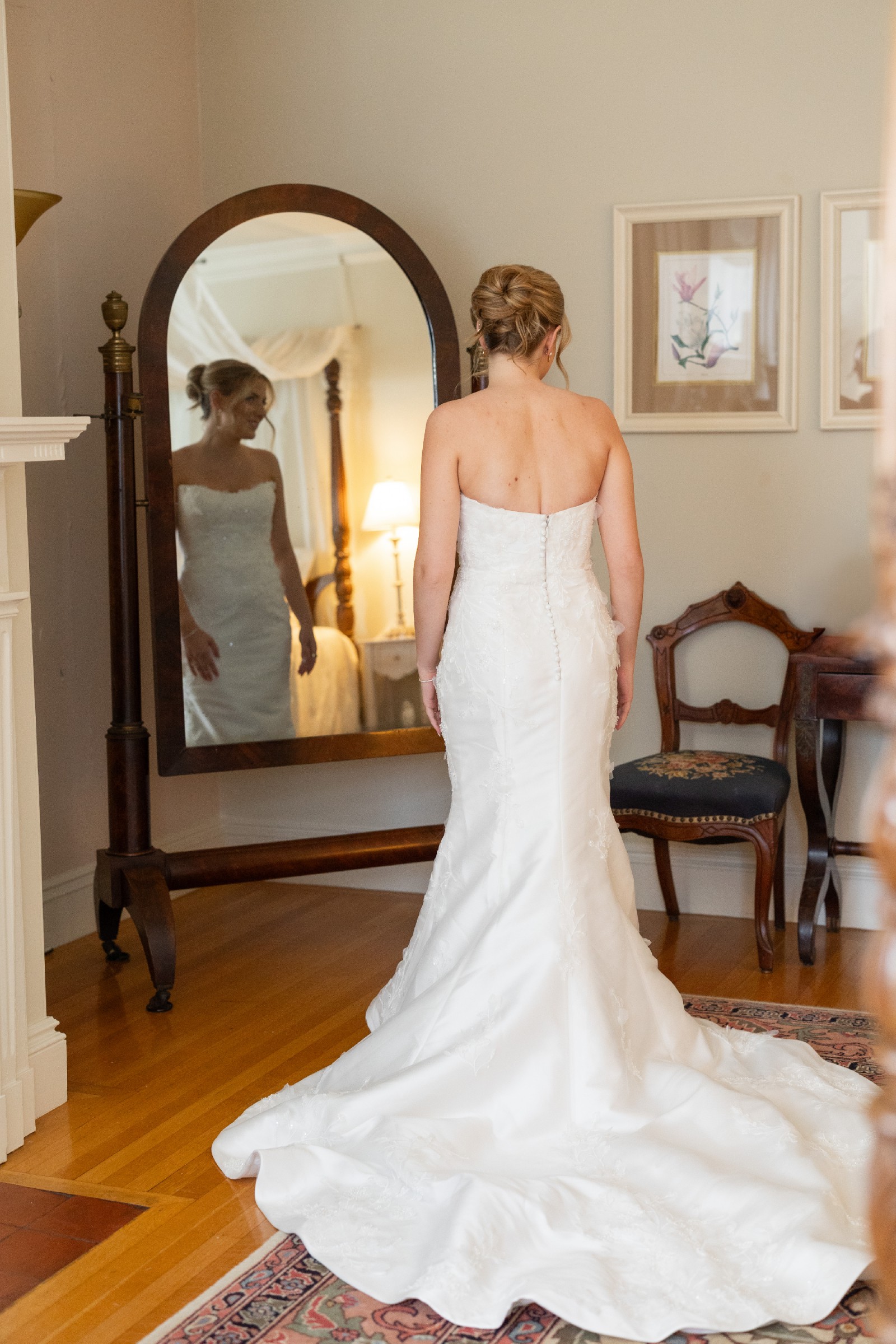 - Hem shortened, bust cups added, taken in at bust, bustle added