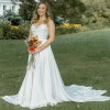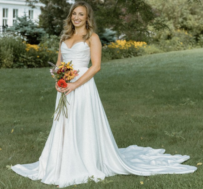 This is the Jenny Yoo Kennedy gown, featuring a classic A-line silhouette in smooth satin with a structured, ruched bodice and an off-the-shoulder neckline that sits beautifully across the shoulders and collarbone. The dress includes removable arm swags, a side slit for ease of movement, and a chapel-length train. It closes with an invisible back zipper and has a clean, elegant look that photographs very well.