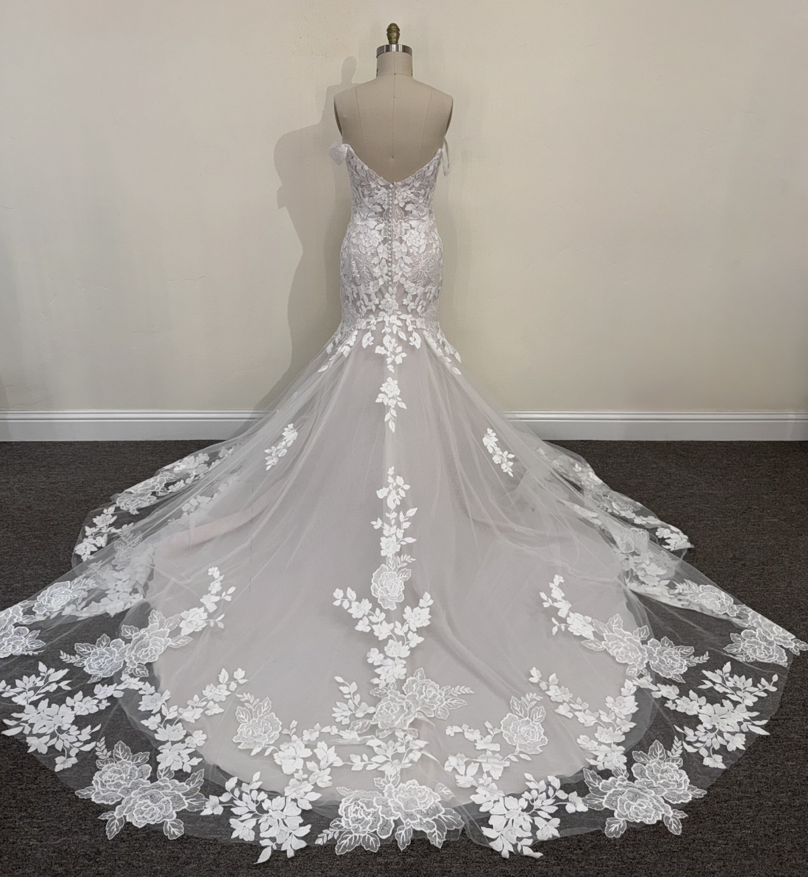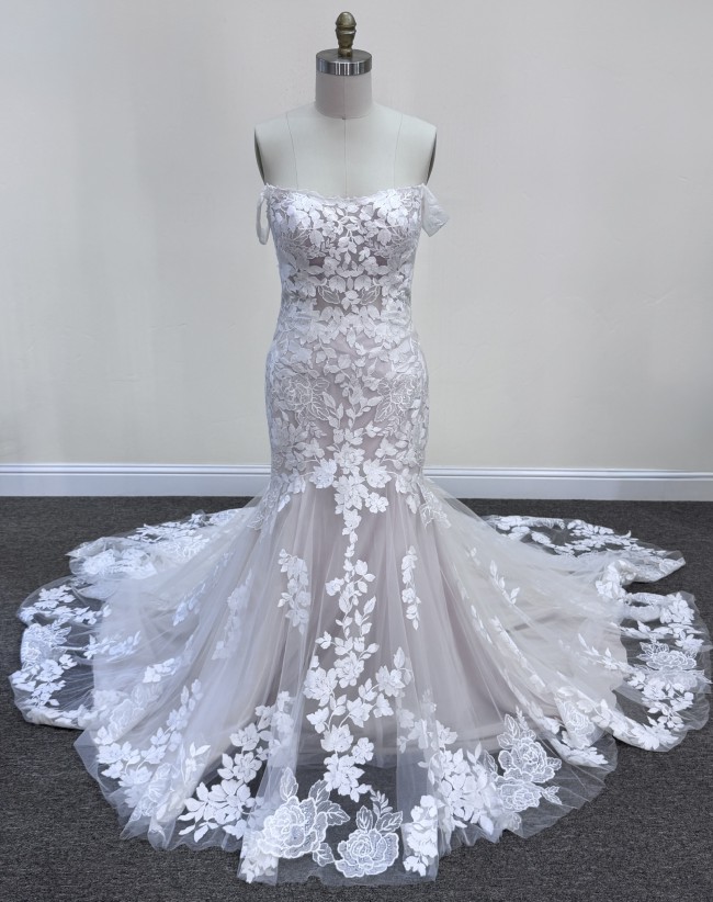 This Cambria dress by Maggie Sottero is the epitome of elegance and romance, designed to make your special day unforgettable. Crafted in a stunning ivory lace, this fit and flare silhouette hugs your curves in all the right places, creating a breathtaking hourglass shape. The off-the-shoulder neckline adds a touch of sophistication, accentuating your collarbone and shoulders while offering a timeless allure.