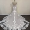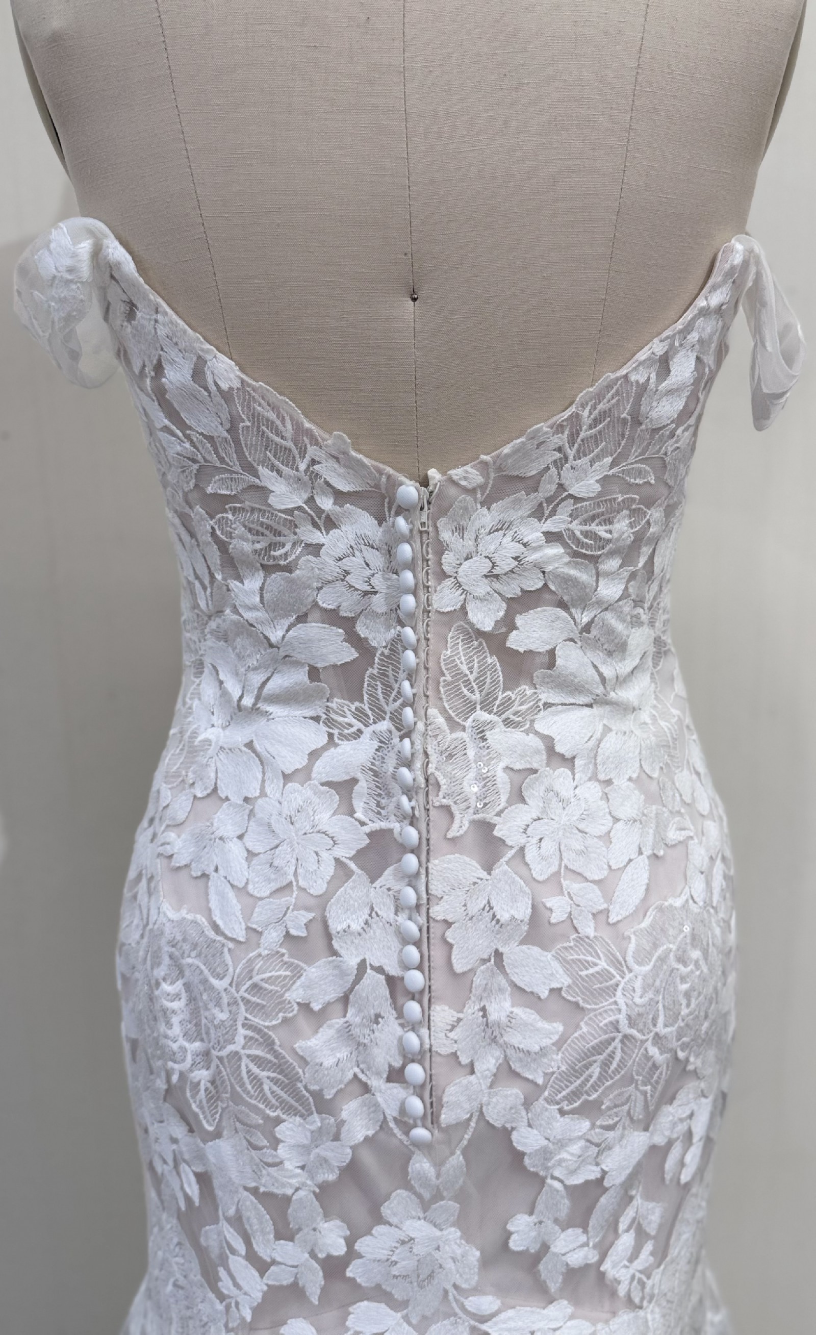 The intricate detailing of the lace is embellished with delicate floral patterns, bringing a whimsical charm to the overall design. As you walk down the aisle, the floor-length hem drapes gracefully, ensuring you radiate confidence and beauty with every step. Size 12, has not been altered or tried on.