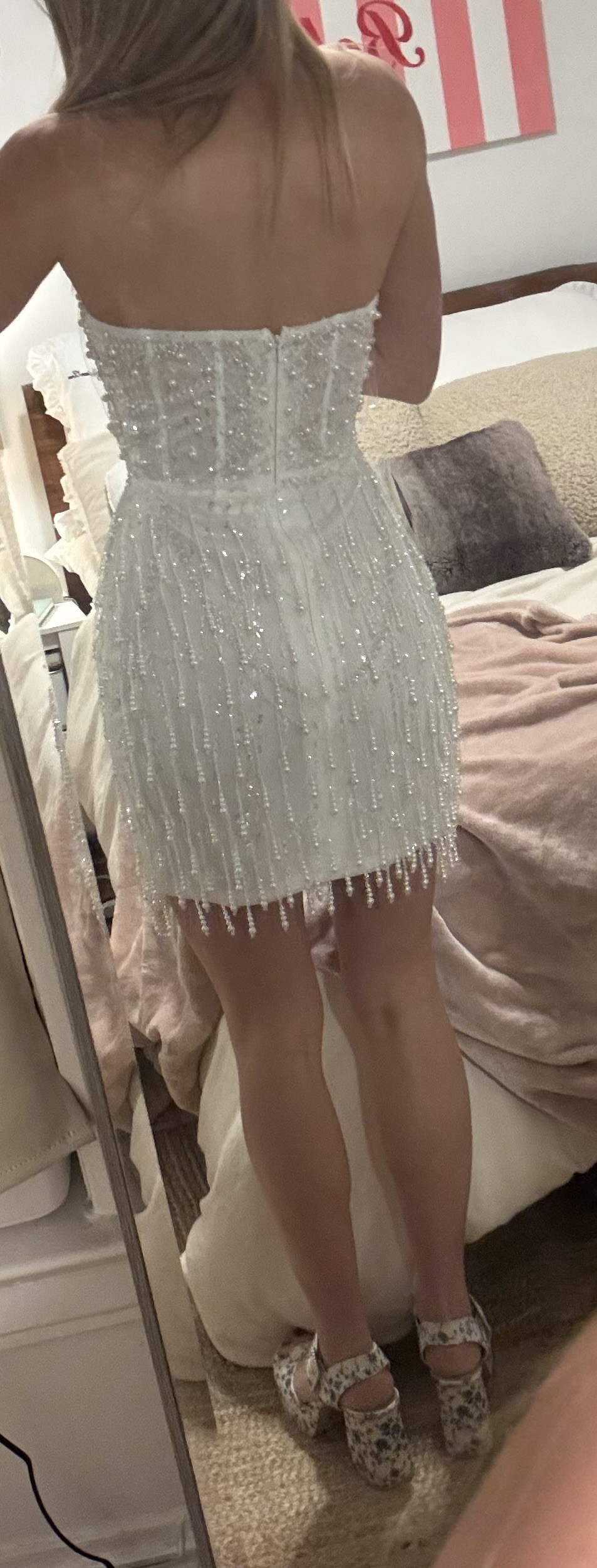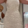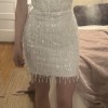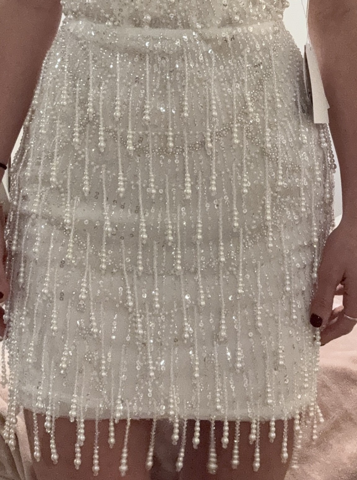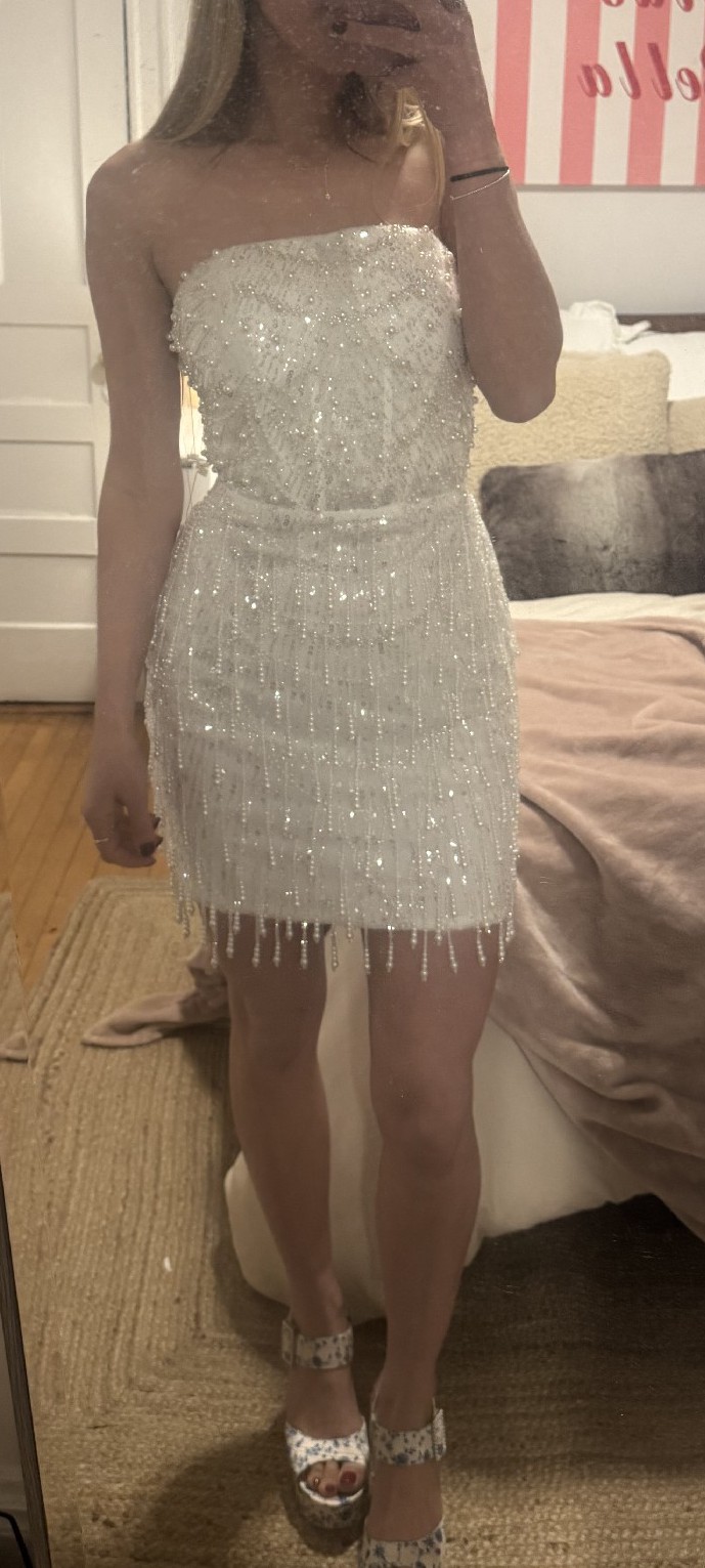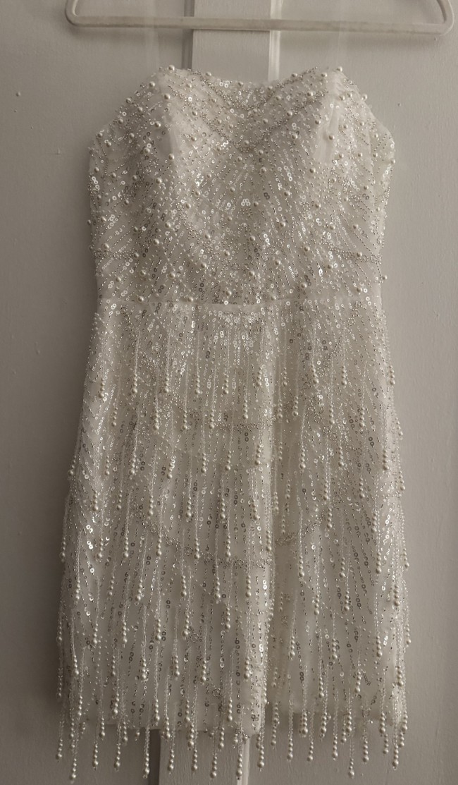 The dress has never been worn still has tags! This is such a fun short second look dress! It’s Hand beaded with a semi sheer top. I just ended up going with a long dress for my reception but I’m so sad I didn’t get to wear this. The beading moves when you dance!!