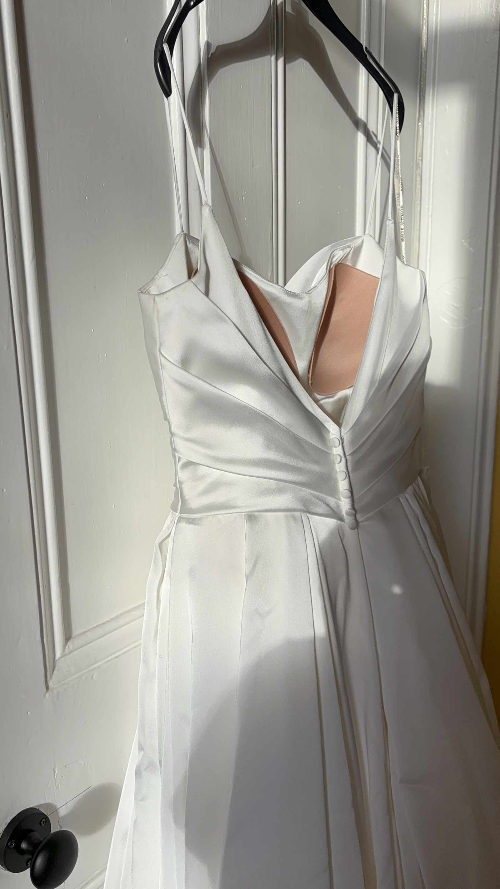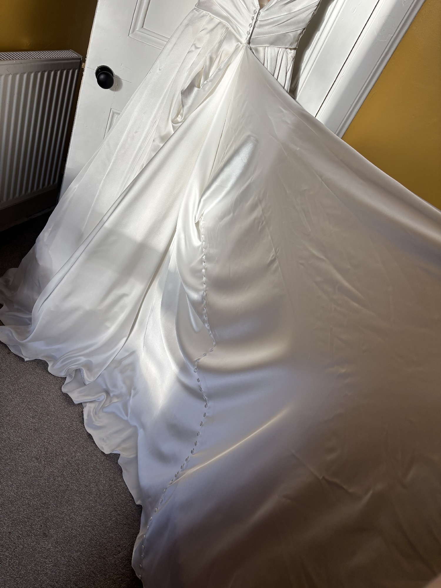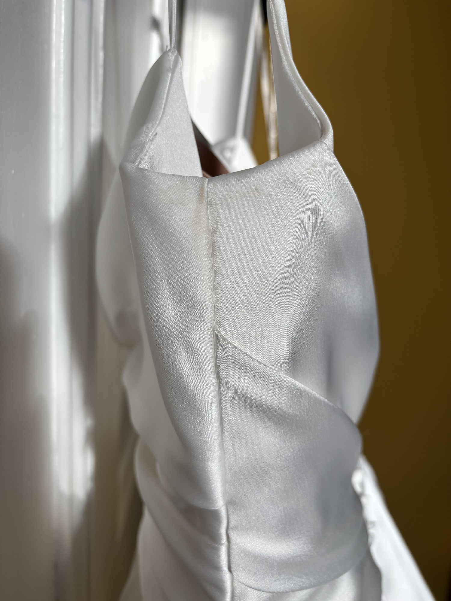 This dress has been unaltered except for two thin strands that have been added to form an optional bustle.