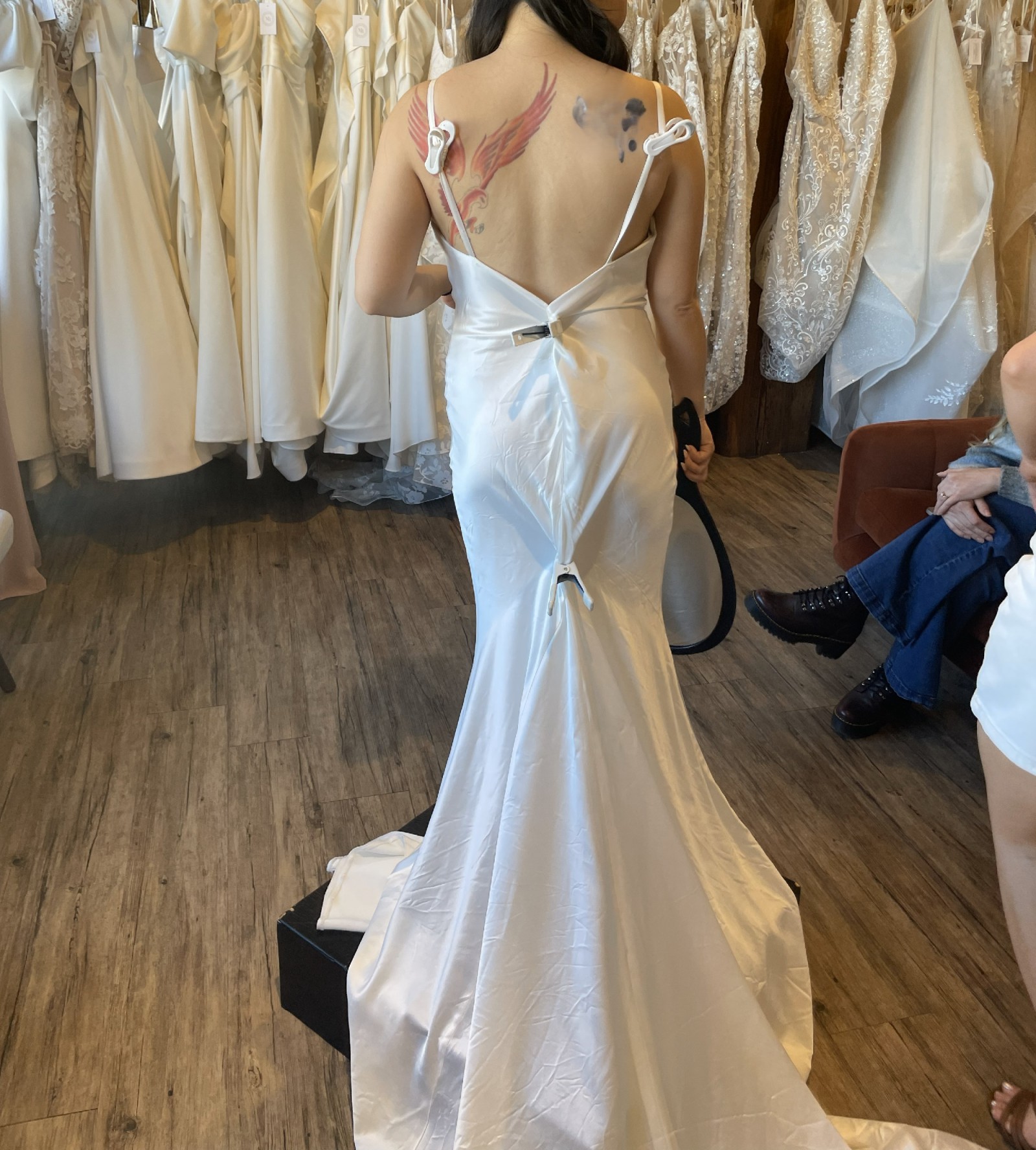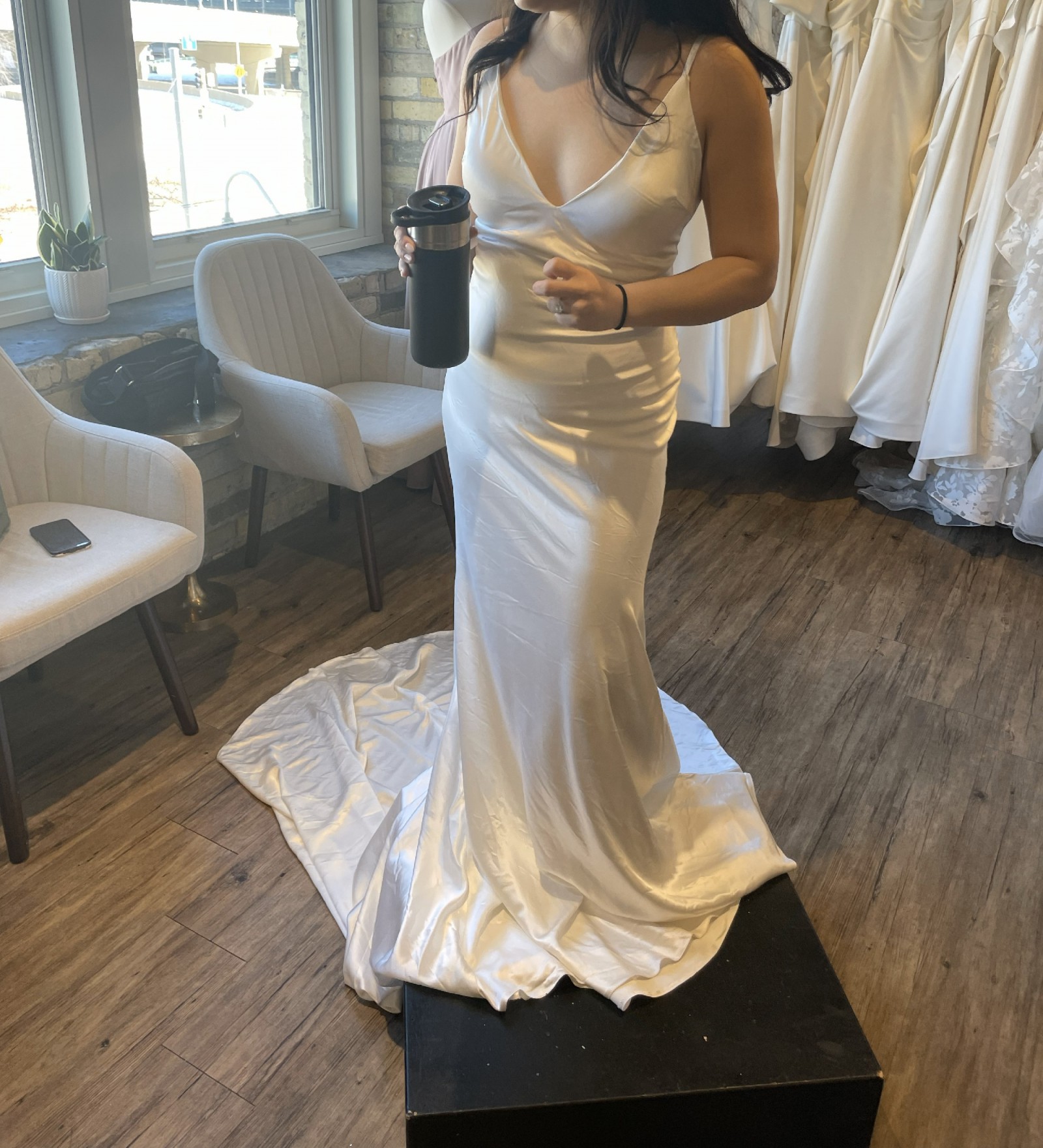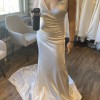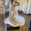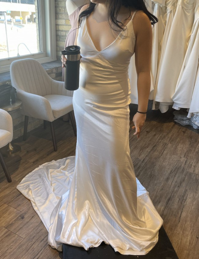 (Owner description: Elegant satin slip gown is spaghetti strapped with a v-neck. Back of gown has a low back; back of gown has extra length that flows into a train. May be easily rounded if this additional length is not desired. Zippered back. May be easily shortened to desired length.