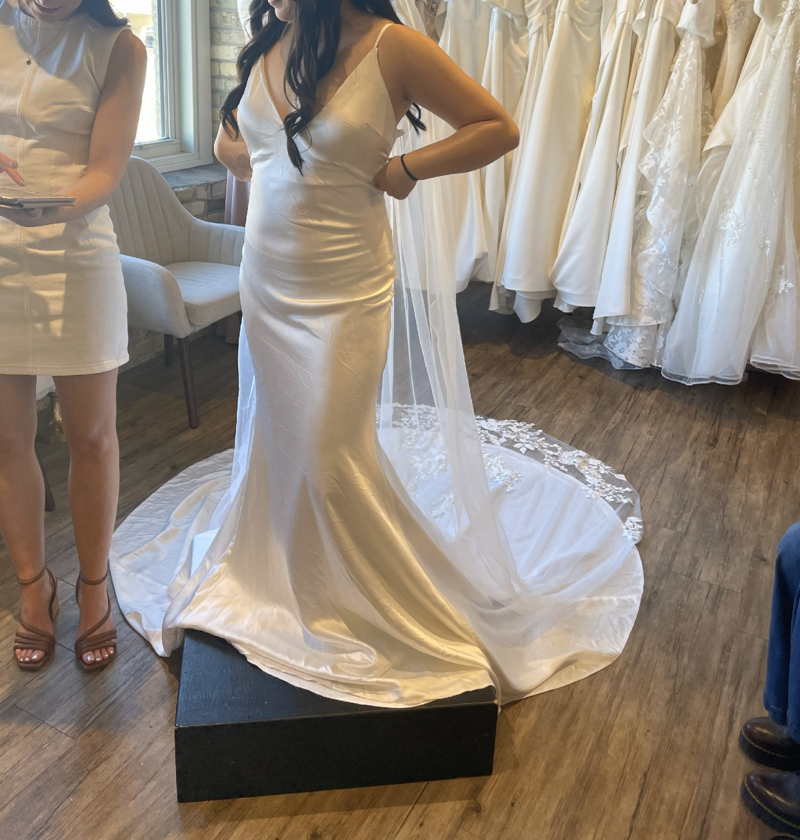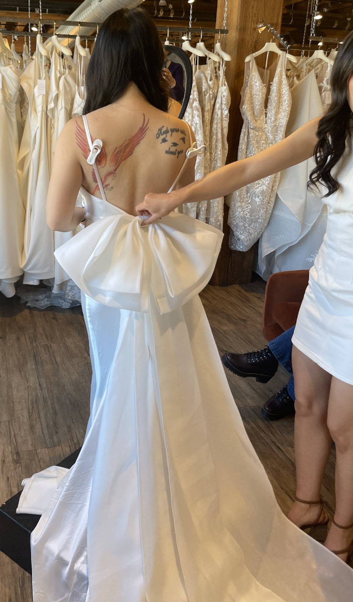 Never worn/Bride-to-be cancelled engagement/Tags still on. Versatile classic style. Lots of options with optional bow and veil.