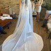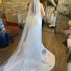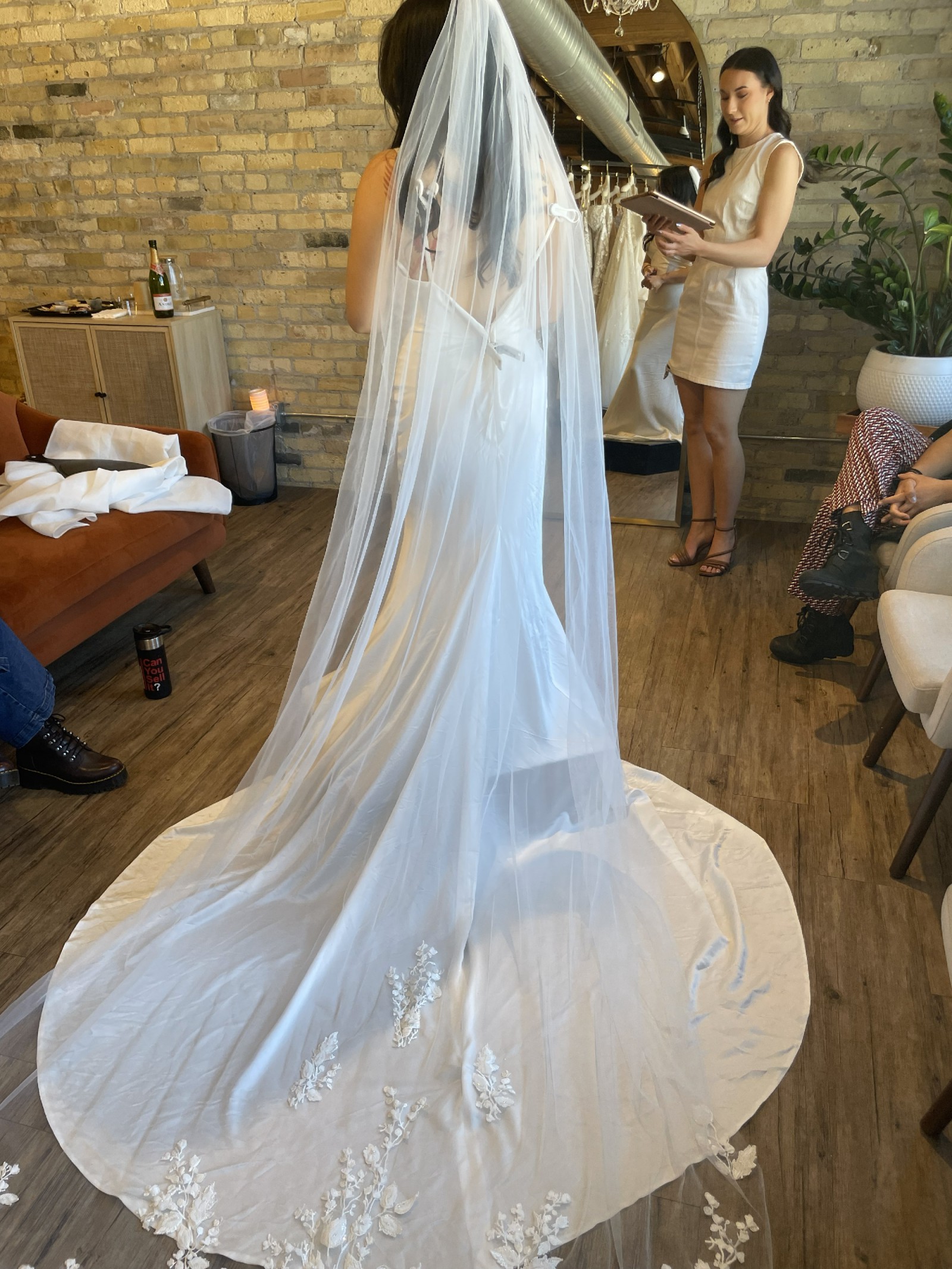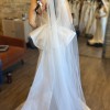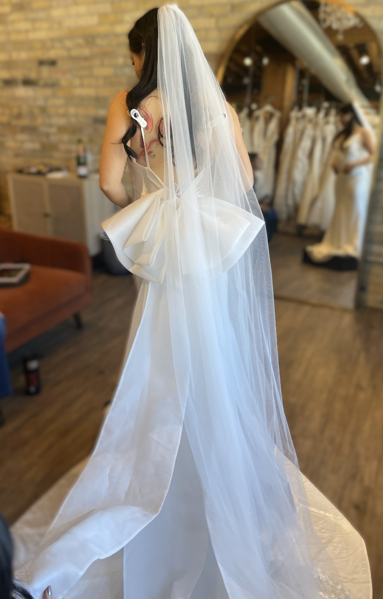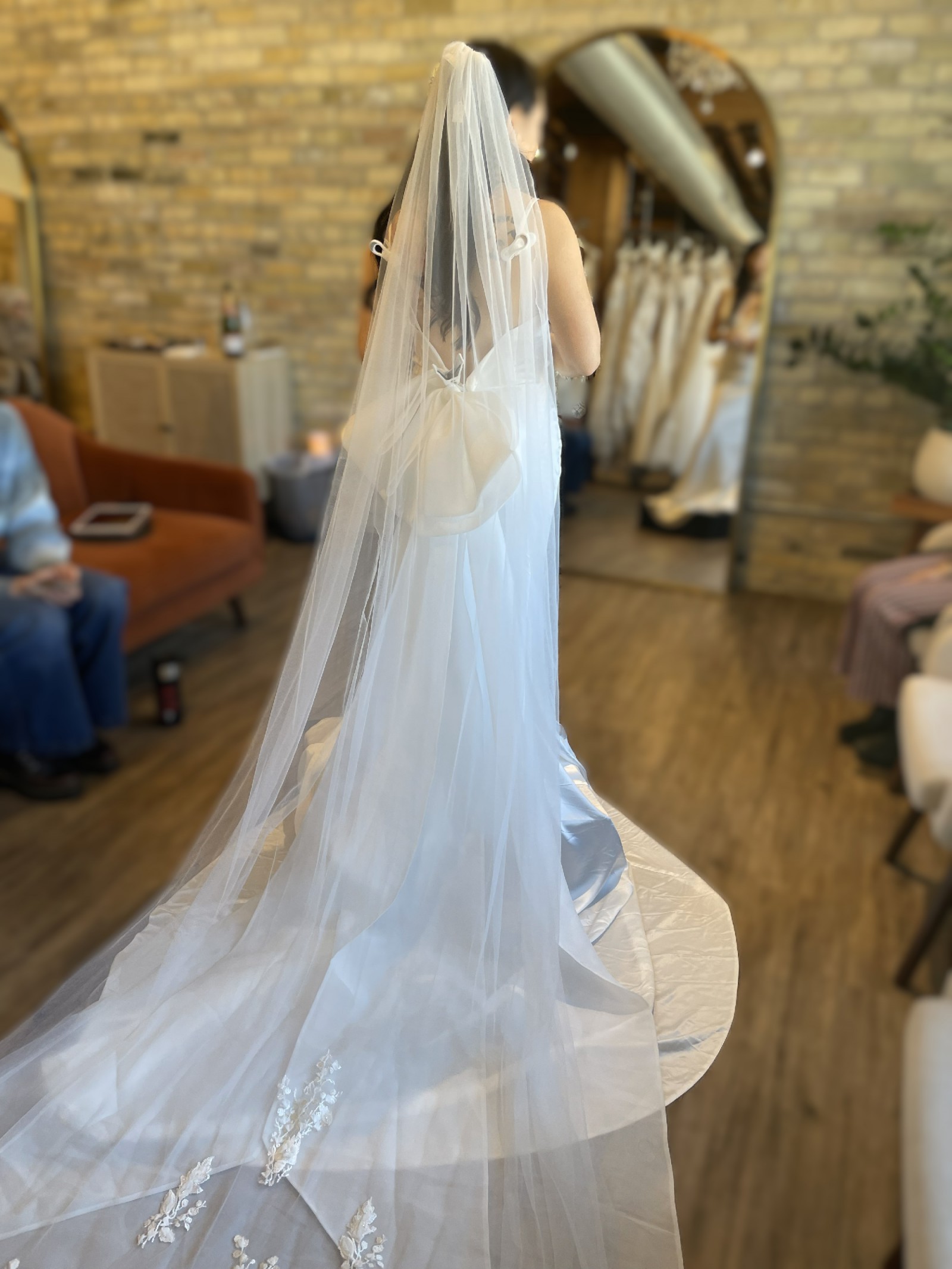 Each of the 3 items may be sold separately: gown: $1700; bow: $350; veil: $450. The ML Brae Veil is a Cathedral Veil with Lace Appliques. The ML Silas Bow with long floor length ties, may be easily shortened to desired length. The 3 pieces when combined: the gown with train, the long ties of the bow and the floor length veil, create a one-of-a-kind back view for eye popping drama. Front view is timeless with the look of an elegant classic slip style gown. When you walk up the aisle and pass the attendees, each will see the drama that the back view creates.)