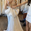 As you glide down the aisle, the lower cut back with train, optional bow, and optional long viel, create an enchanting reveal that draws the eye while maintaining an air of sophistication. The backless design serves to elongate your frame, making every step an unforgettable moment. A beautifully tailored zipper back ensures a seamless fit, allowing you to focus on your special day without a worry.