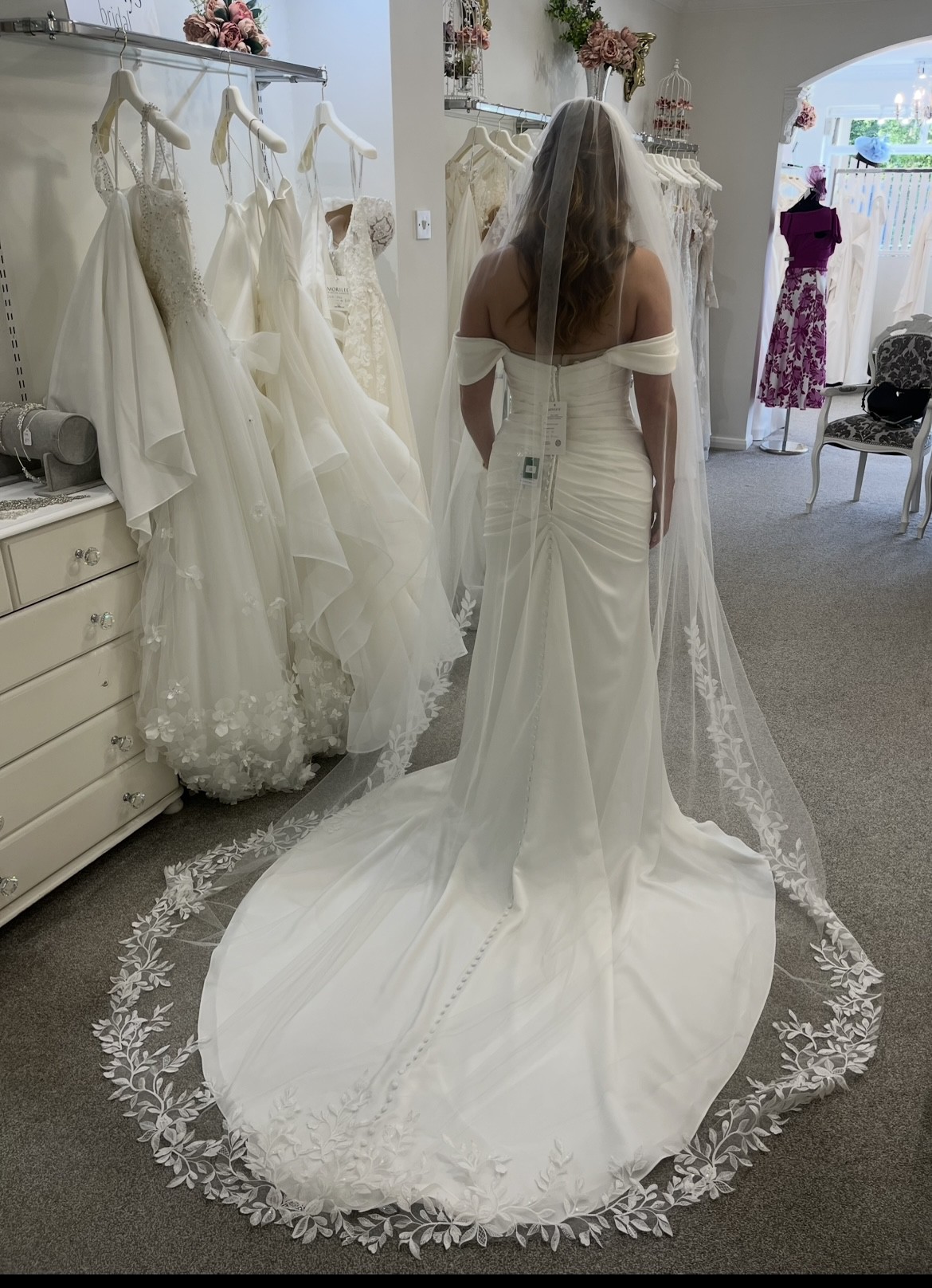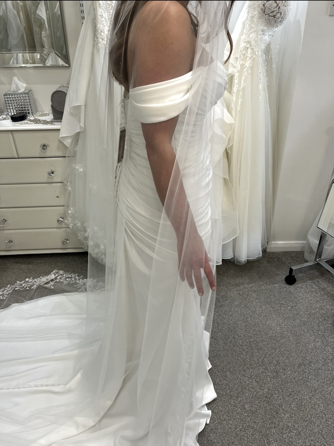 In the images I am wearing a sample size 12. I have not worn or tried on my size 12 that has been ordered and arrived. I no longer need the dress.
