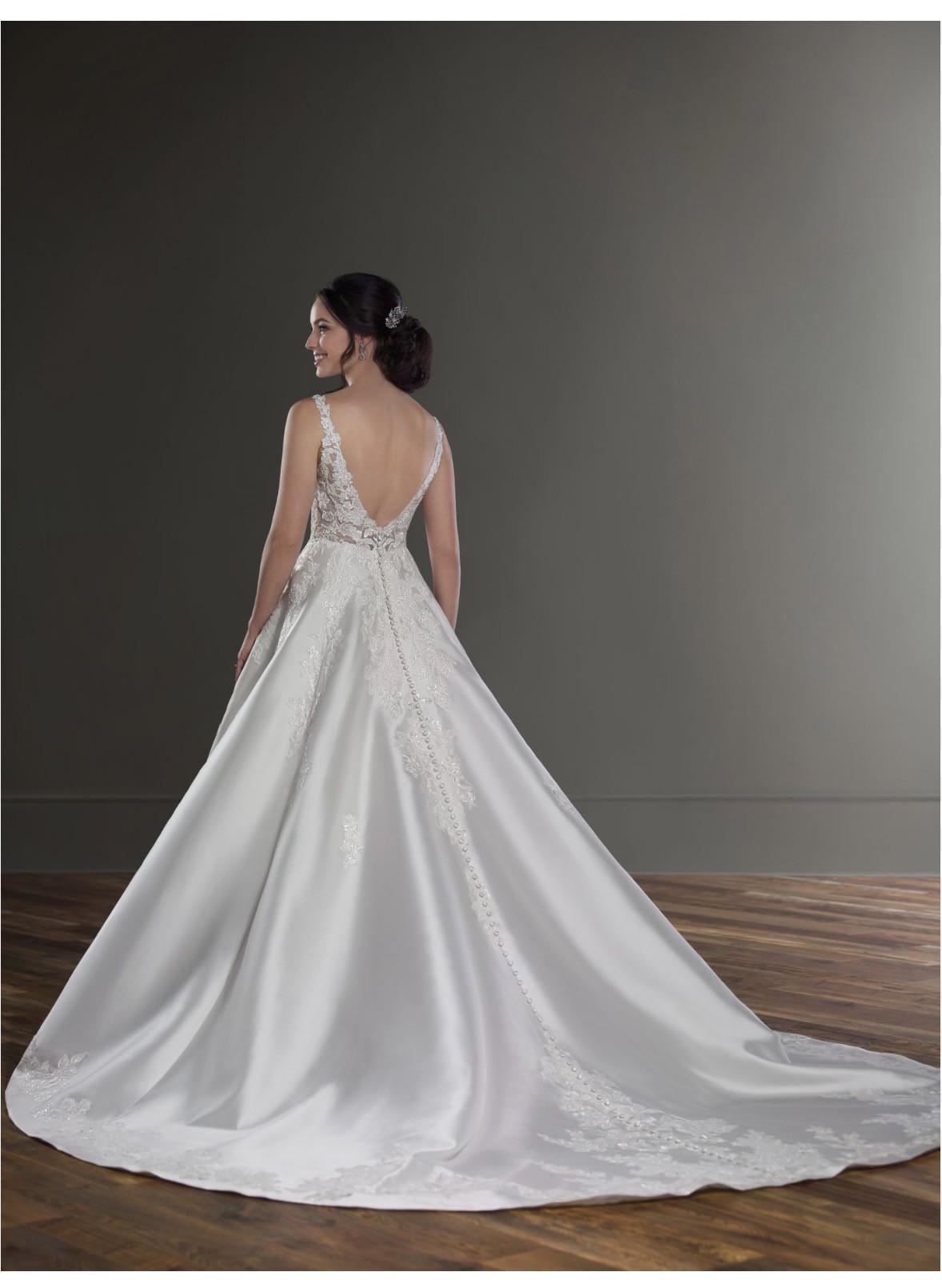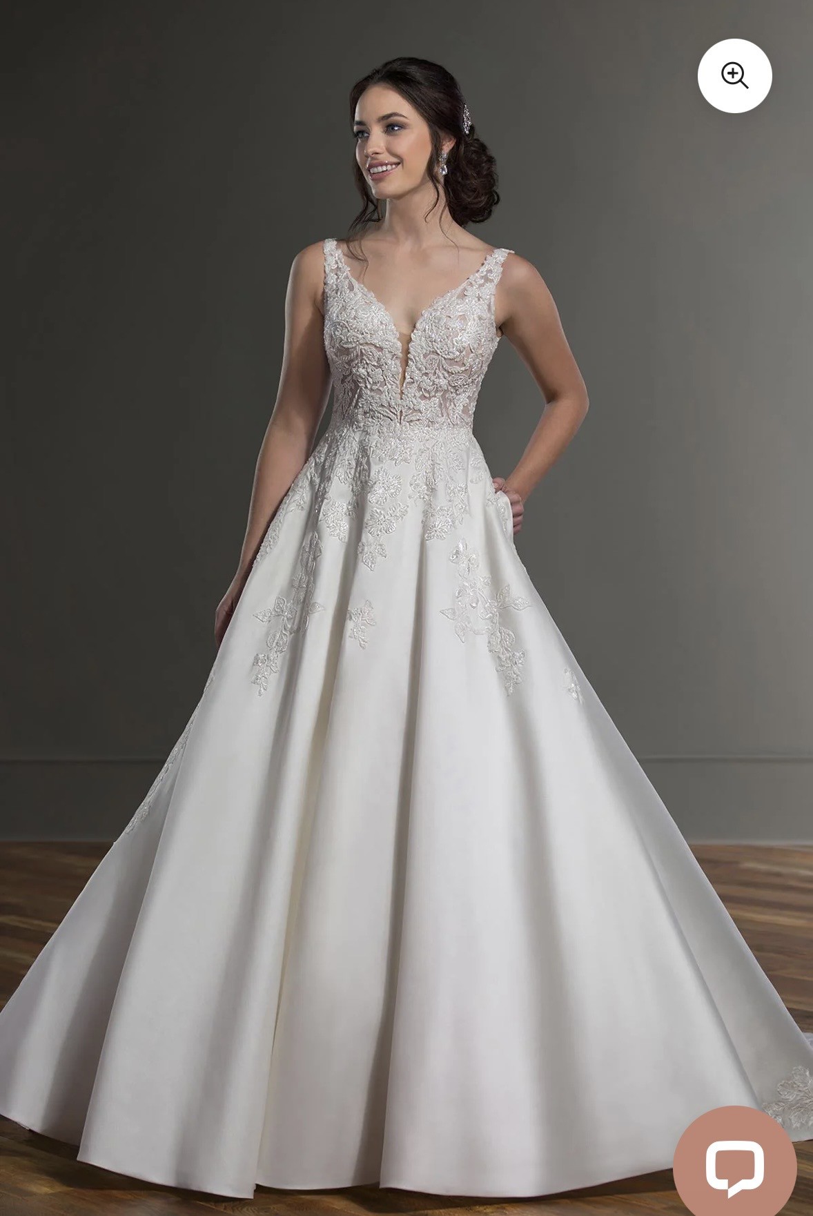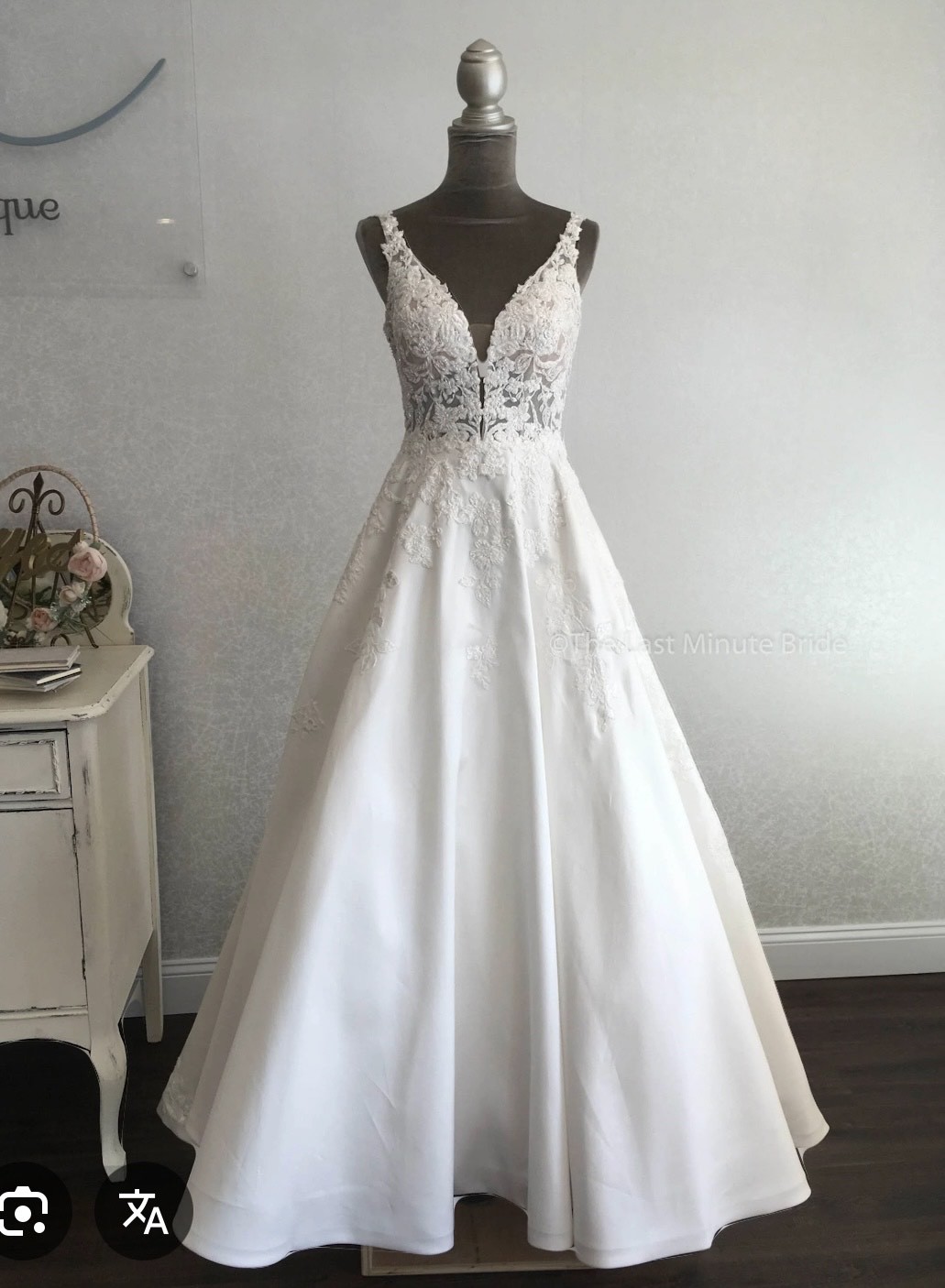 Timeless Elegance – I wore this dress for my wedding in a castle in Ireland. It is a classic Martina Liana wedding gown with formal details, perfect for any black-tie affair. The bodice of this ballgown is sheer, adorned with rich lace and highlighted by a V-neckline in the front and back. From the waist, the silk Zibeline skirt extends to the floor, featuring soft pleats and convenient pockets. It was professionally cleaned by a wedding dress specialist. The dress is a wedding size 20, but I normally wear a size 16. What I loved most was that I didn’t need to wear a bra—the fit was perfect. Because of the full skirt, I also didn’t need shapewear. That alone made it a winner for me: complete comfort.